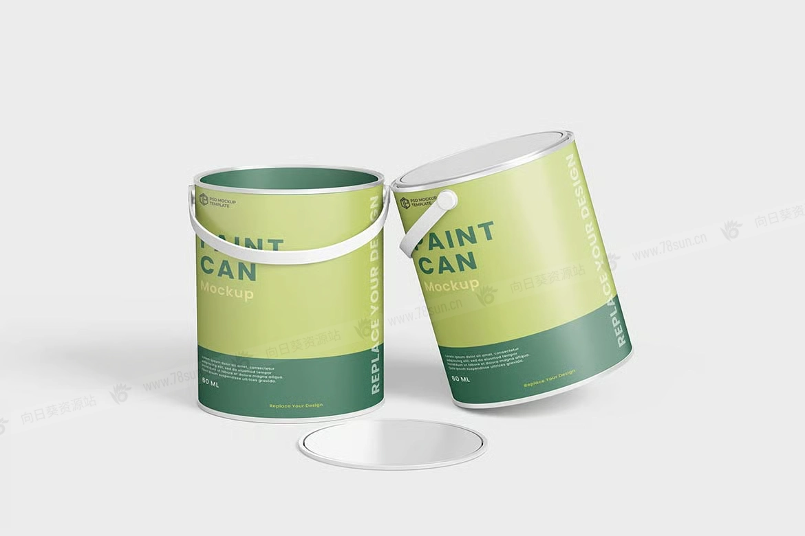 金属油漆桶罐铁桶品牌VI效果图展示智能贴图psd设计样机!只需用Photoshop的智能对象一键放置你的设计即可。就是这么简单!