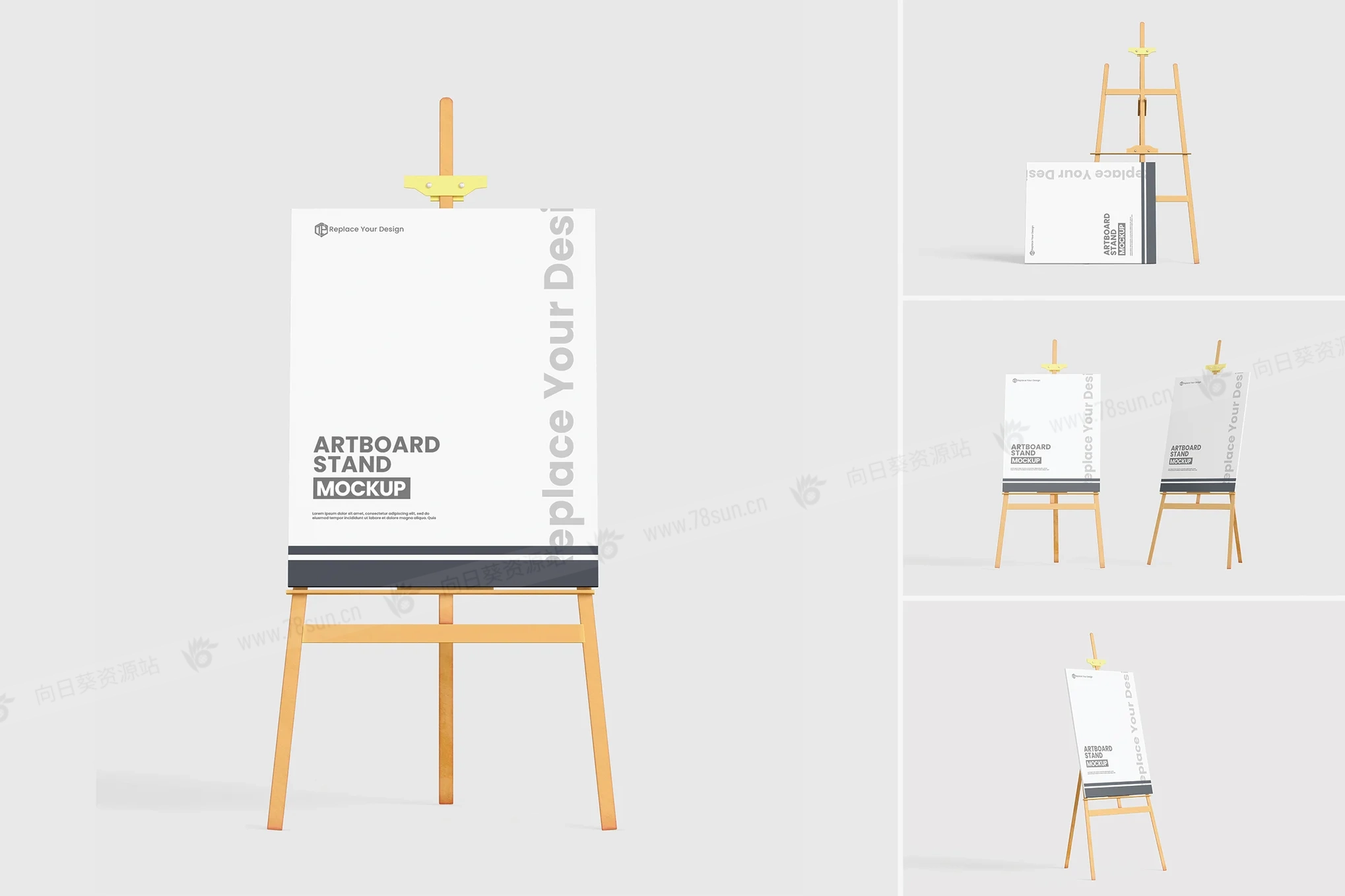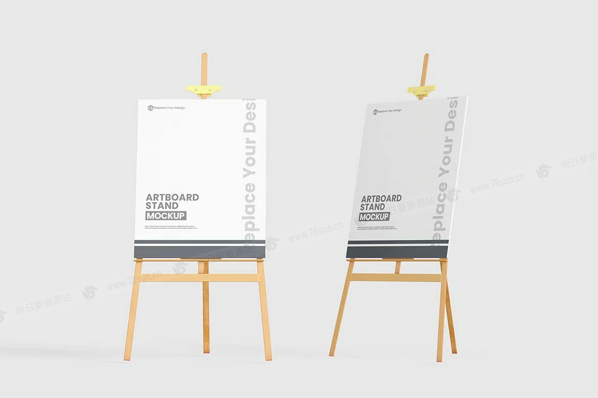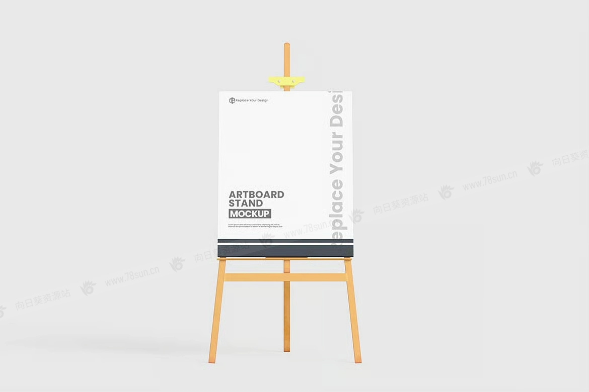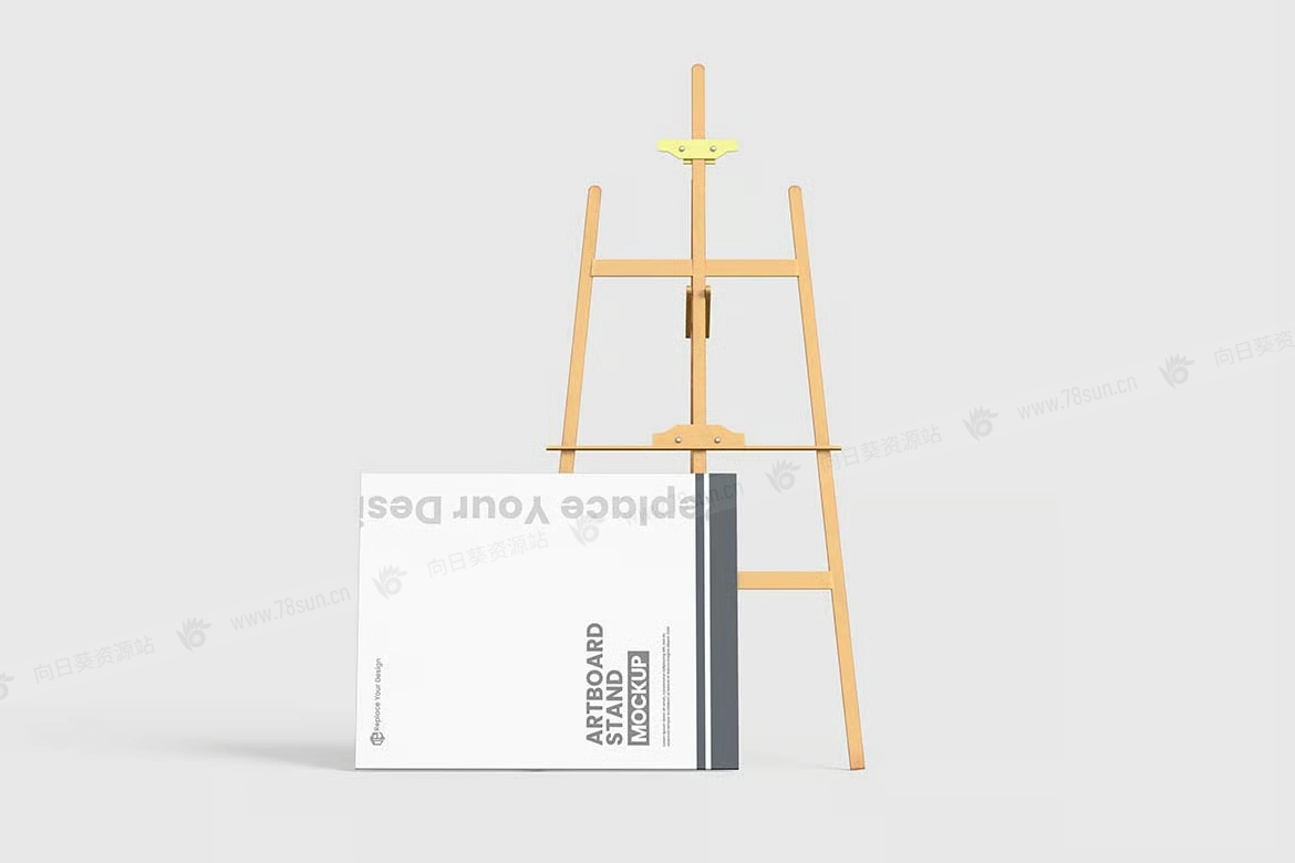 木制画架海报品牌VI效果图展示智能贴图psd设计样机!只需用Photoshop的智能对象一键放置你的设计即可。就是这么简单!