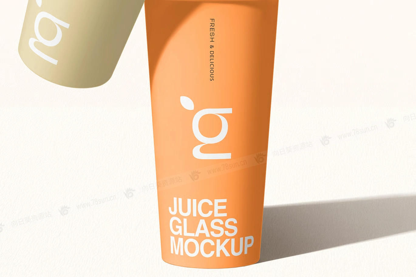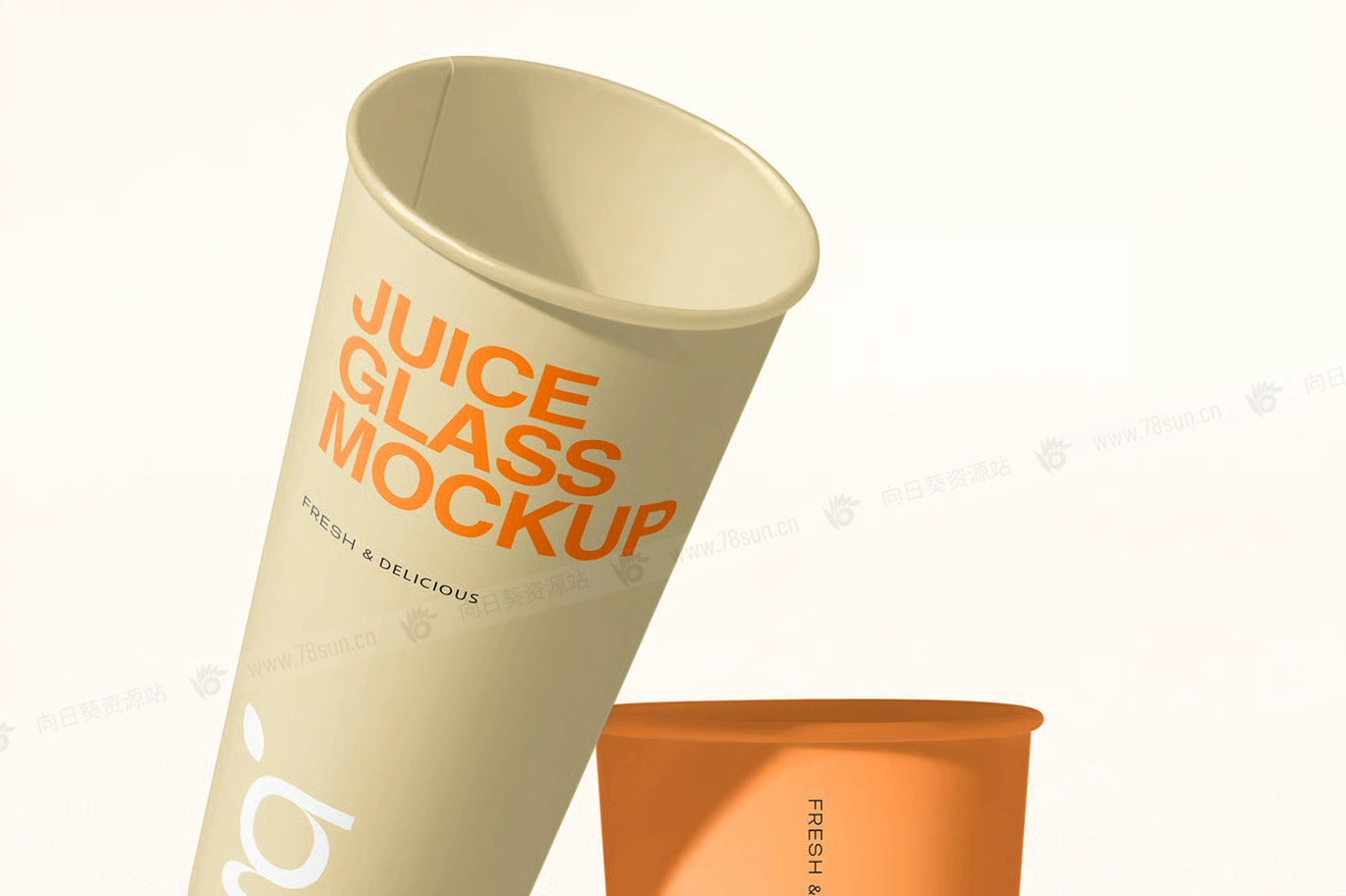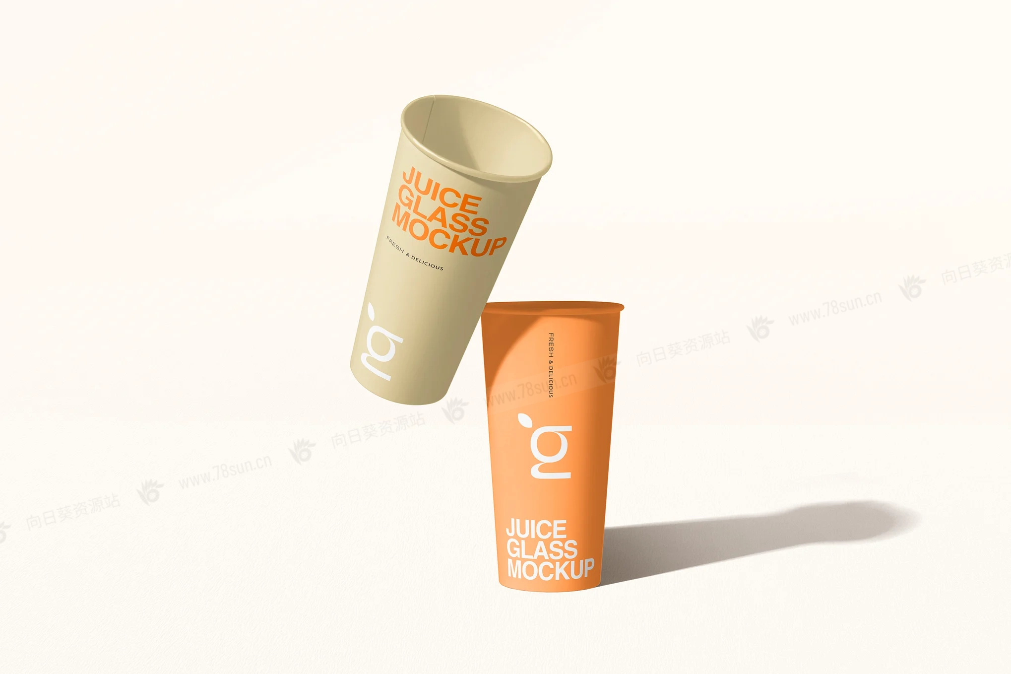 纸杯果汁杯品牌VI效果图展示智能贴图psd设计样机。这款果汁杯样图提供了逼真的反光和质感,增强了设计的真实感。