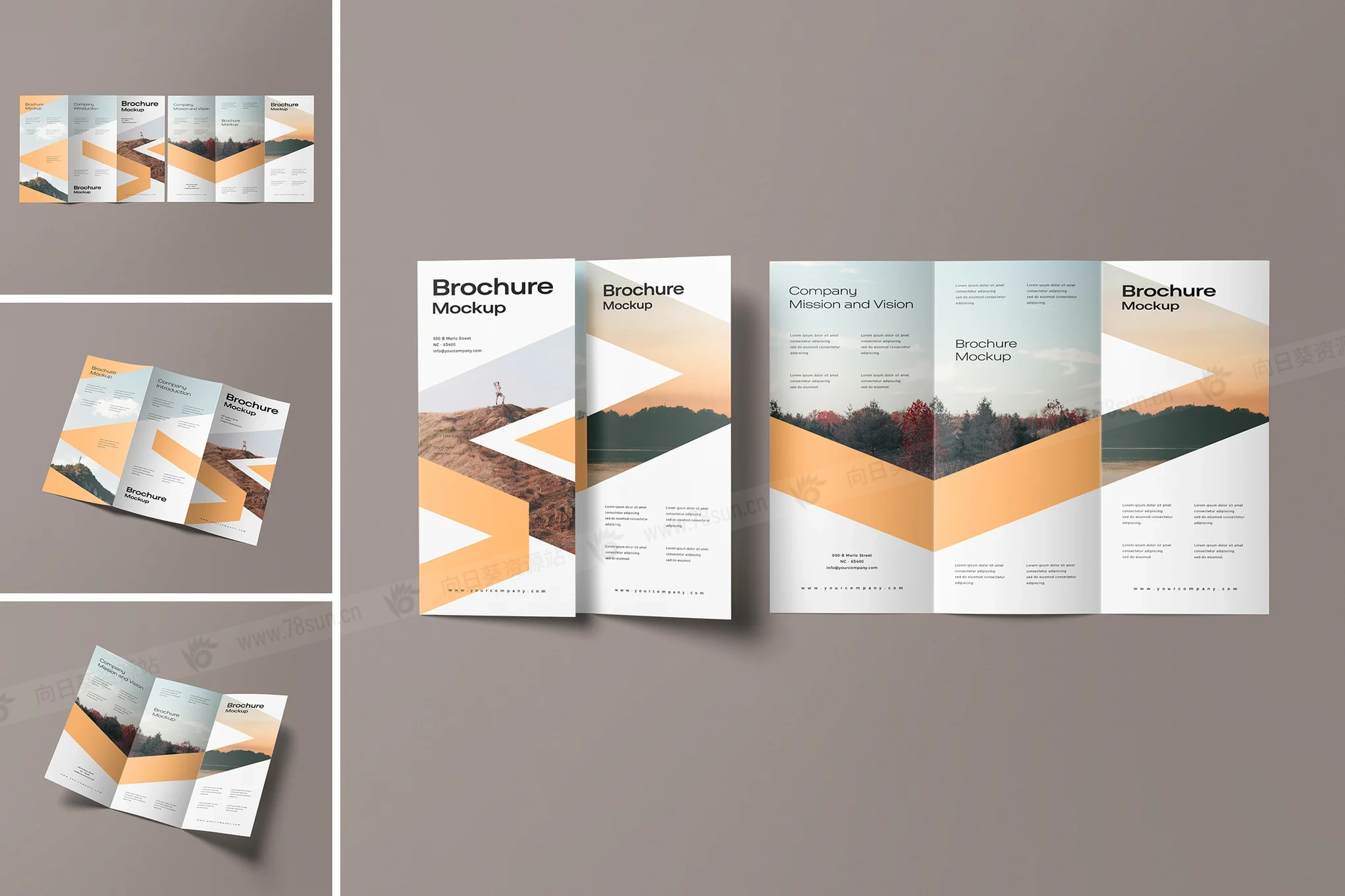 三折页产品宣传小册子品牌VI效果图展示智能贴图psd设计样机。这份三折小册子模型采用逼真的折痕、阴影和透视效果,帮助你的设计看起来精致且适合印刷。