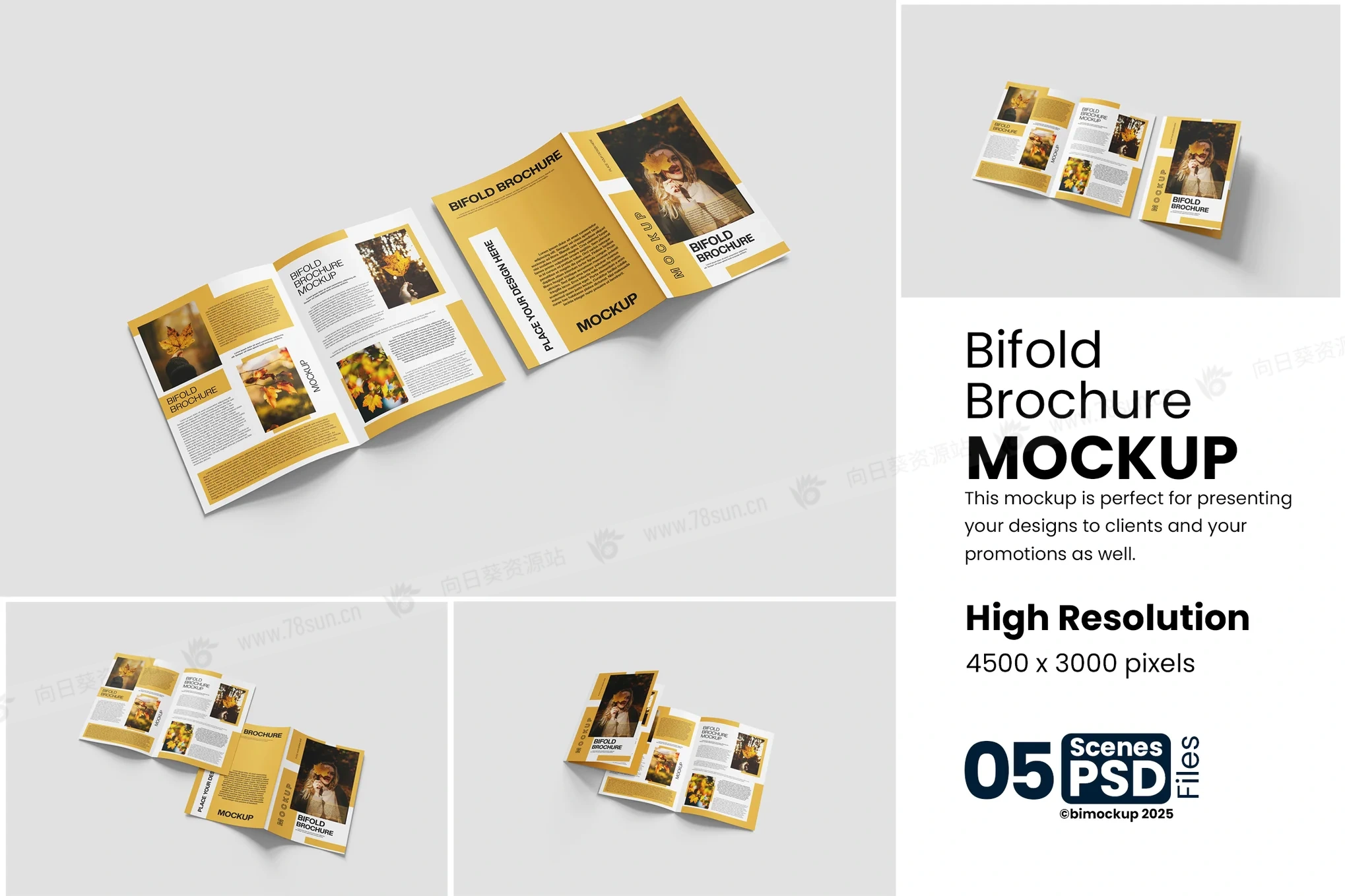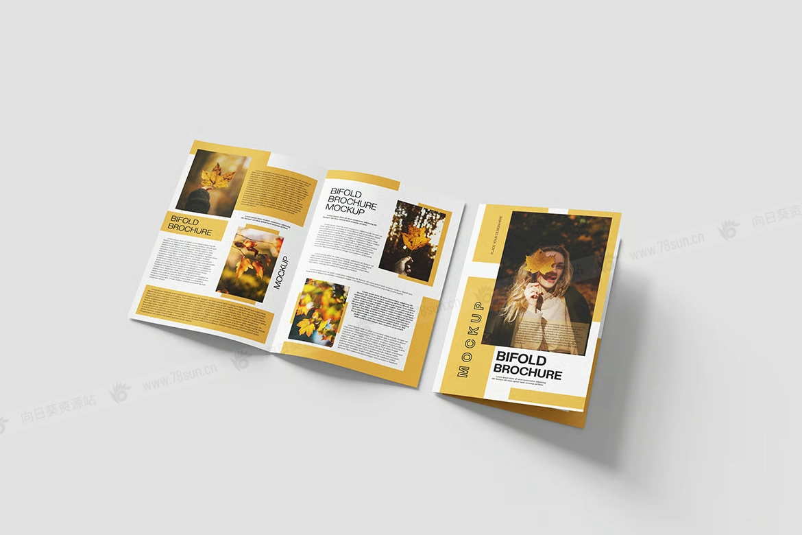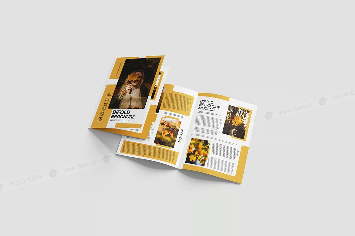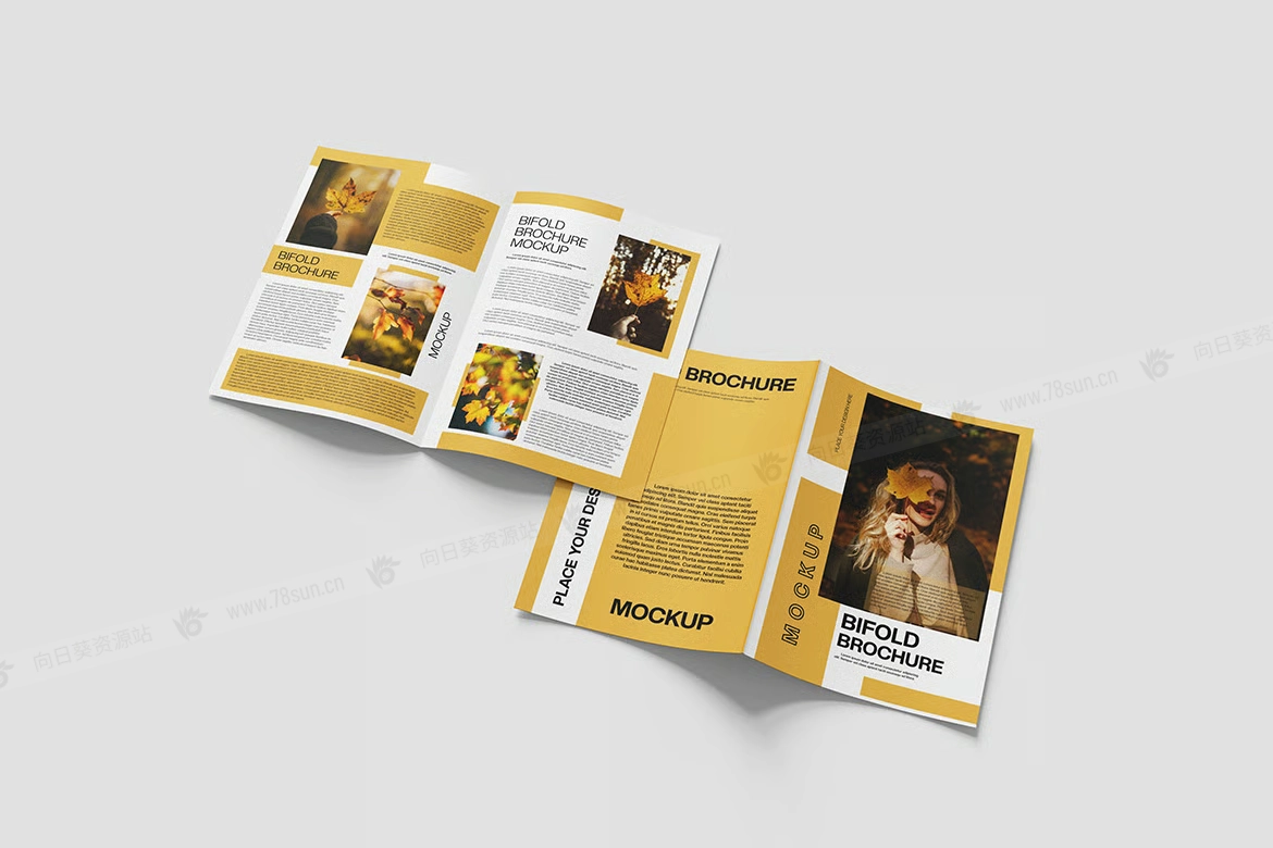 双折页宣传册小册子品牌VI效果图展示智能贴图psd设计样机。你可以用智能物体功能轻松快速地替换设计。提供PSD Photoshop格式,并具备智能对象功能,帮助你在几秒钟内用自己的设计替换现有设计。