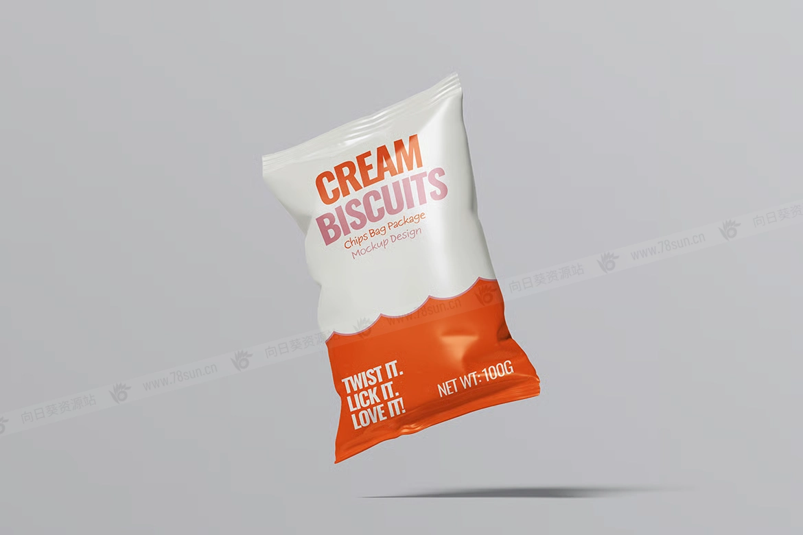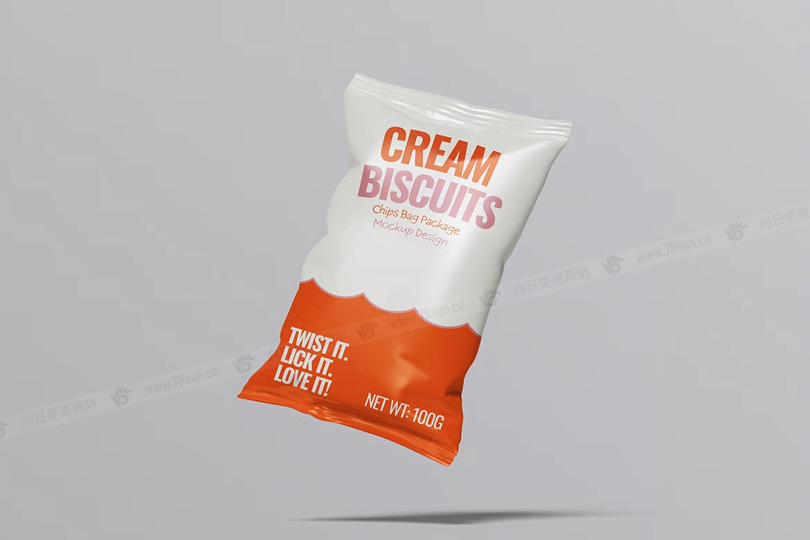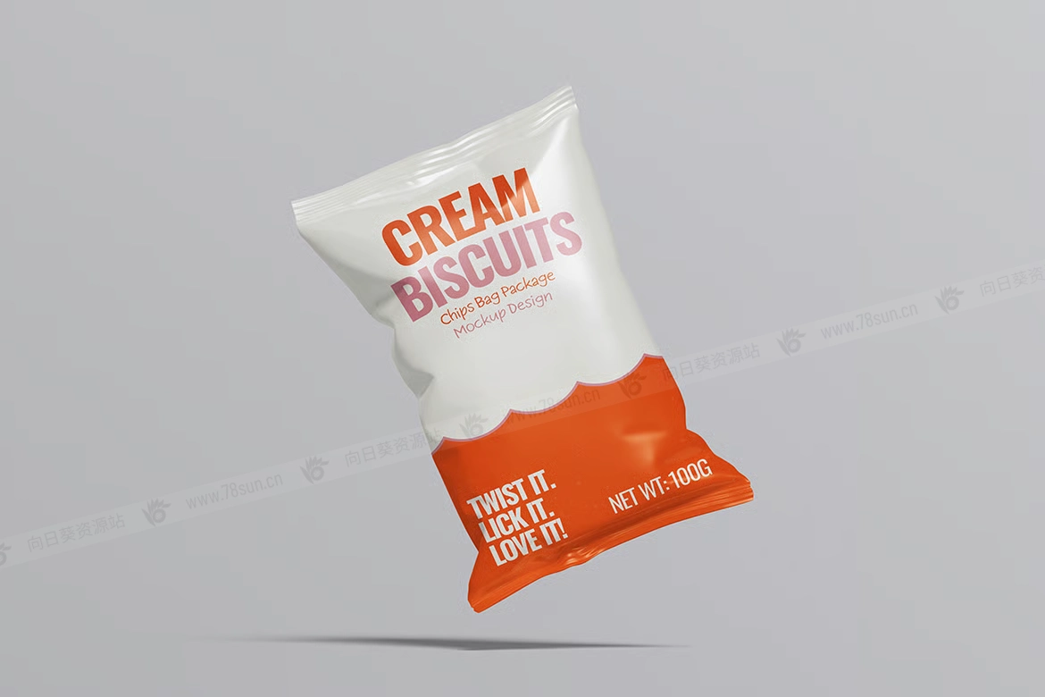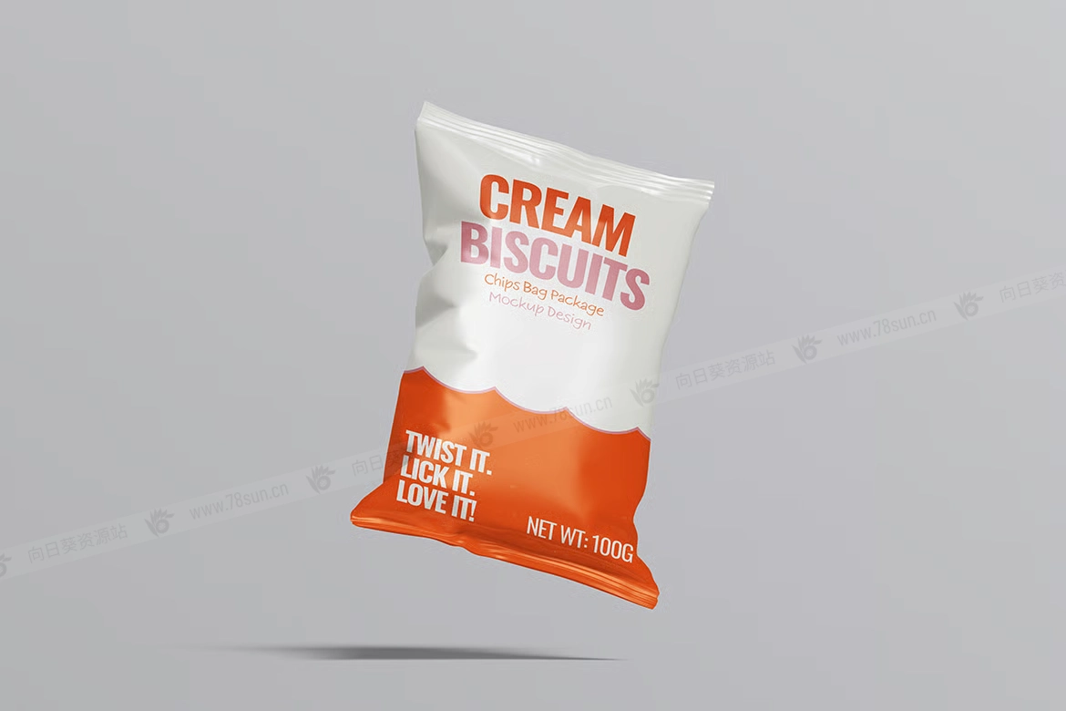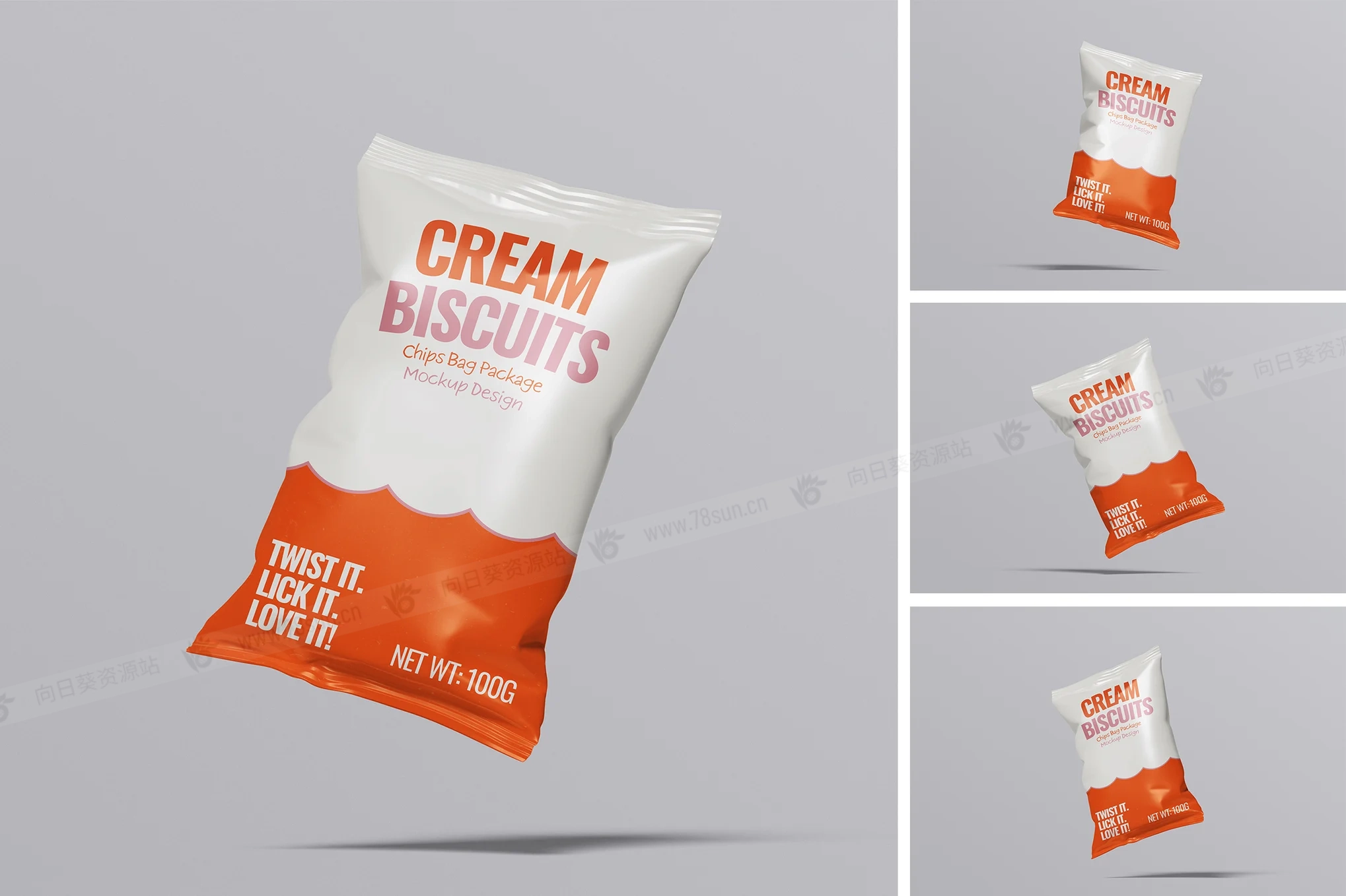 零食薯片膨化食品包装袋品牌VI效果图展示智能贴图psd设计样机,这个模型包含4个带有分层良好的PSD文件的物品,并且还采用了智能对象功能,这意味着你可以在几秒钟内轻松快速地用自己的设计替换当前设计。