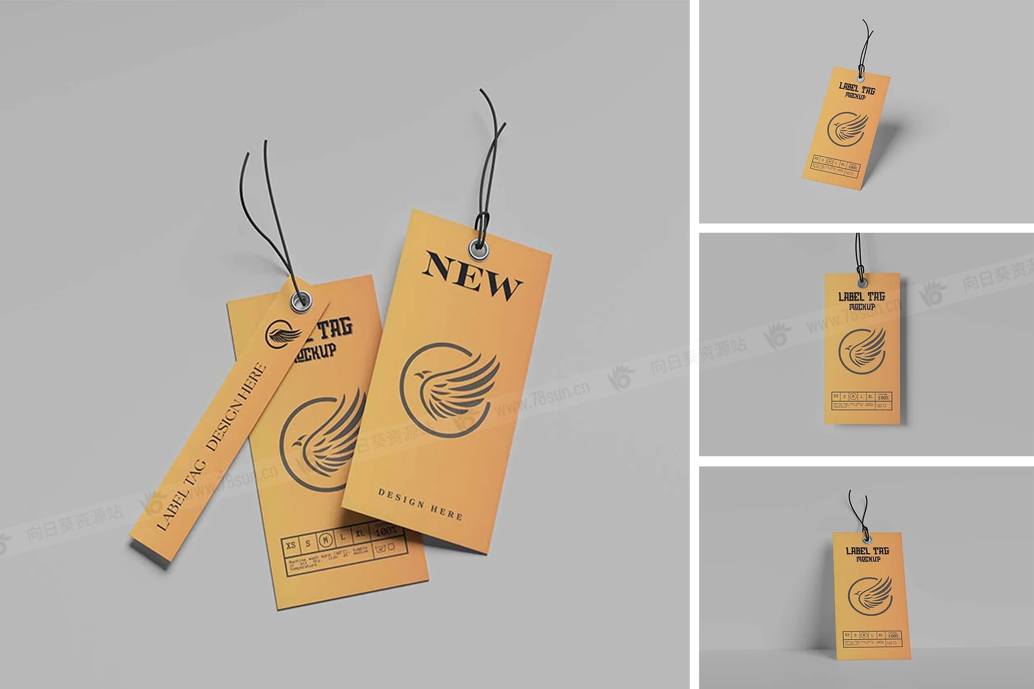 服装价格吊牌标签品牌VI效果图展示智能贴图psd设计样机。这个模型包含4个带有分层良好的PSD文件的物品,并且还采用了智能对象功能,这意味着你可以在几秒钟内轻松快速地用自己的设计替换当前设计。
