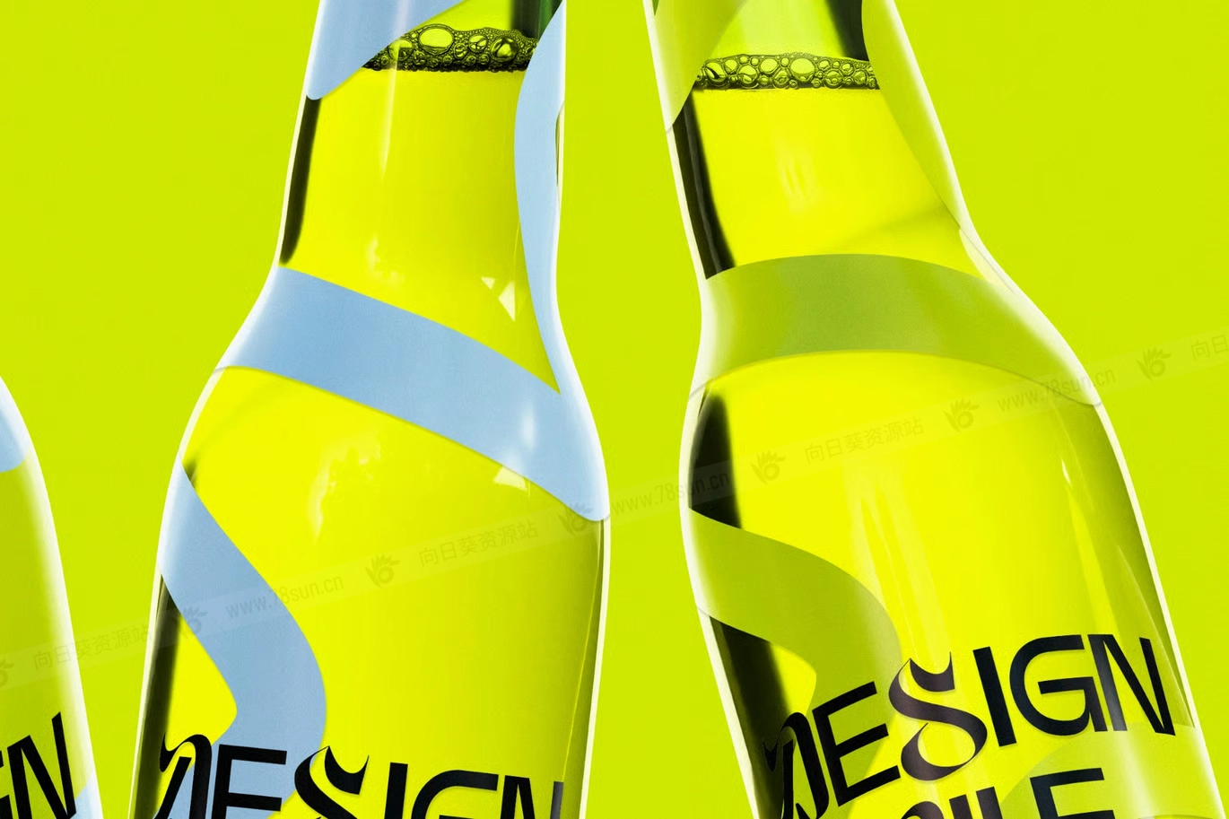 汽水啤酒瓶玻璃瓶品牌VI效果图展示智能贴图psd设计样机——分层、可编辑的.psd文件,通过编辑智能对象和颜色图层展示您的自定义设计。