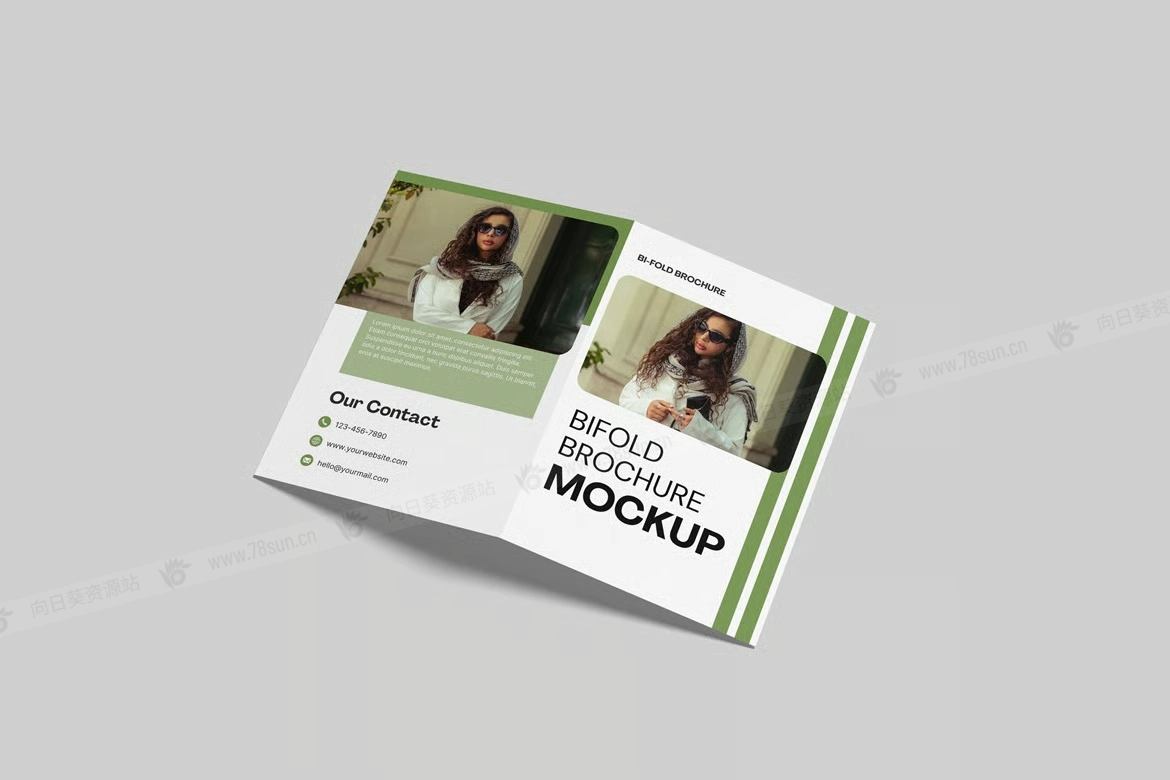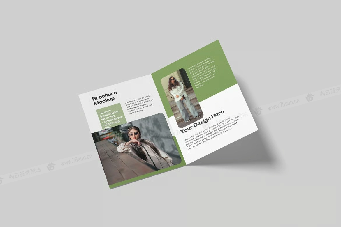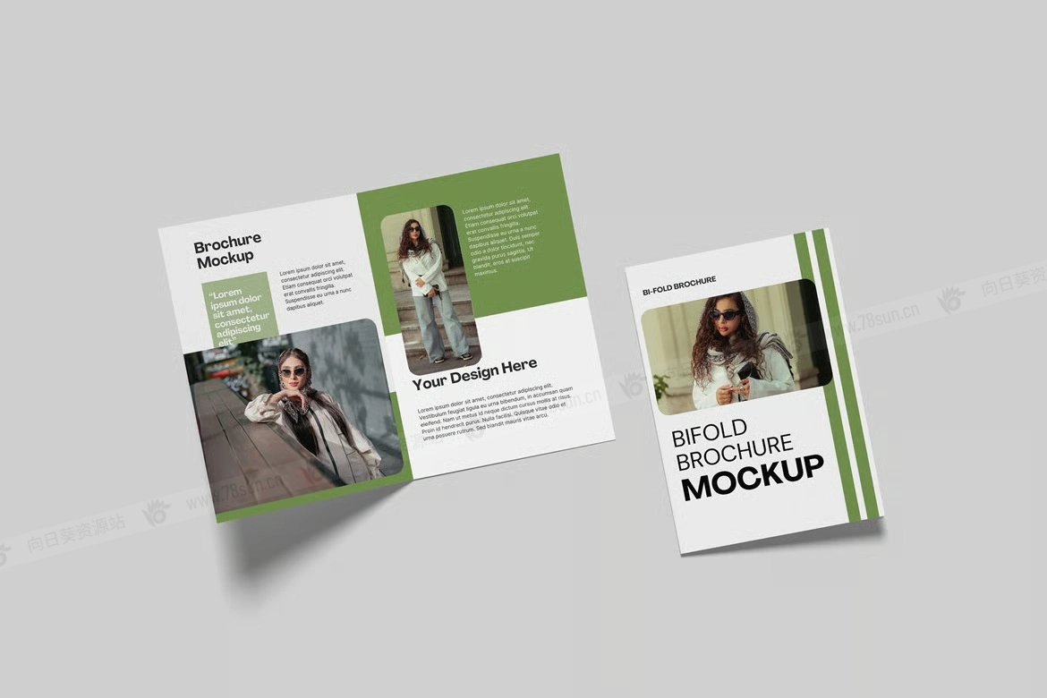 高质量双折页宣传册小册子品牌VI效果图展示智能贴图psd设计样机。这个模型文件使用了智能对象功能,帮助你在几秒钟内更改设计(包含帮助文件)。