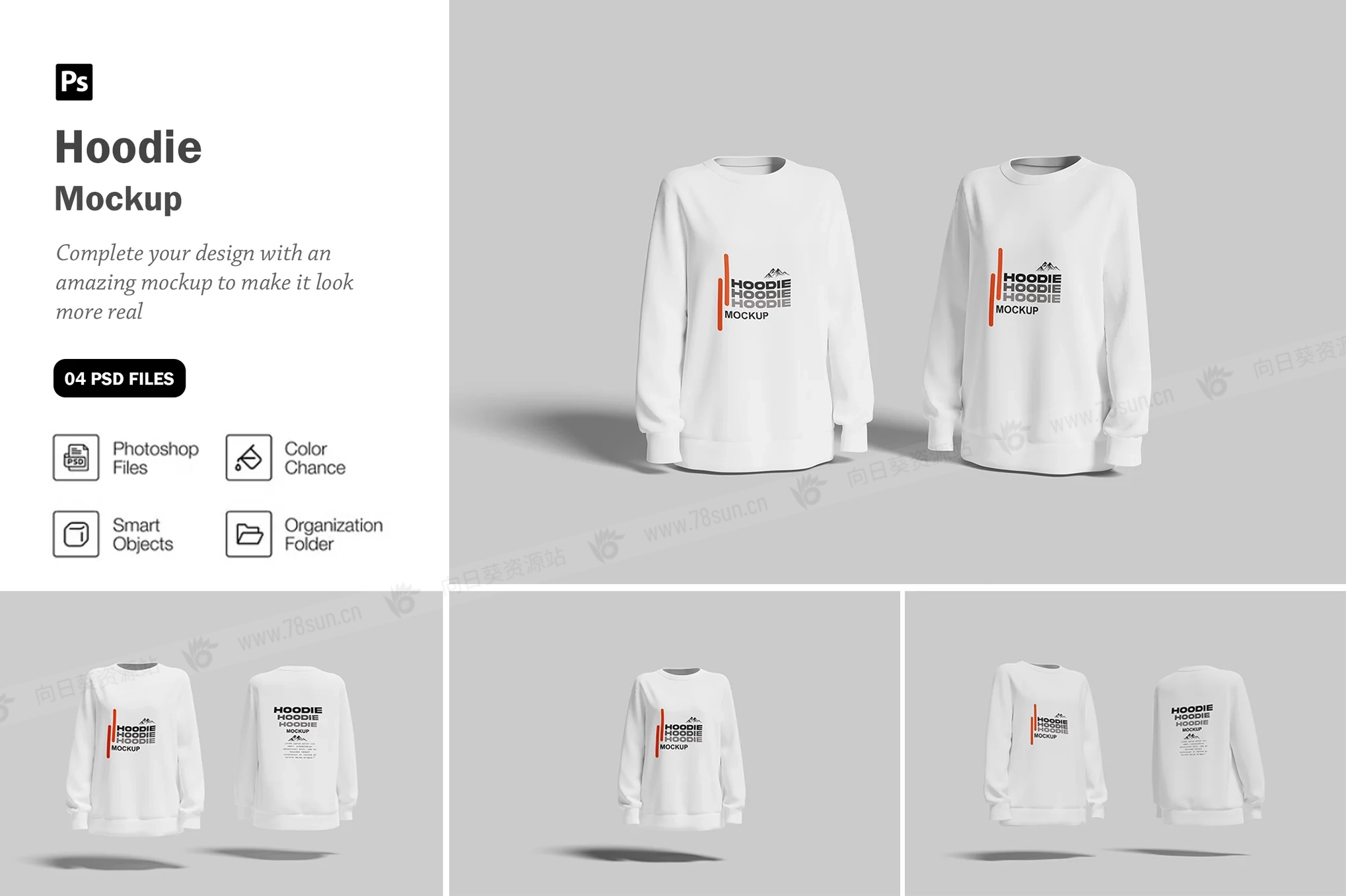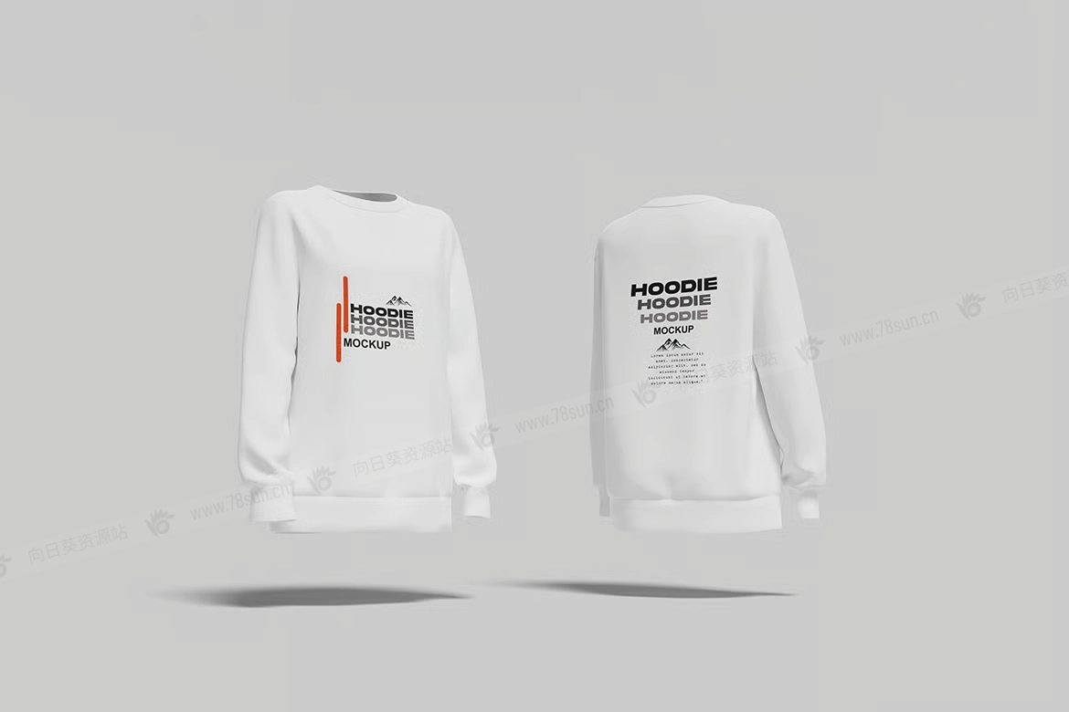 长袖T恤圆领卫衣服装品牌VI效果图展示智能贴图psd设计样机。这个模型包含4个带有分层良好的PSD文件的物品,并且还采用了智能对象功能,这意味着你可以在几秒钟内轻松快速地用自己的设计替换当前设计。