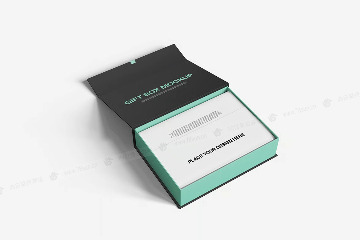 磁吸翻盖礼品盒品牌VI效果图展示智能贴图psd设计样机。你可以用智能物体功能轻松快速地替换设计。提供PSD Photoshop格式,并具备智能对象功能,帮助你在几秒钟内用自己的设计替换现有设计。