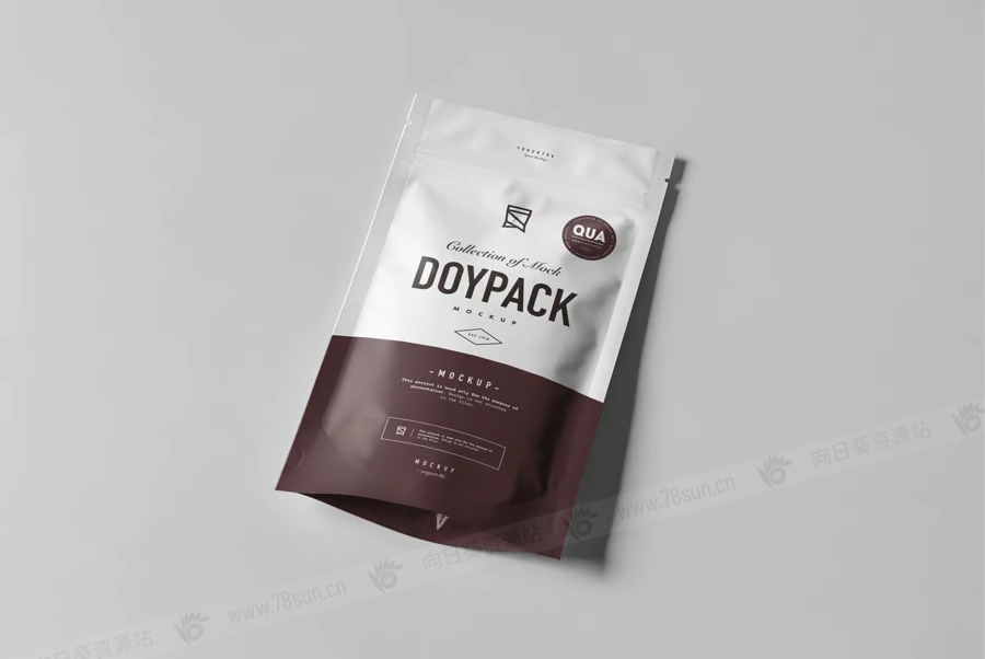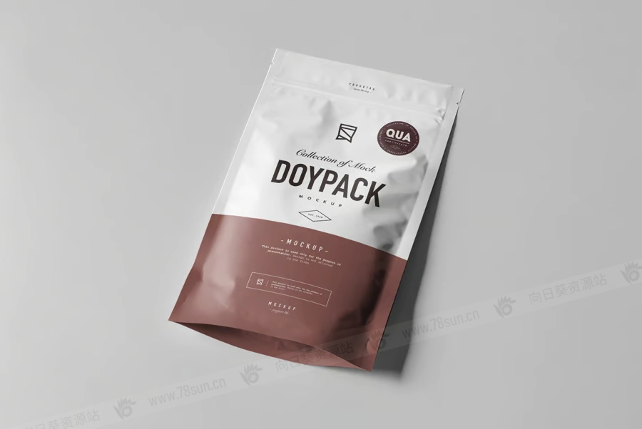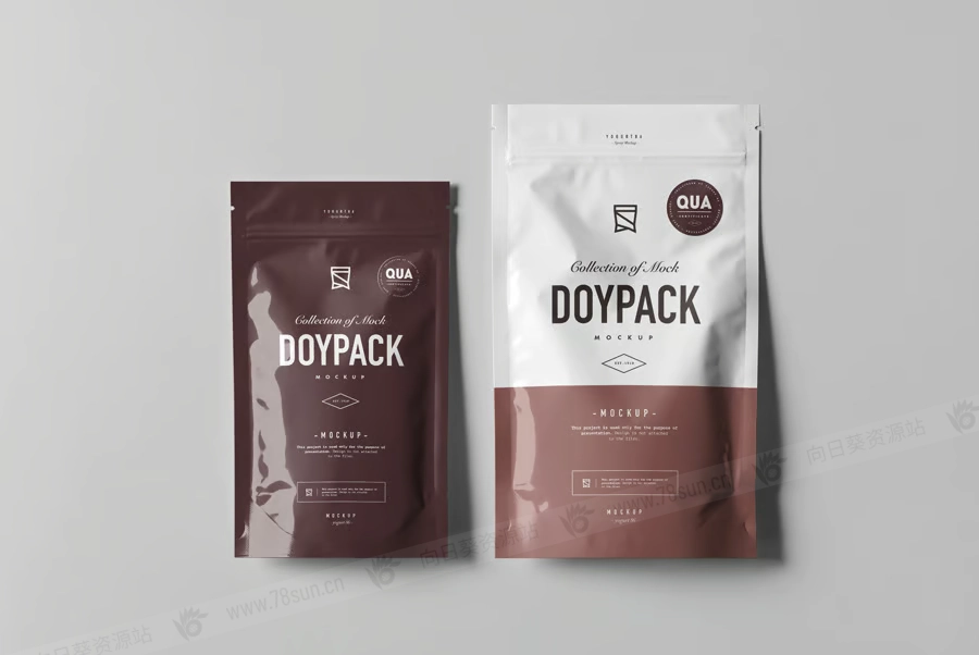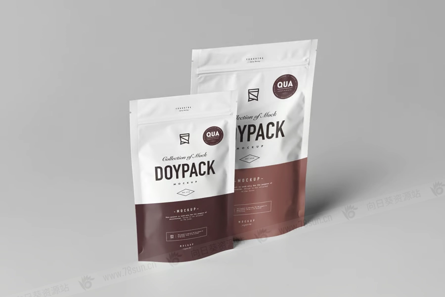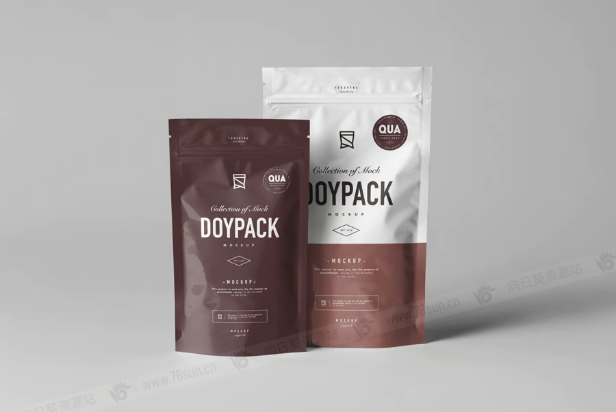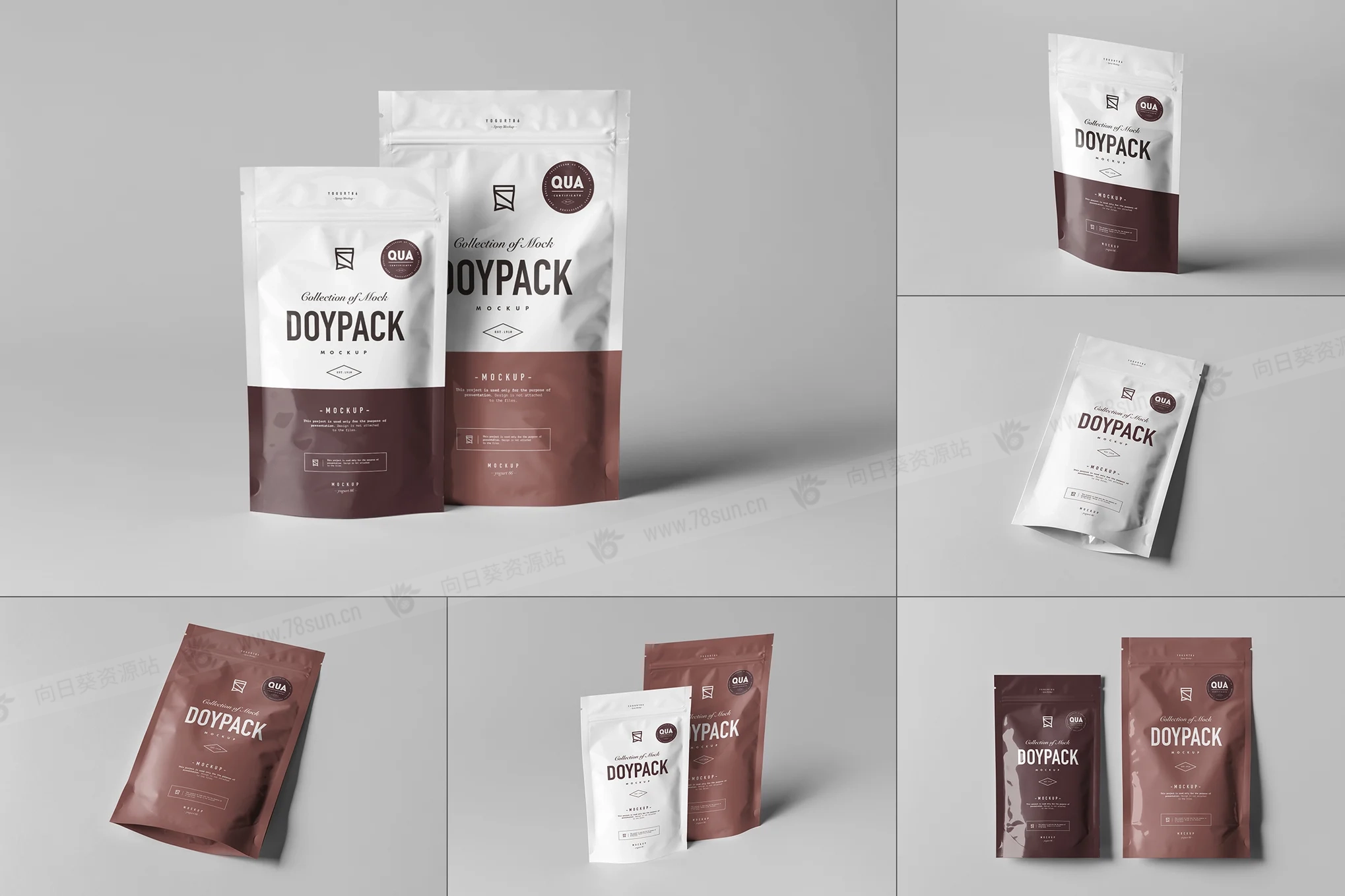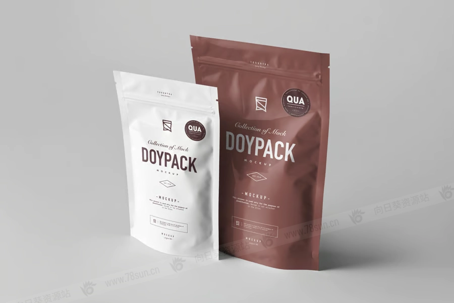 站立式拉链锁袋小袋品牌VI效果图展示智能贴图psd设计样机,高级且易于编辑的模型。展示了两个不同尺寸的带顶夹式铝箔包。可视化包括不同的角度和视角——正面、侧面和斜视,