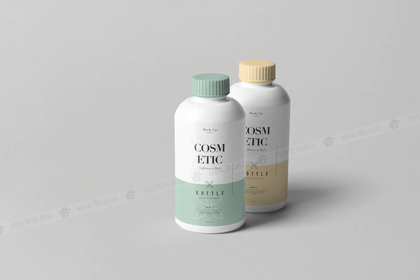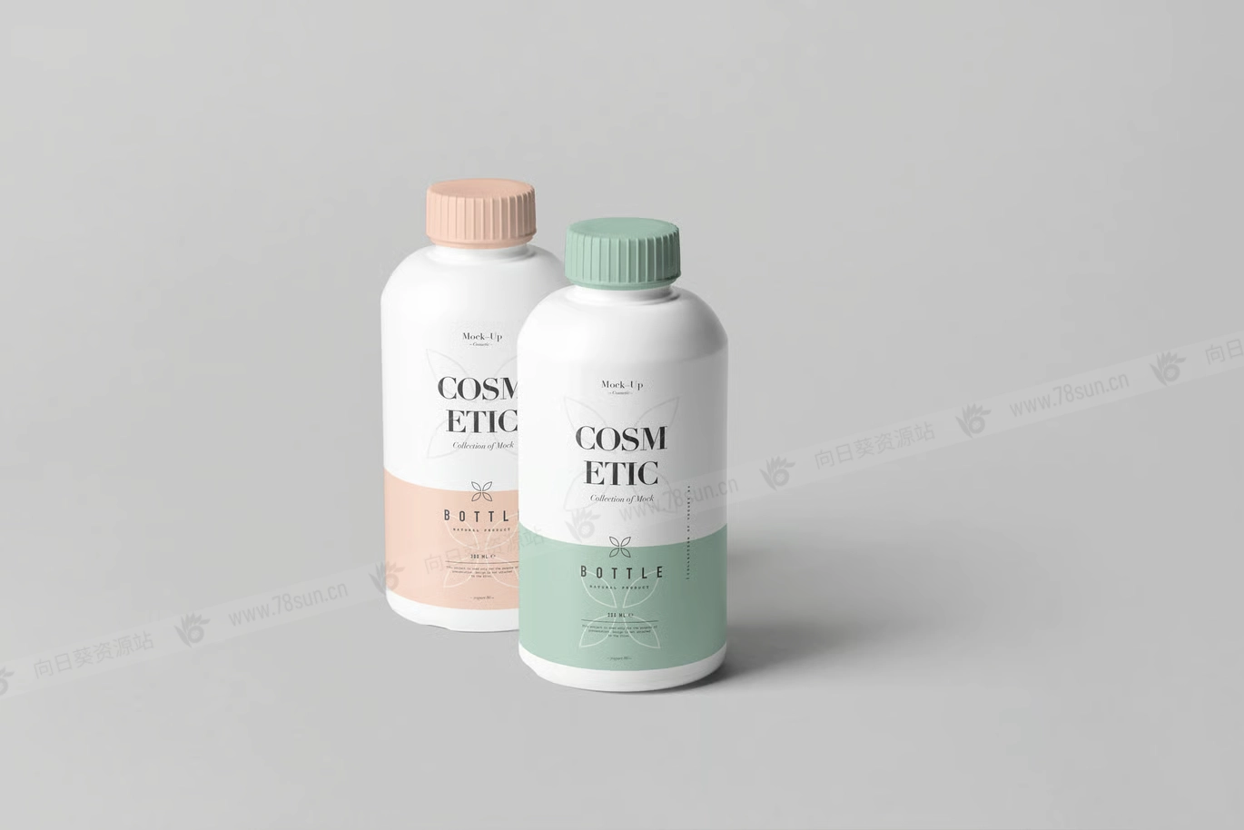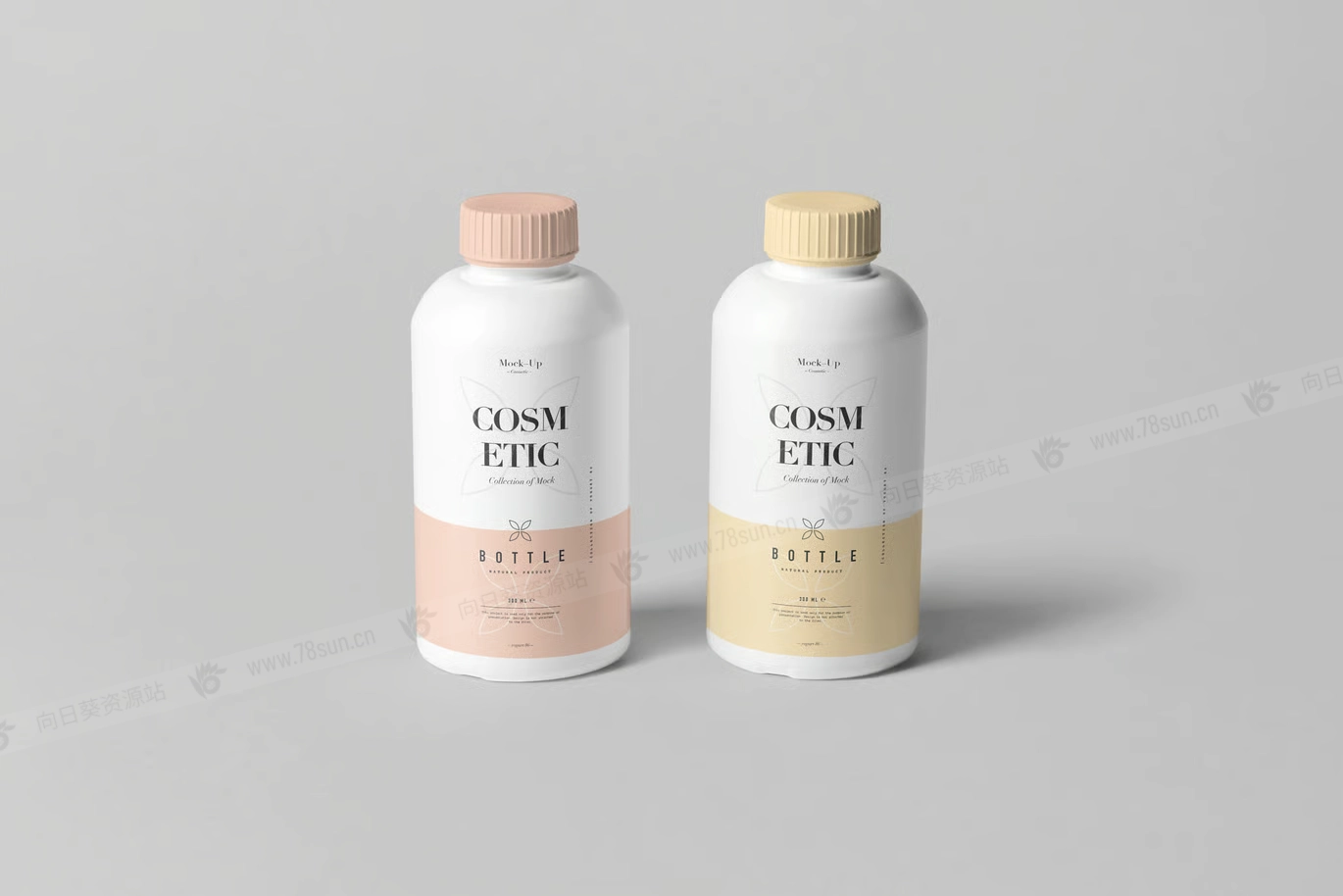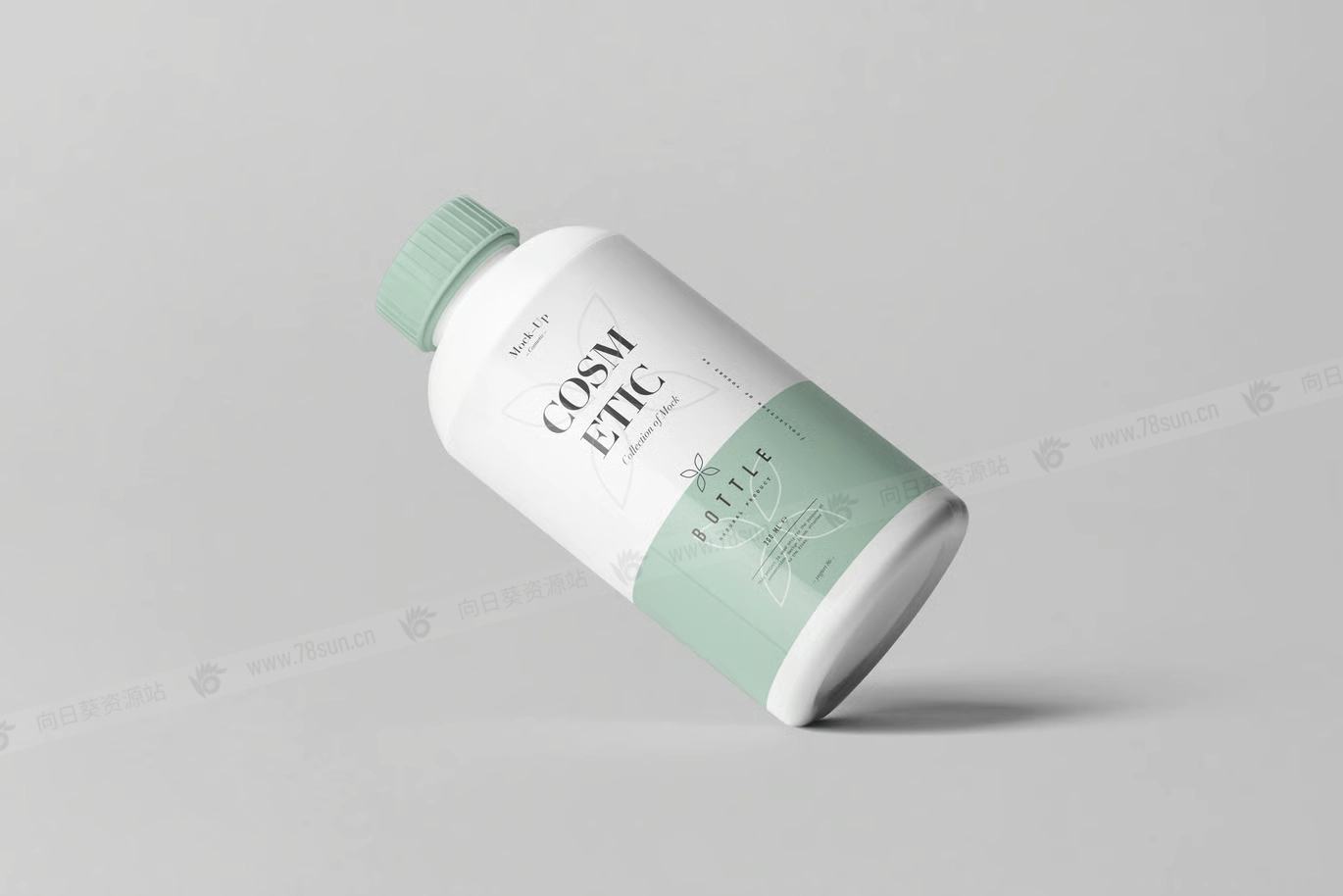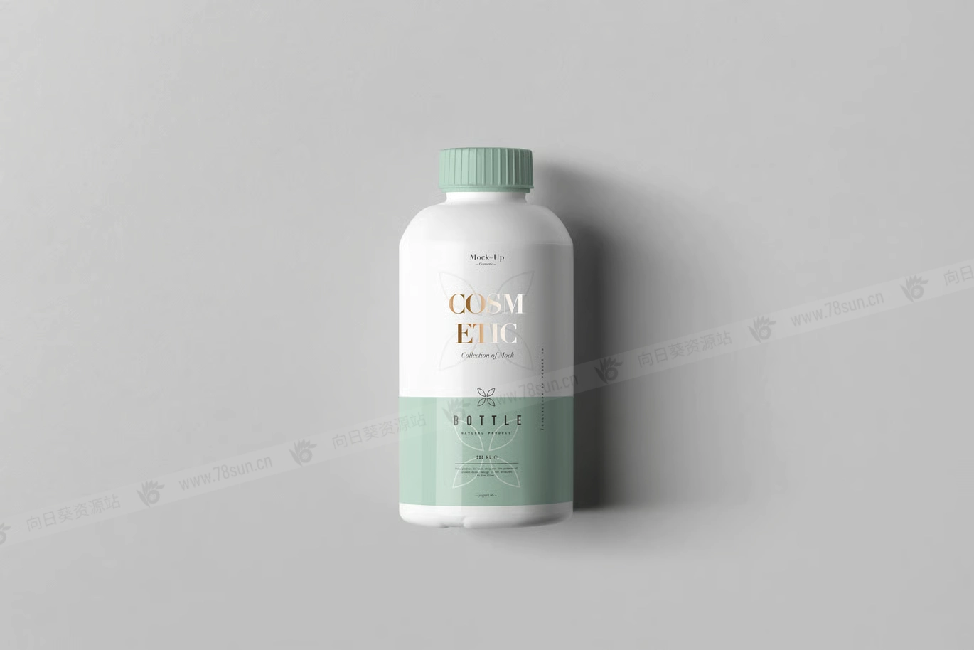 药瓶塑料瓶品牌VI效果图展示智能贴图psd设计样机,高级且易于编辑的模型。它包含了你打造项目真实外观所需的一切。模型展示了一个带盖的塑料瓶,非常适合展示膳食补充剂、药瓶、化妆品和健康产品的包装设计。