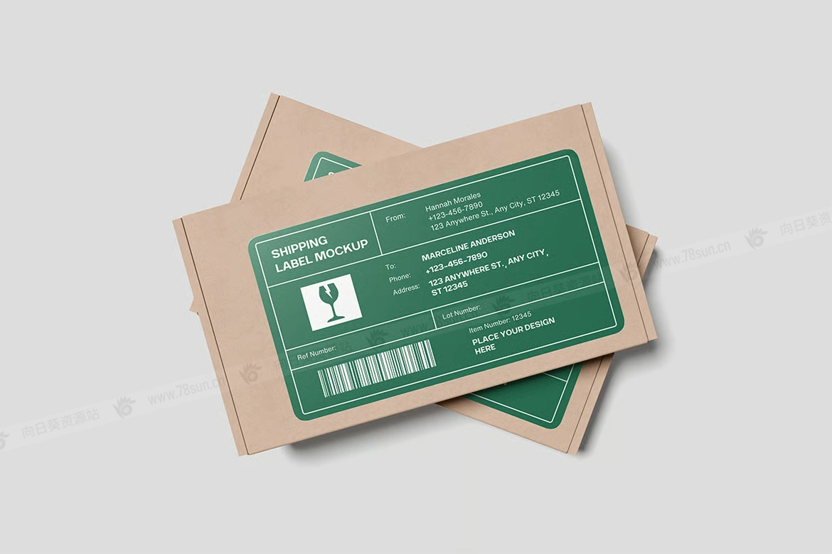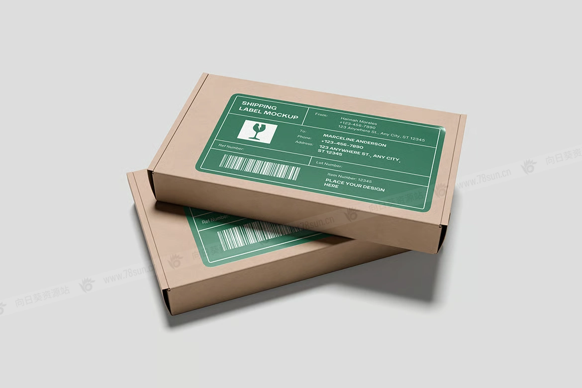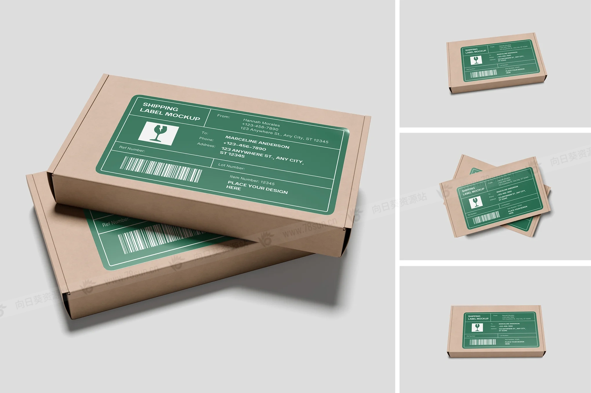 快递包装纸盒品牌VI效果图展示智能贴图psd设计样机,这个模型包含4个带有分层良好的PSD文件,并且还采用了智能对象功能,这意味着你可以在几秒钟内轻松快速地用自己的设计替换当前设计。