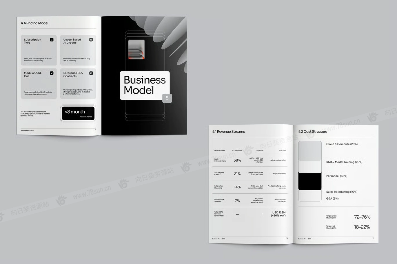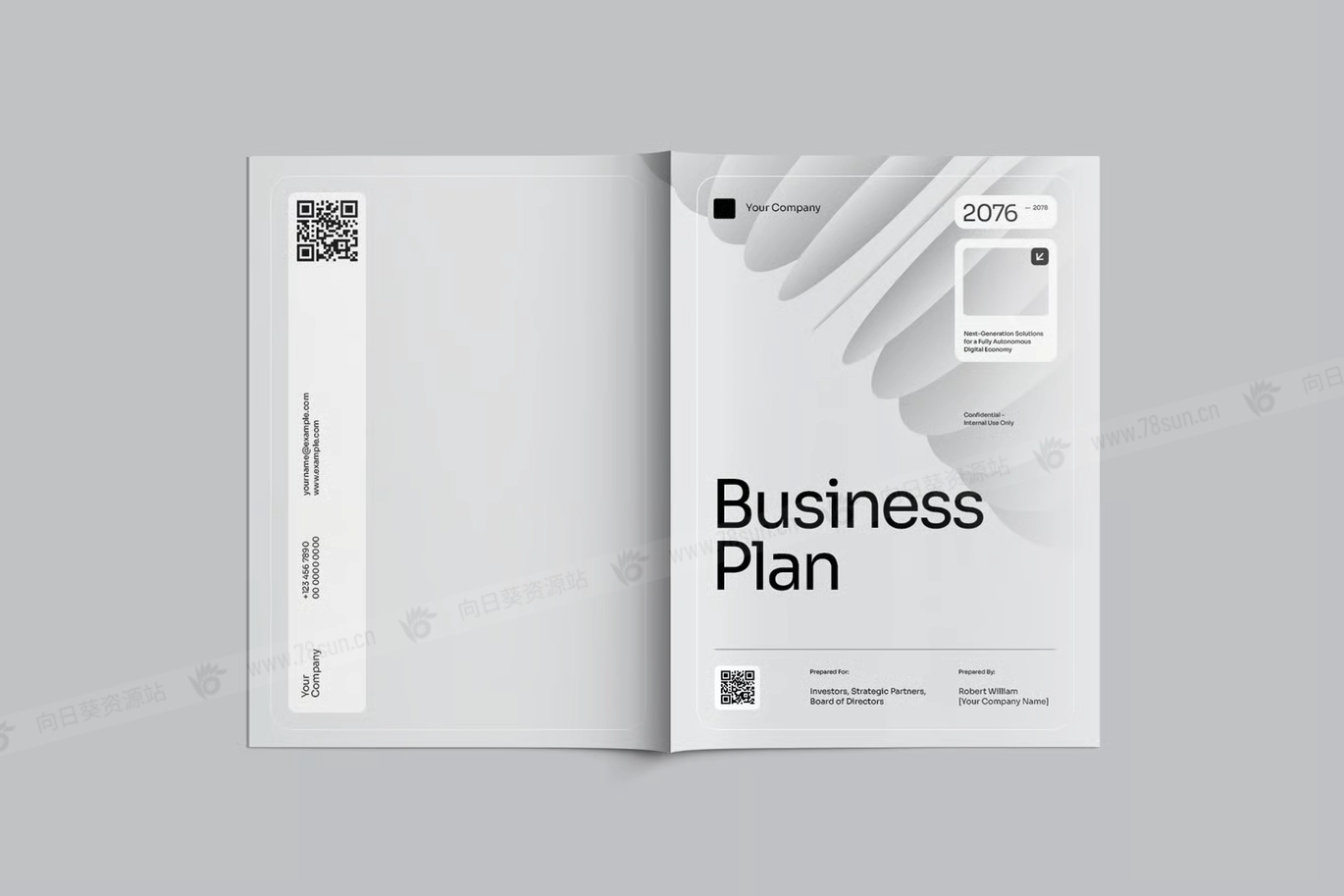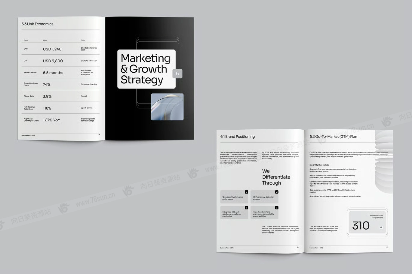 商业计划书品牌推广小册子杂志宣传册画册docx indd pdf设计模板,该商业计划模板结合极简风格、渐变色调、几何布局和未来科技美学,打造简洁、UI驱动的企业形象。该平台面向初创企业、SaaS和人工智能公司,