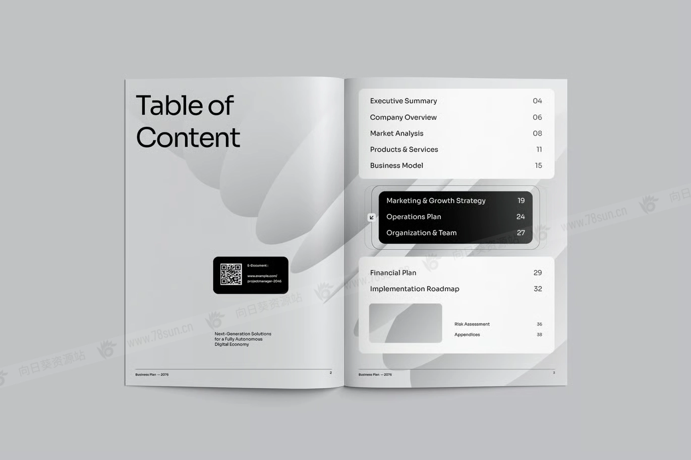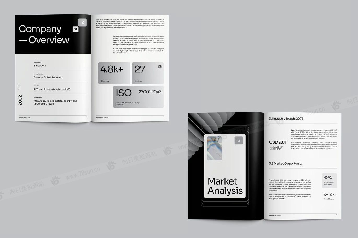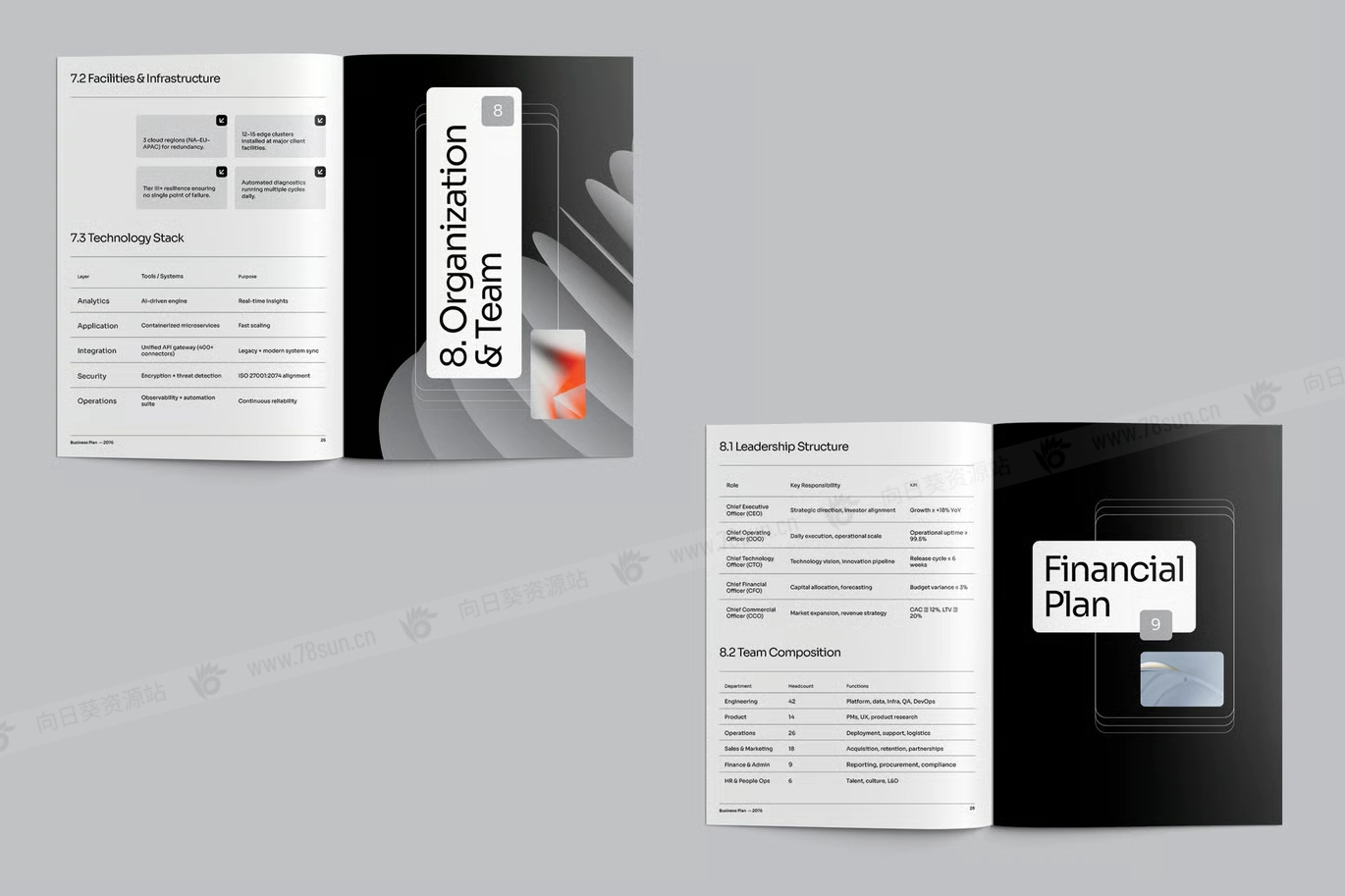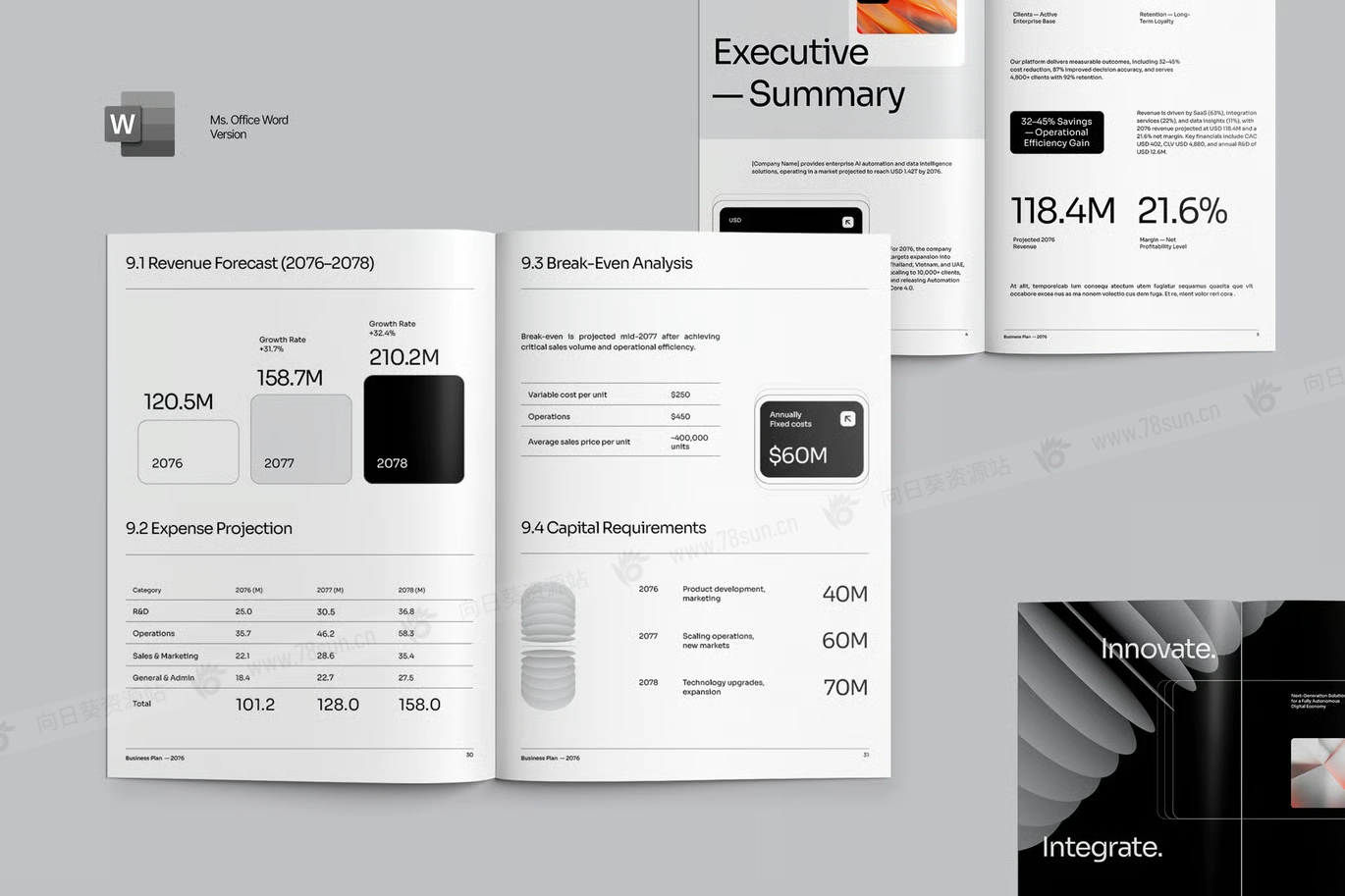 商业计划书品牌推广小册子杂志宣传册画册docx indd pdf设计模板,该商业计划模板结合极简风格、渐变色调、几何布局和未来科技美学,打造简洁、UI驱动的企业形象。该平台面向初创企业、SaaS和人工智能公司,