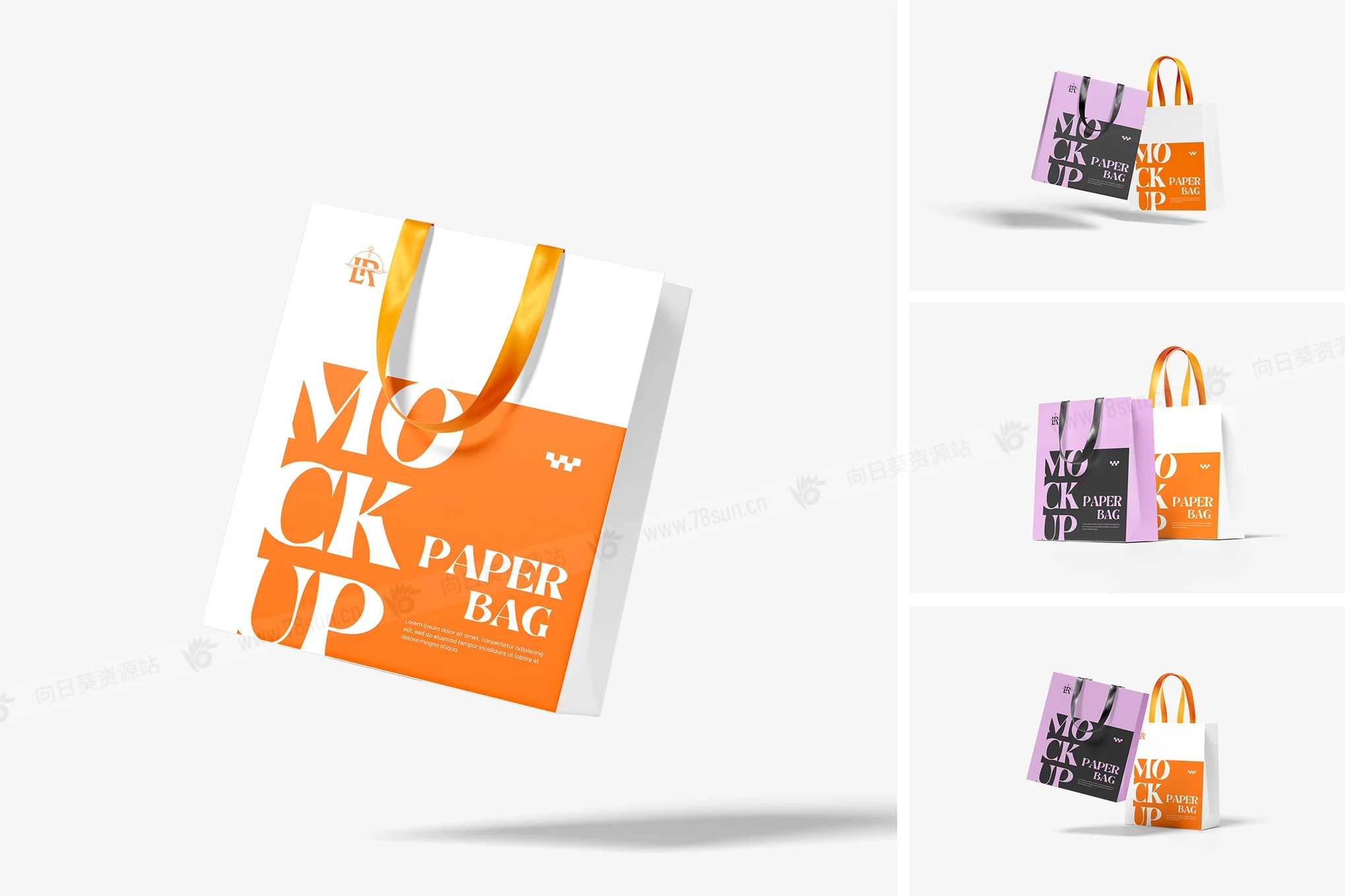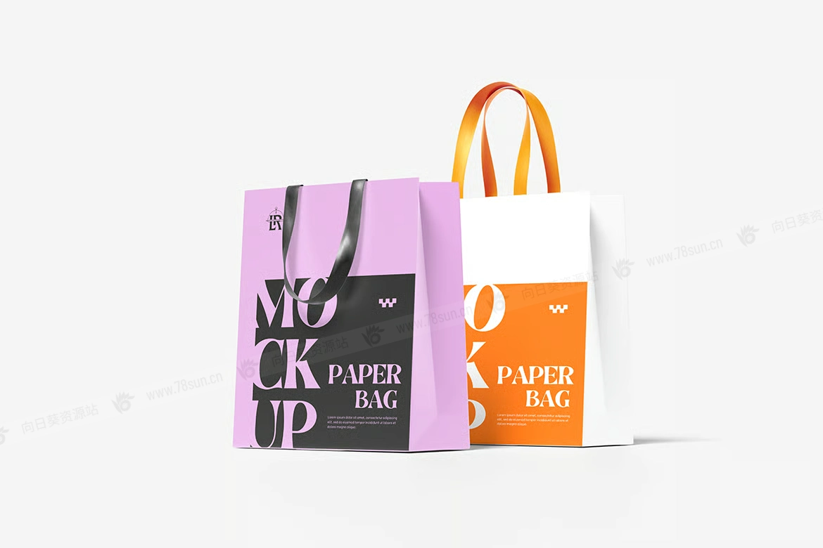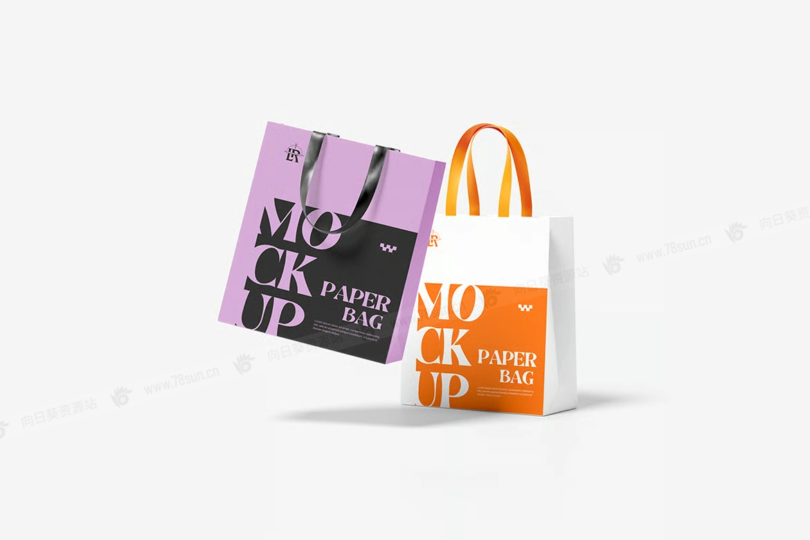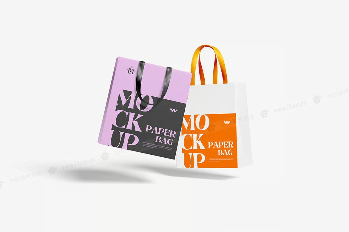纸质手提袋购物袋品牌VI效果图展示智能贴图psd设计样机。这个模型包含4个带有分层良好的PSD文件,并且还采用了智能对象功能,这意味着你可以在几秒钟内轻松快速地用自己的设计替换当前设计。
