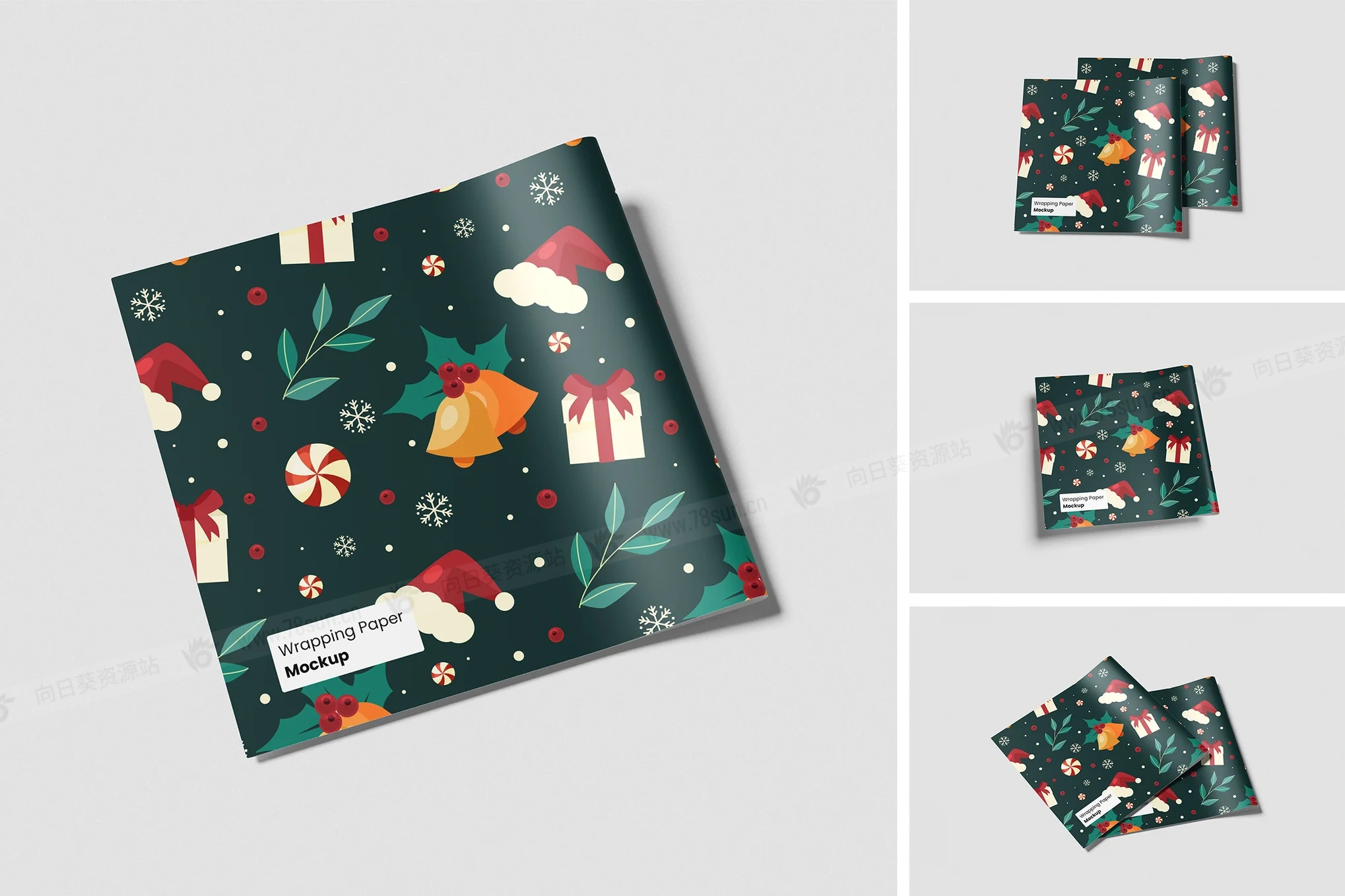 礼品包装纸品牌VI效果图展示智能贴图psd设计样机。这个模型包含4个带有分层良好的PSD文件,并且还采用了智能对象功能,这意味着你可以在几秒钟内轻松快速地用自己的设计替换当前设计。