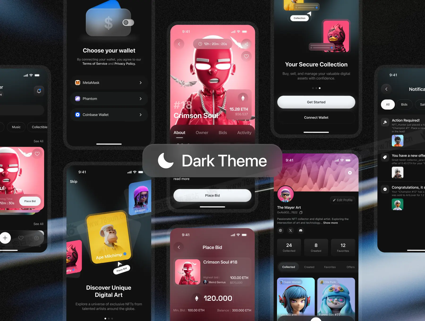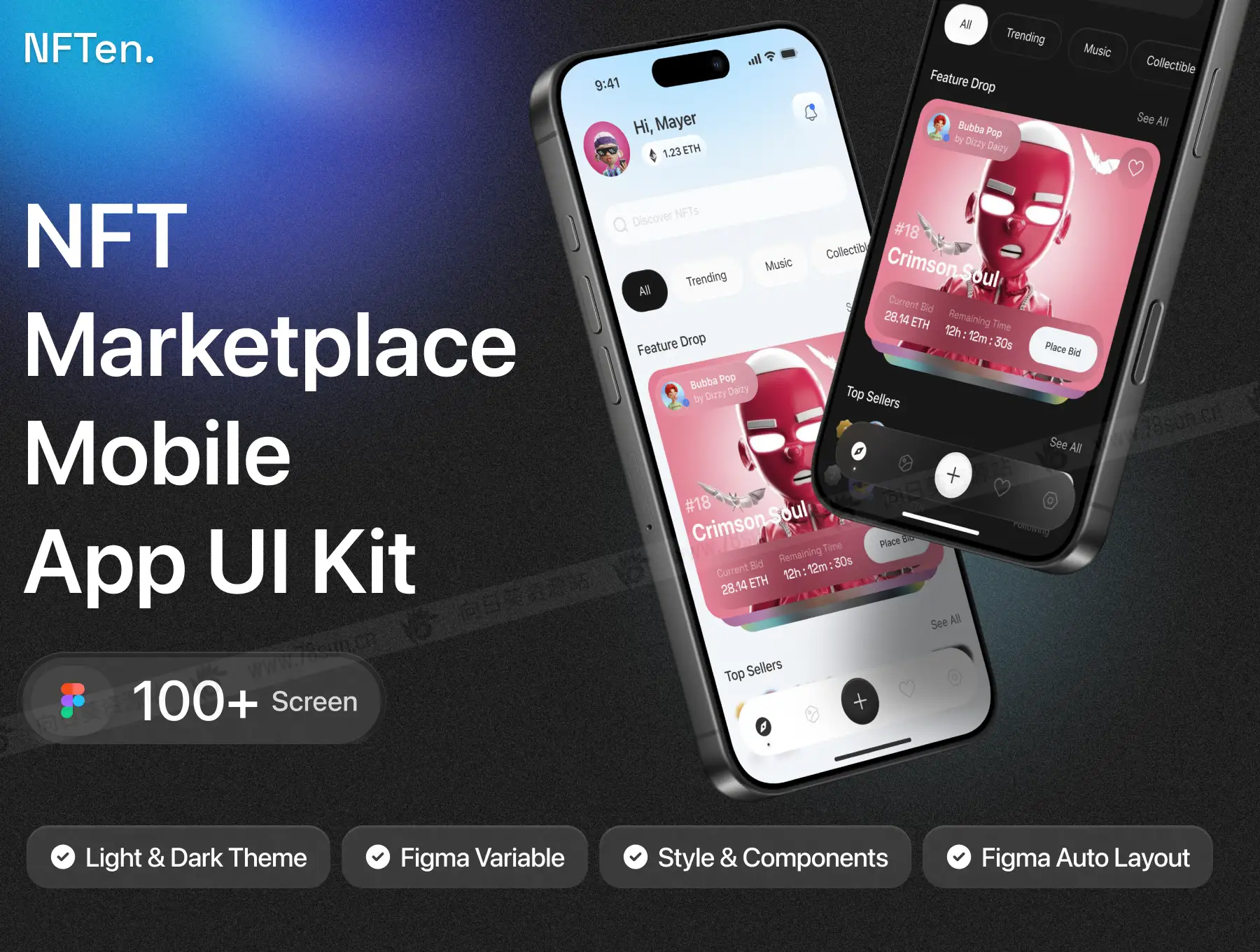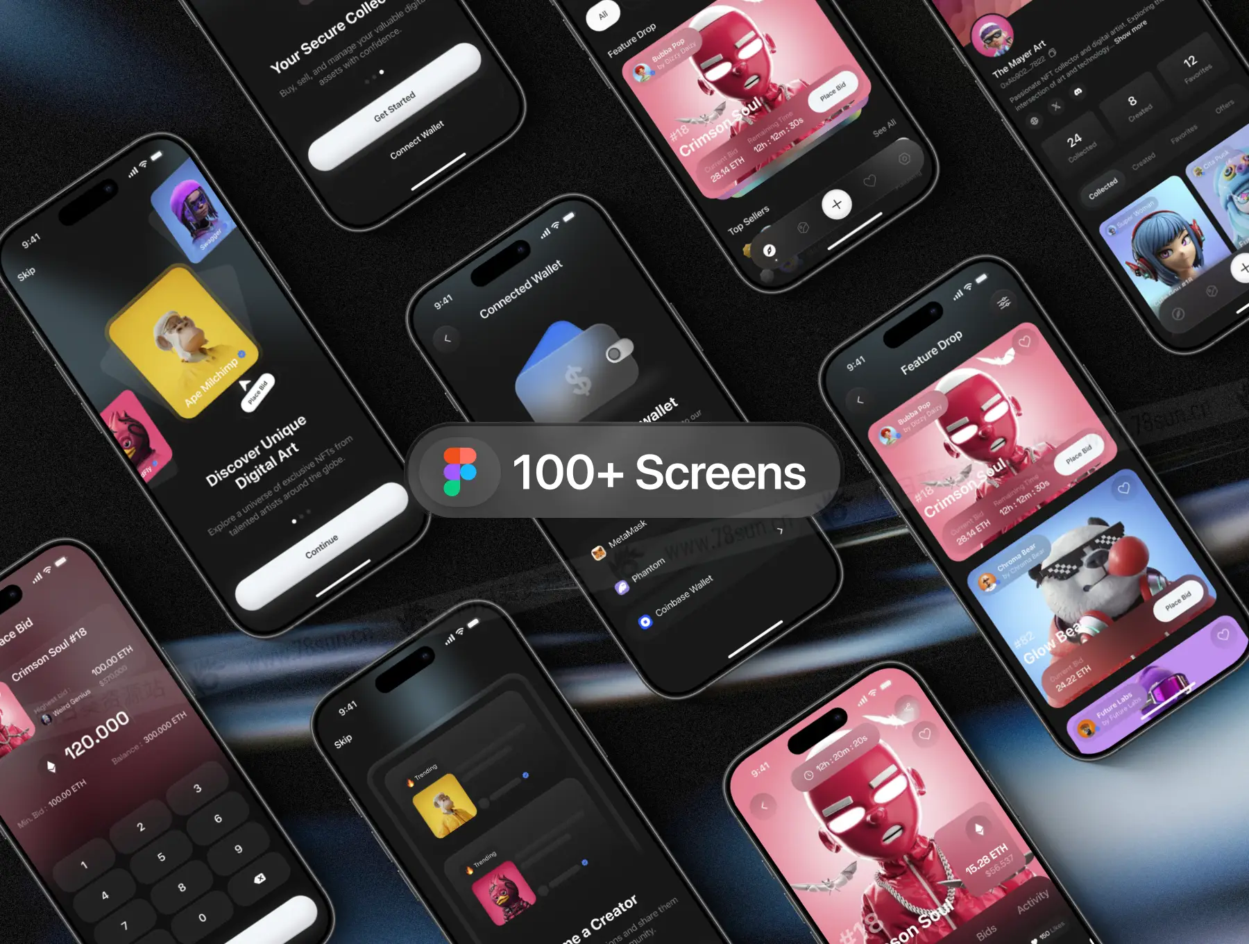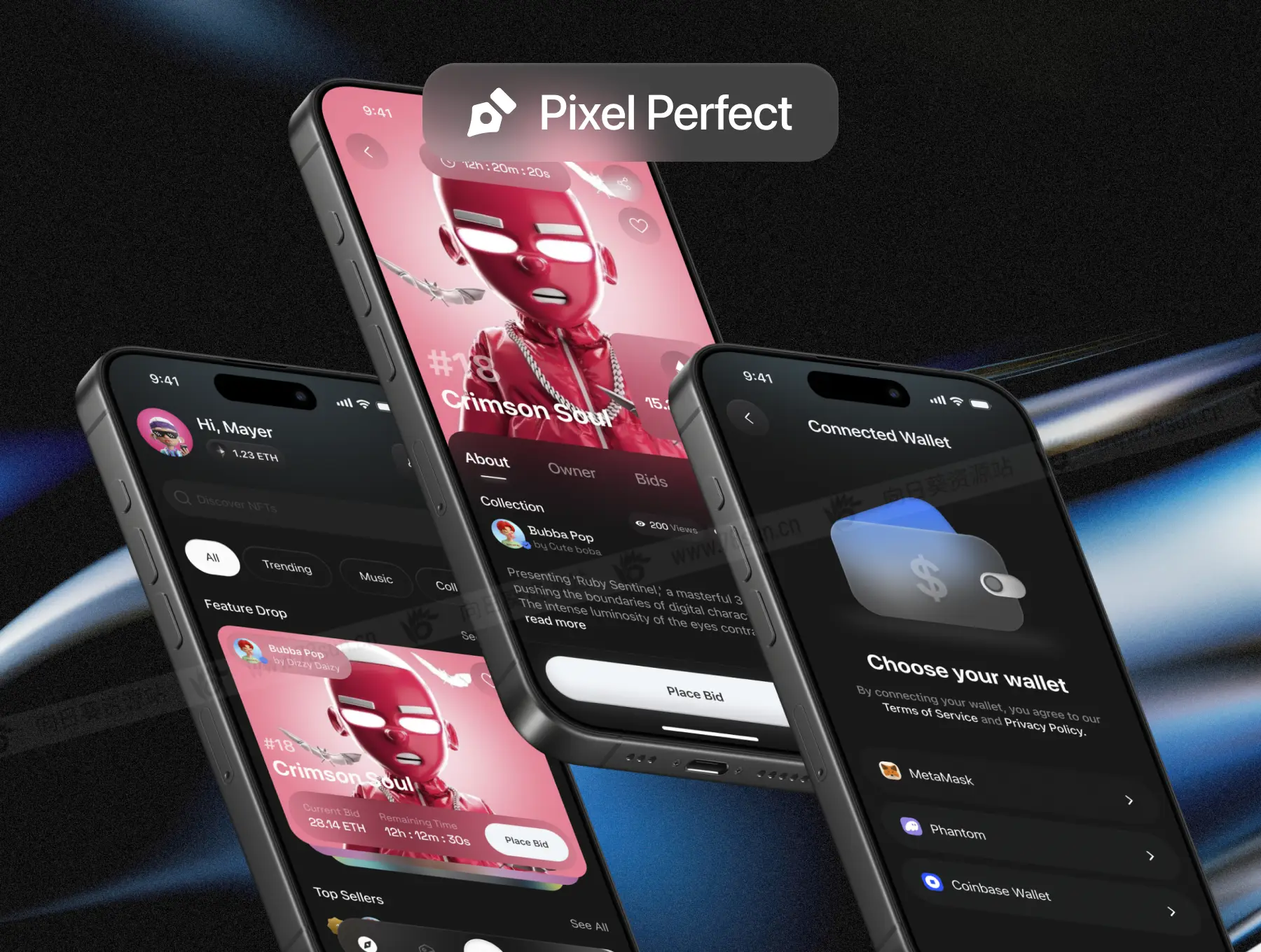 NFT区块链市场金融高科技app ui界面设计fig源文件模板,该套件涵盖光明与黑暗主题,涵盖所有关键用户流程。它是设计师、开发者和初创企业打造专业且直观Web3应用的完美工具包。
