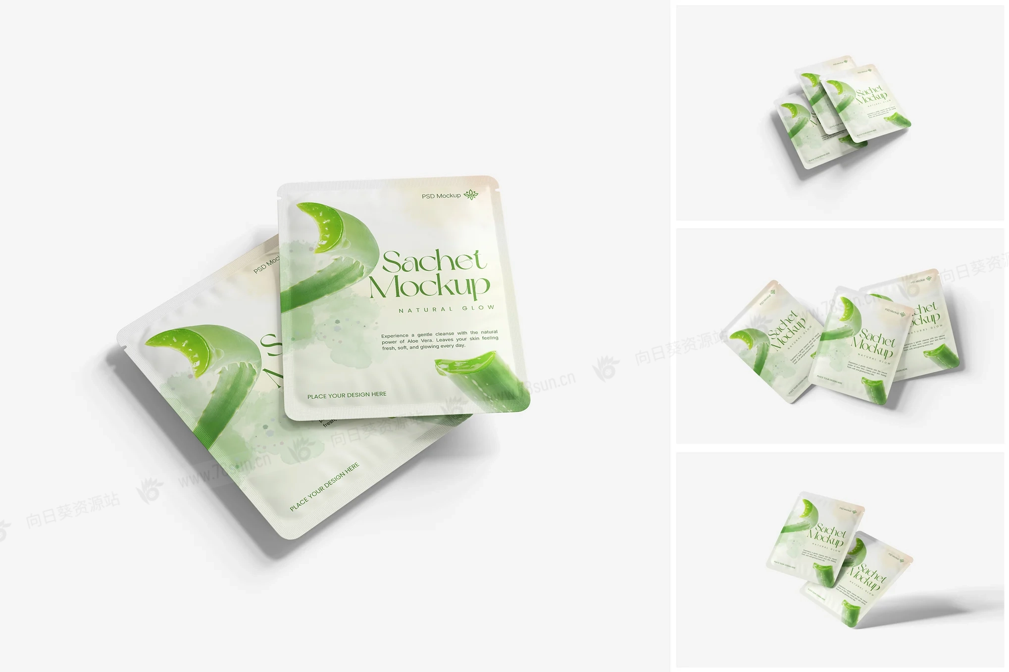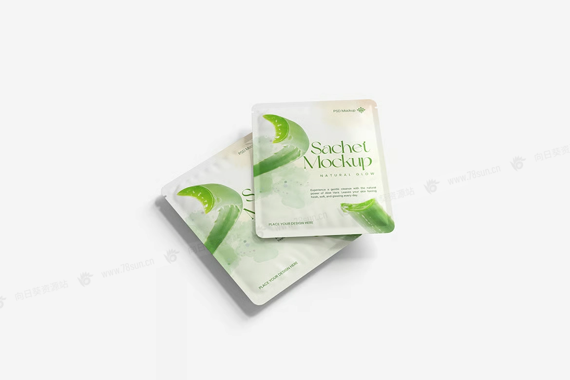 化妆品食品塑料小袋品牌VI效果图展示智能贴图psd设计样机。用智能对象轻松替换你的设计,双击智能图层,复制粘贴你的艺术作品,保存完毕!