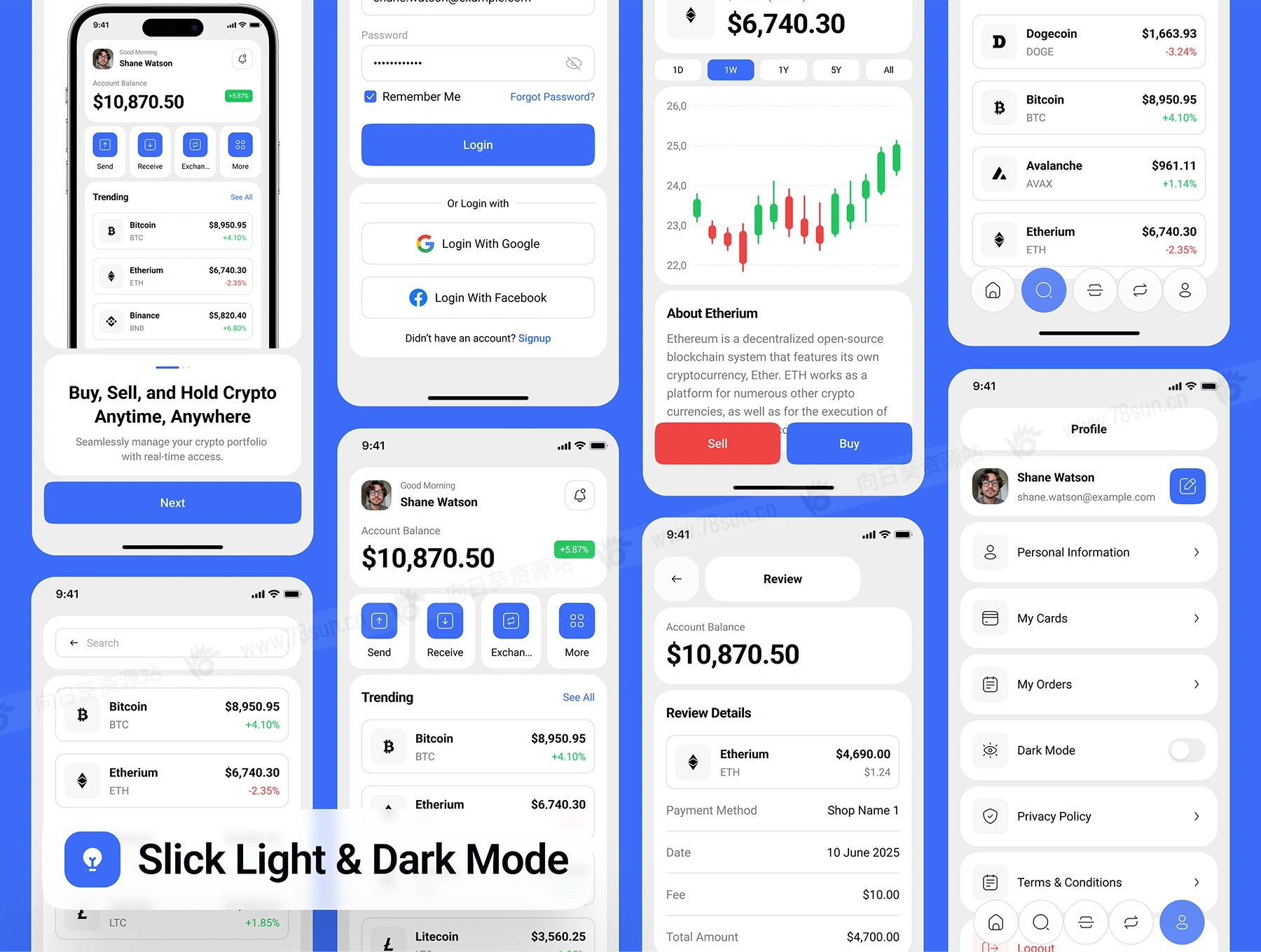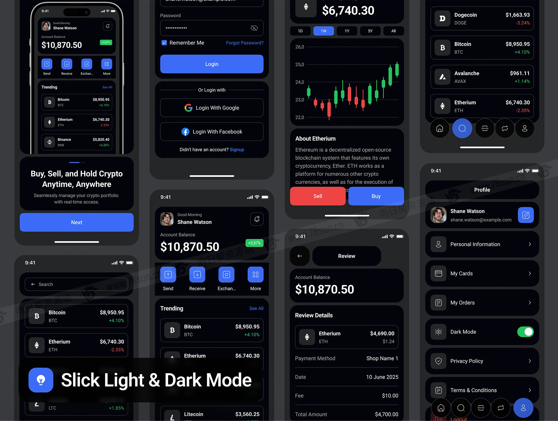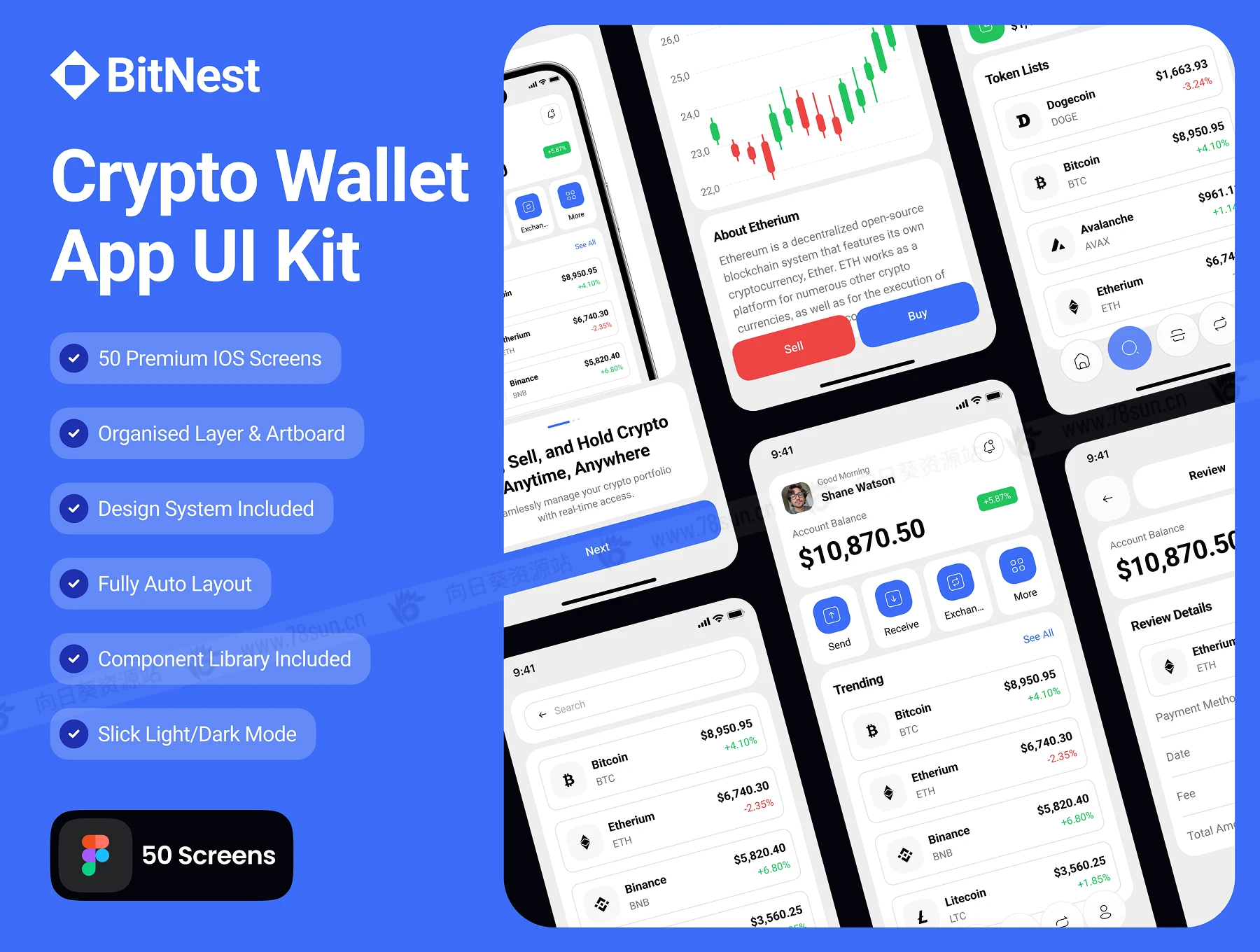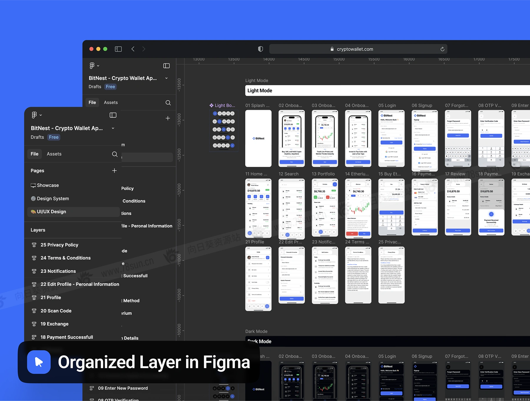 暗亮色金融加密货币钱包管理app ui界面设计fig源文件模板,拥有50个高质量屏幕,支持明暗模式,专为无缝加密交易、投资组合跟踪和安全钱包管理而设计。