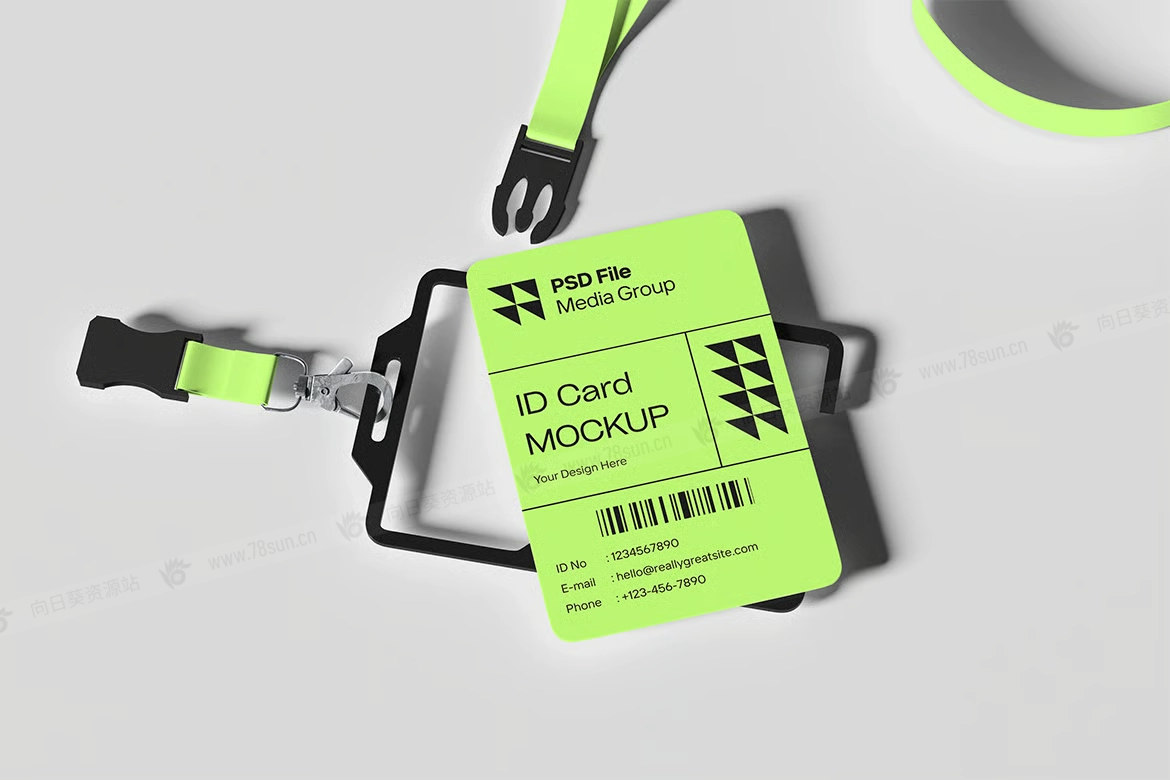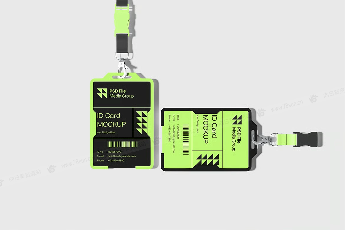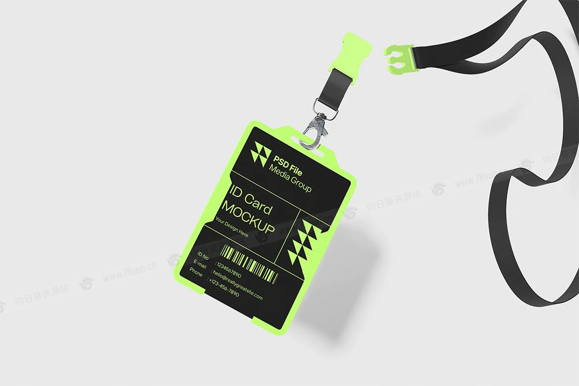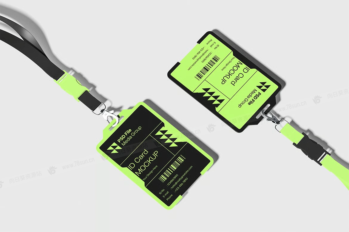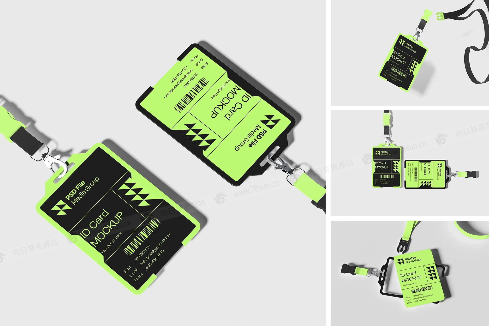 带挂绳工作证工卡ID卡门禁卡品牌VI效果图展示智能贴图psd设计样机。这个模型包含4个带有分层良好的PSD文件的物品,并且还采用了智能对象功能,这意味着你可以在几秒钟内轻松快速地用自己的设计替换当前设计。