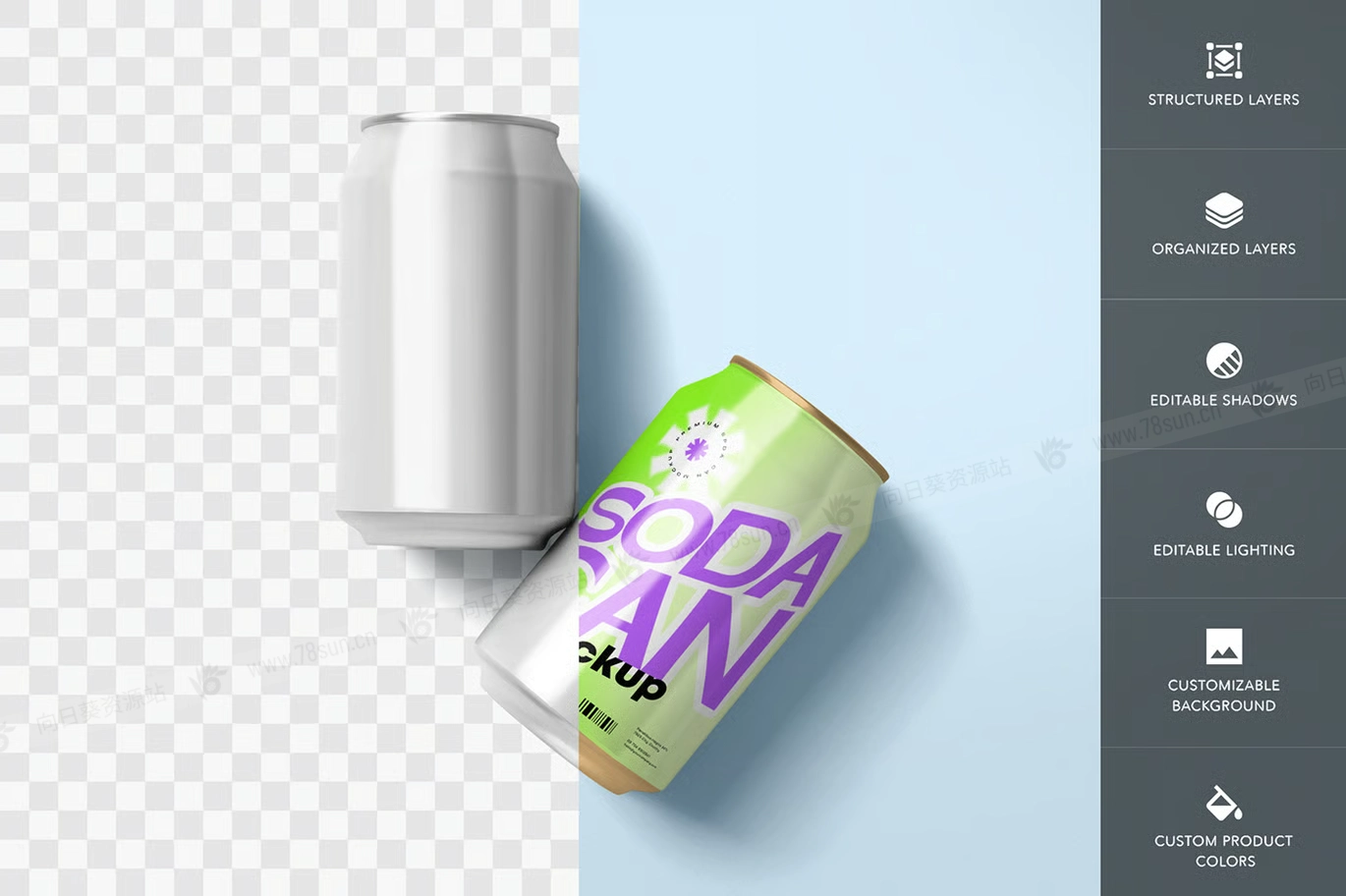 汽水饮料易拉罐头品牌VI效果图展示智能贴图psd设计样机。这款汽水罐模型包含智能物品图层,方便快速定制,并实现专业化的真实光影效果。