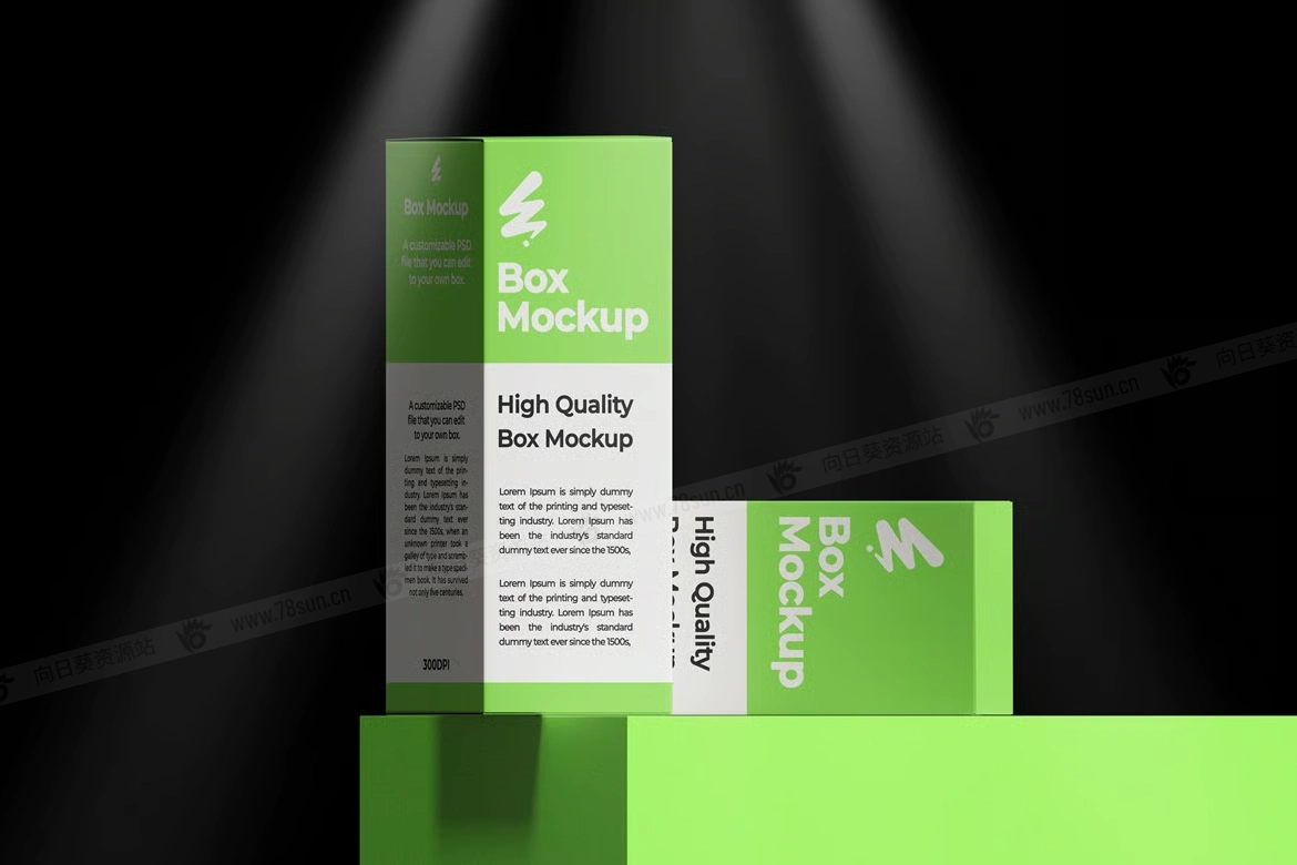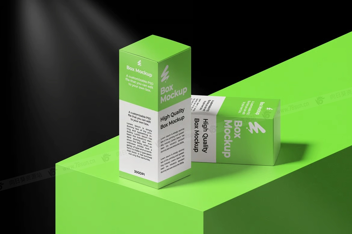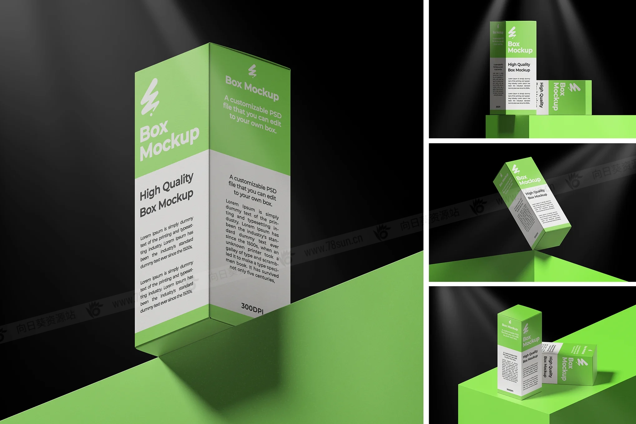 长方形盒矩形盒包装纸盒品牌VI效果图展示智能贴图psd设计样机,这个模型包含4个带有分层良好的PSD文件,并且还采用了智能对象功能,这意味着你可以在几秒钟内轻松快速地用自己的设计替换当前设计。