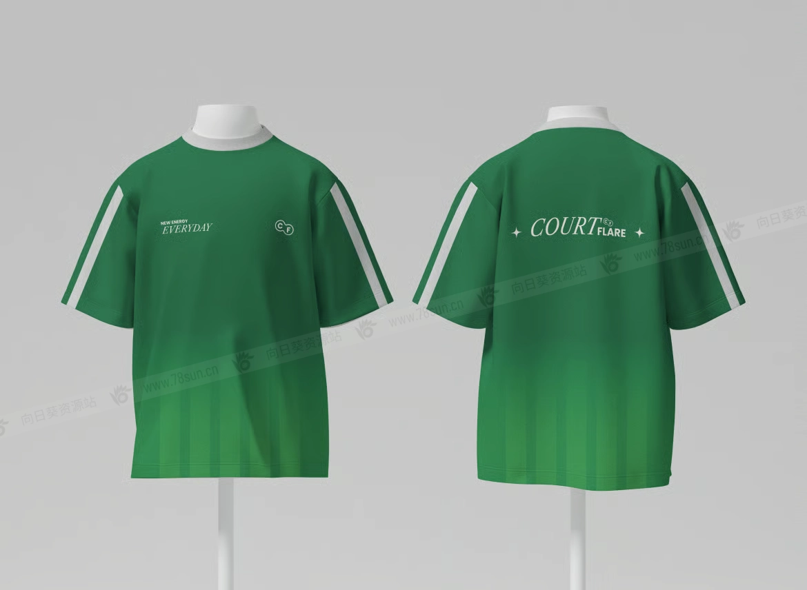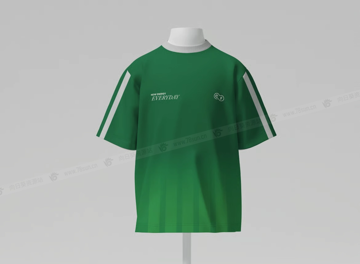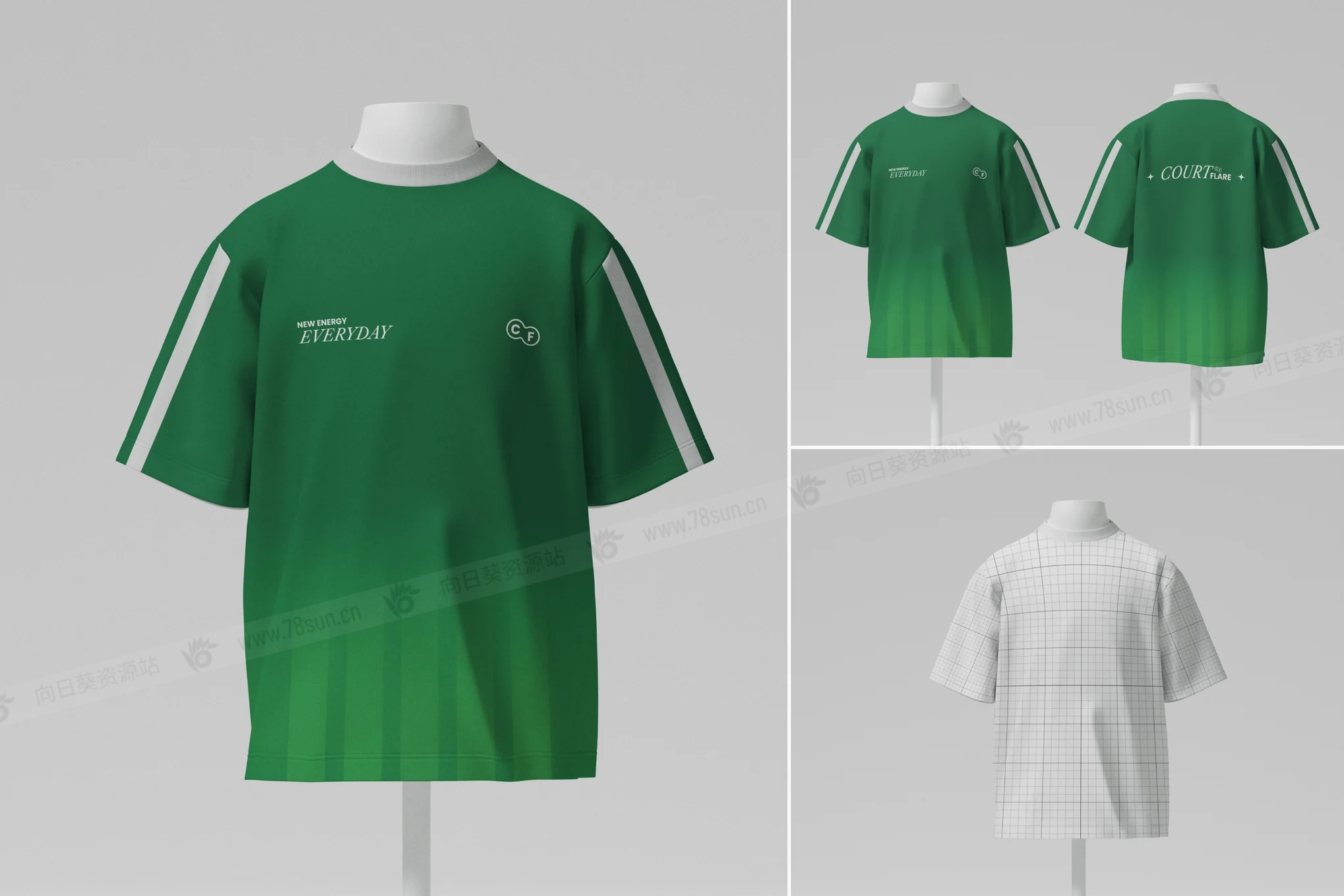 宽松oversize圆领T恤品牌VI效果图展示智能贴图psd设计样机。一件深绿色短袖T恤,置于一个光滑的人体模特上,从正面视线高度拍摄,智能对象图层,只需几秒钟更换衬衫颜色、调整面料张力,或调整模特姿势,就能轻松或贴身。轻松定制背景色调和阴影柔和度,以匹配你的服装品牌。