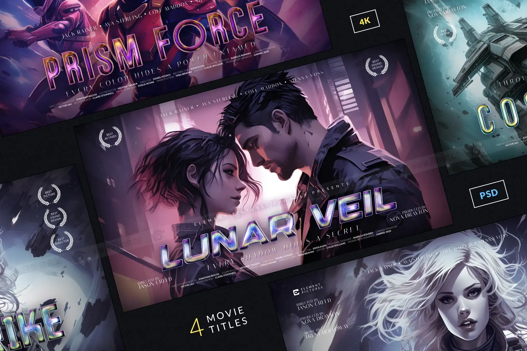 金属全息镭射渐变电影海报标题文本字体文字效果psd设计模板。这些游戏拥有4个可编辑的PSD模板,分辨率为惊艳的4K分辨率(3840×2160像素),非常适合制作戏剧性的海报、宣传艺术作品或引人注目的社交媒体视觉效果。每个模板都包含金属色和全息风格的字体效果,通过有序图层和智能对象,你可以轻松用自己的文字替换文本,只需几次点击即可自定义外观。