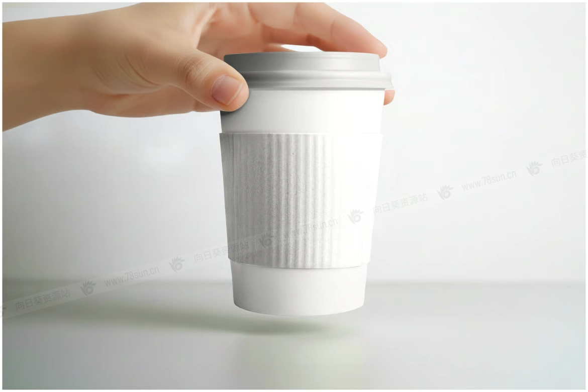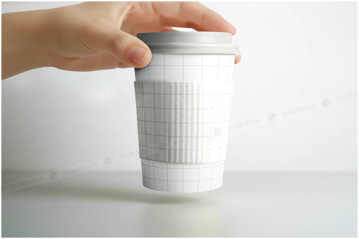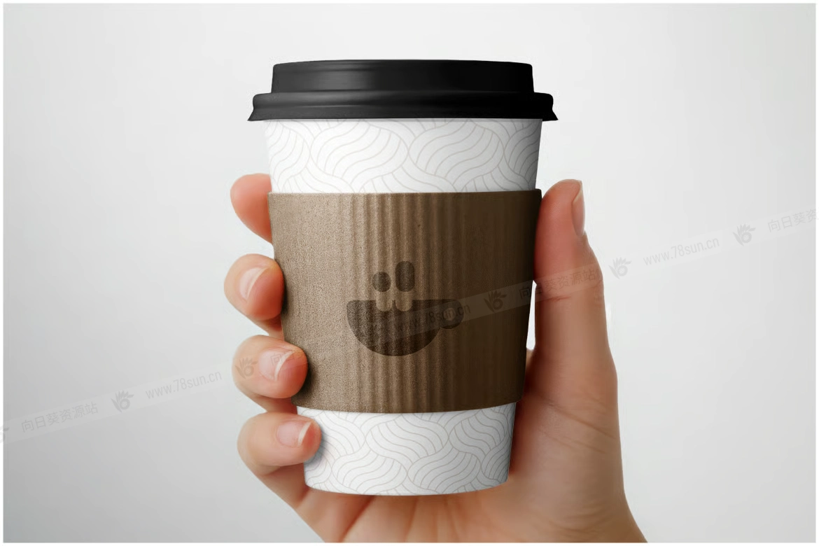 手持咖啡杯品牌VI效果图展示智能贴图psd设计样机。包含多视角视图以及一个空白且可完全自定义的版本,