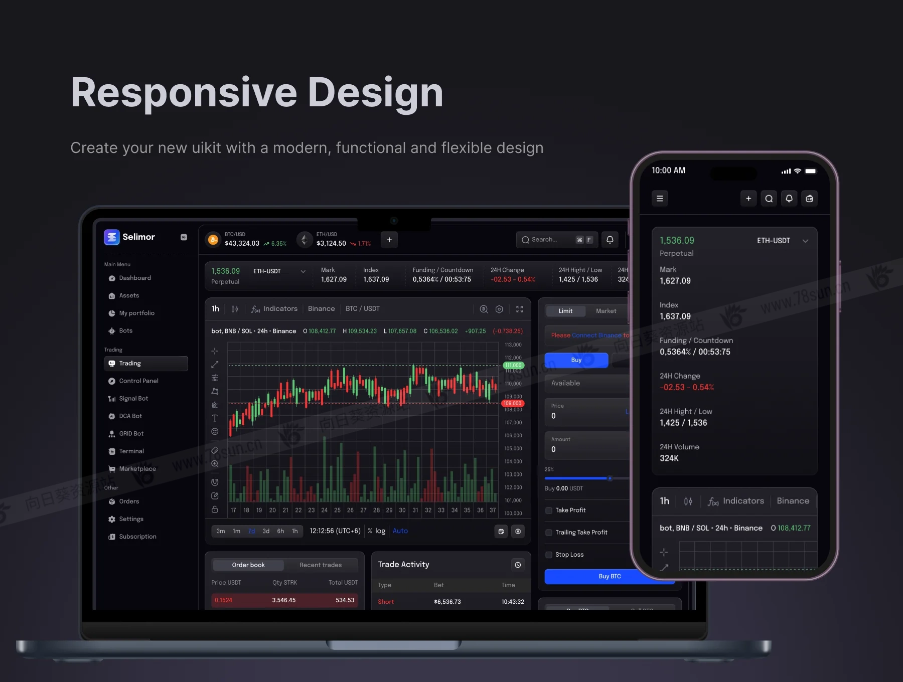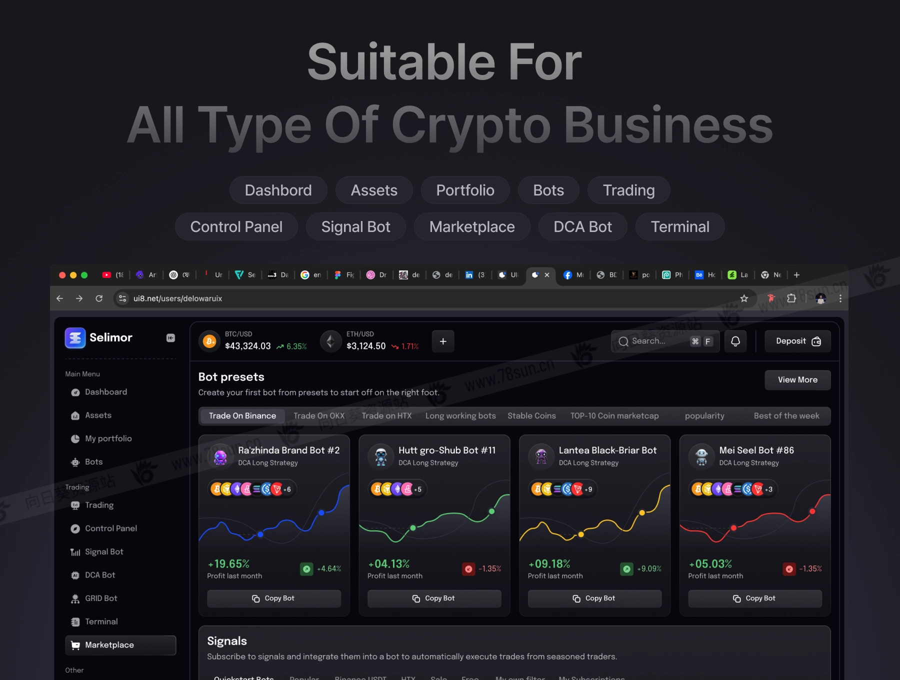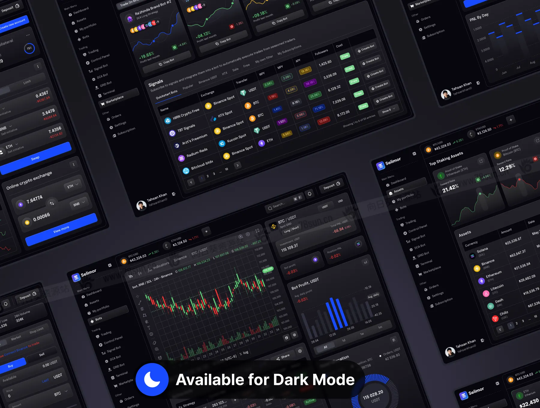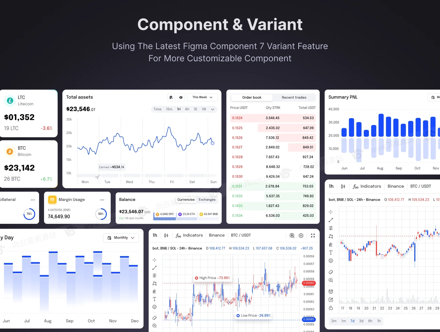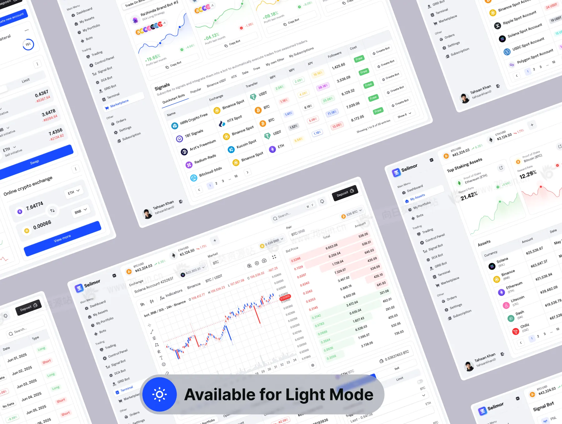 AI智能金融加密货币网站后台管理系统web/app ui界面设计fig源文件模板。它包含了仪表盘、我的资产、投资组合、机器人(信号、DCA、网格)、交易终端、控制面板、市场、订单和设置等关键界面——非常适合构建智能实时交易界面。