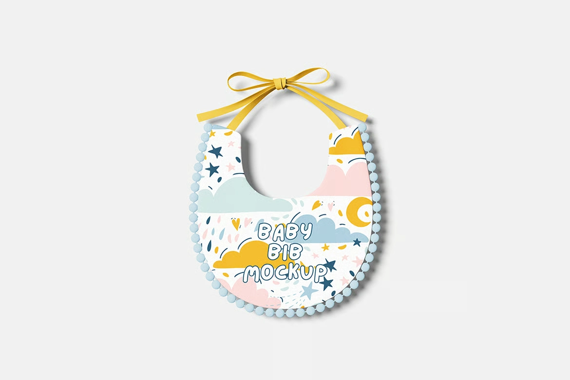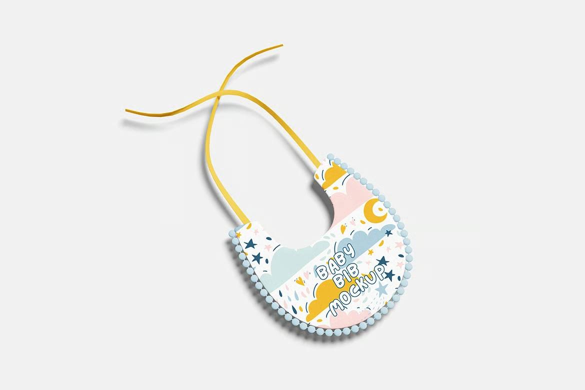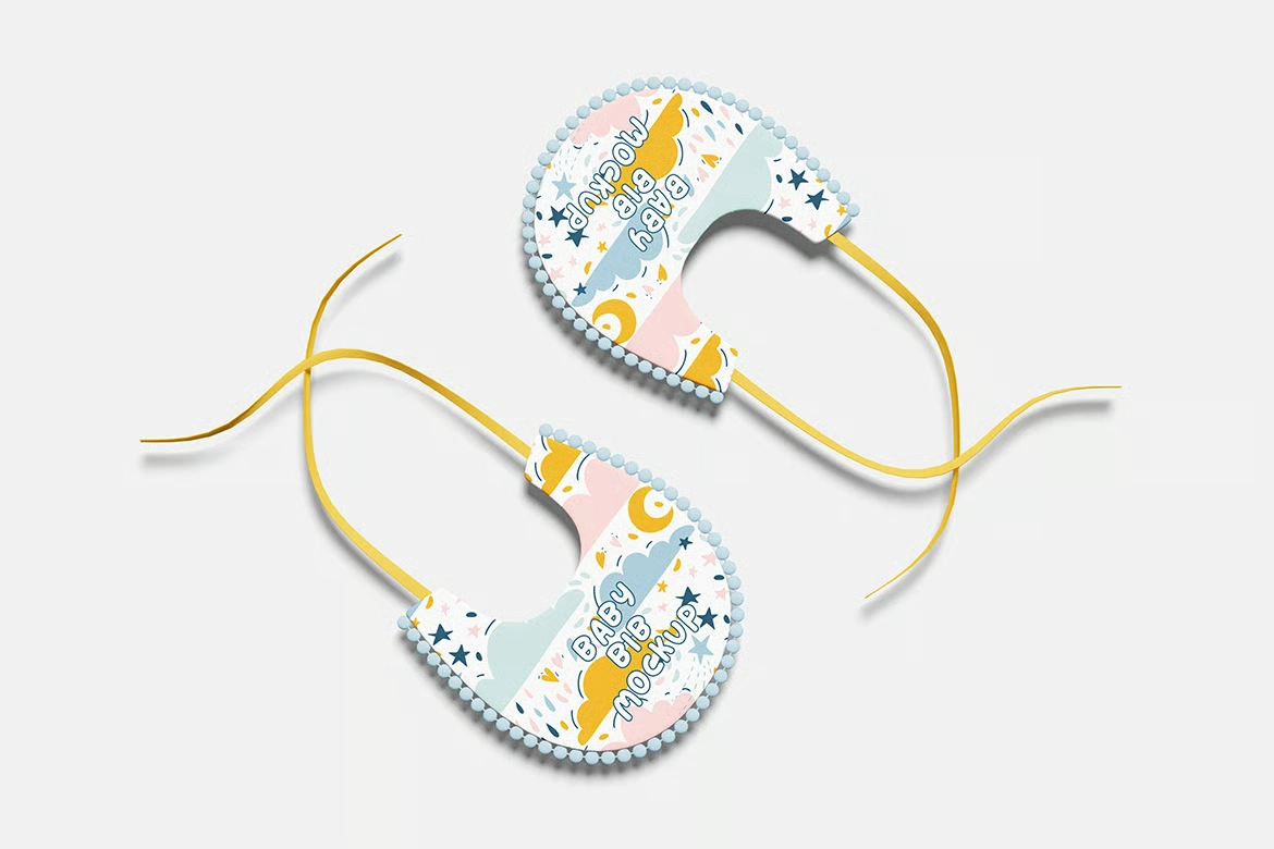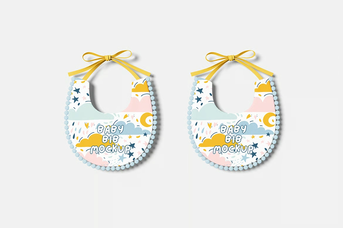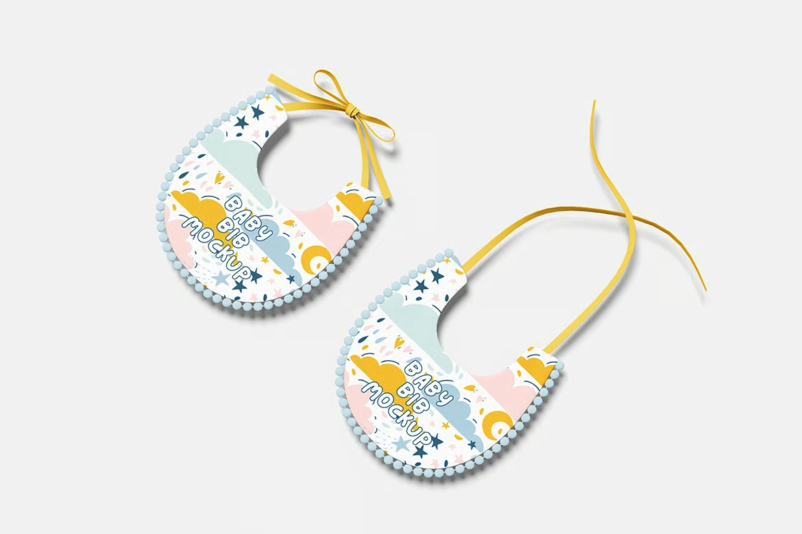 婴儿围兜品牌VI效果图展示智能贴图psd设计样机。你可以用智能物体功能轻松快速地替换设计。提供PSD Photoshop格式,并配备智能对象功能,帮助你在几秒钟内用自己的设计替换当前设计。
