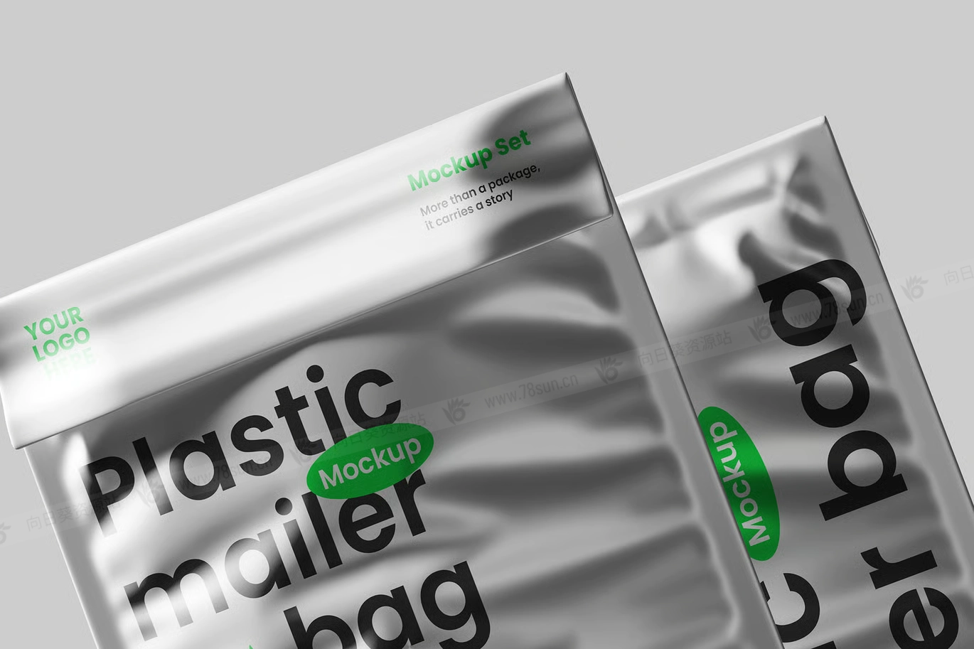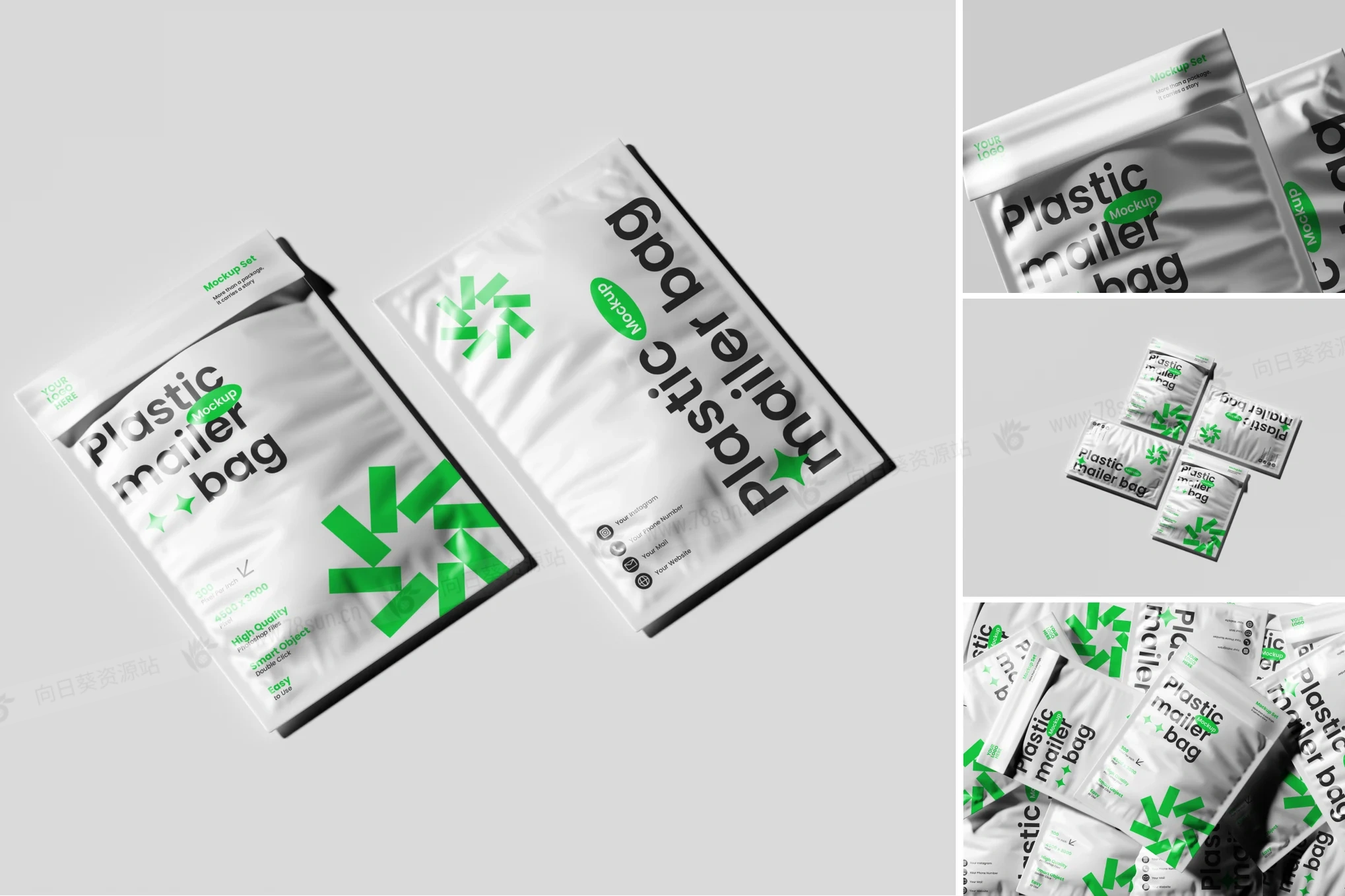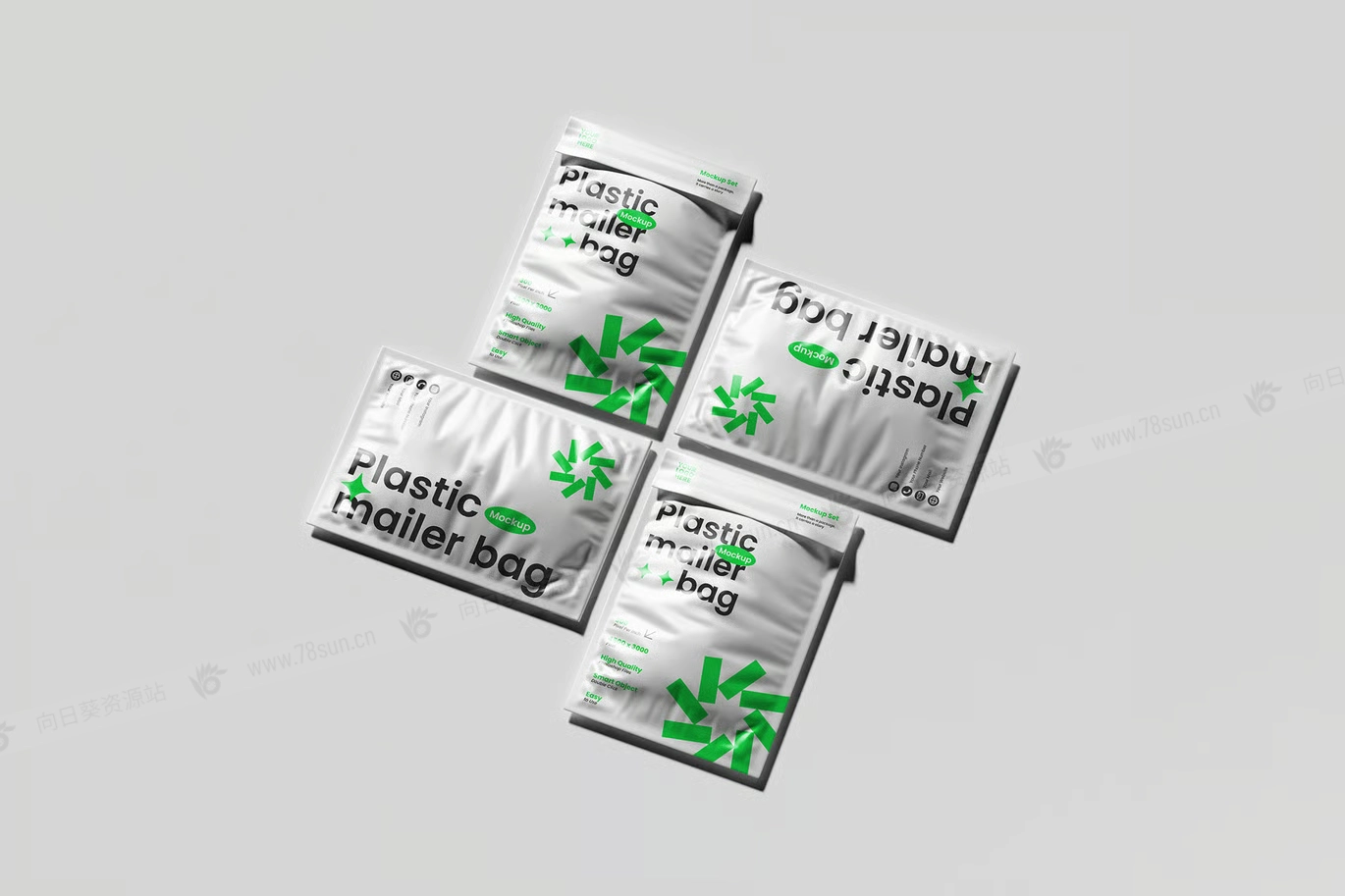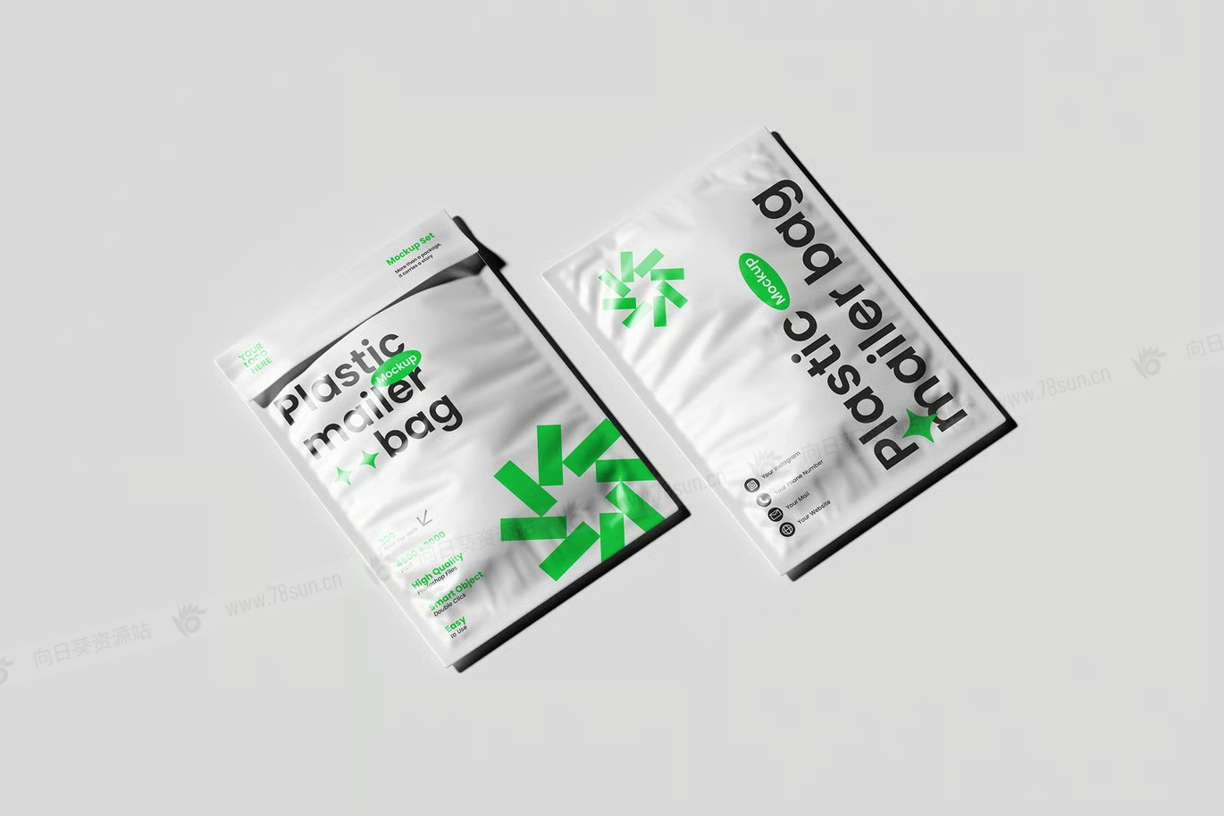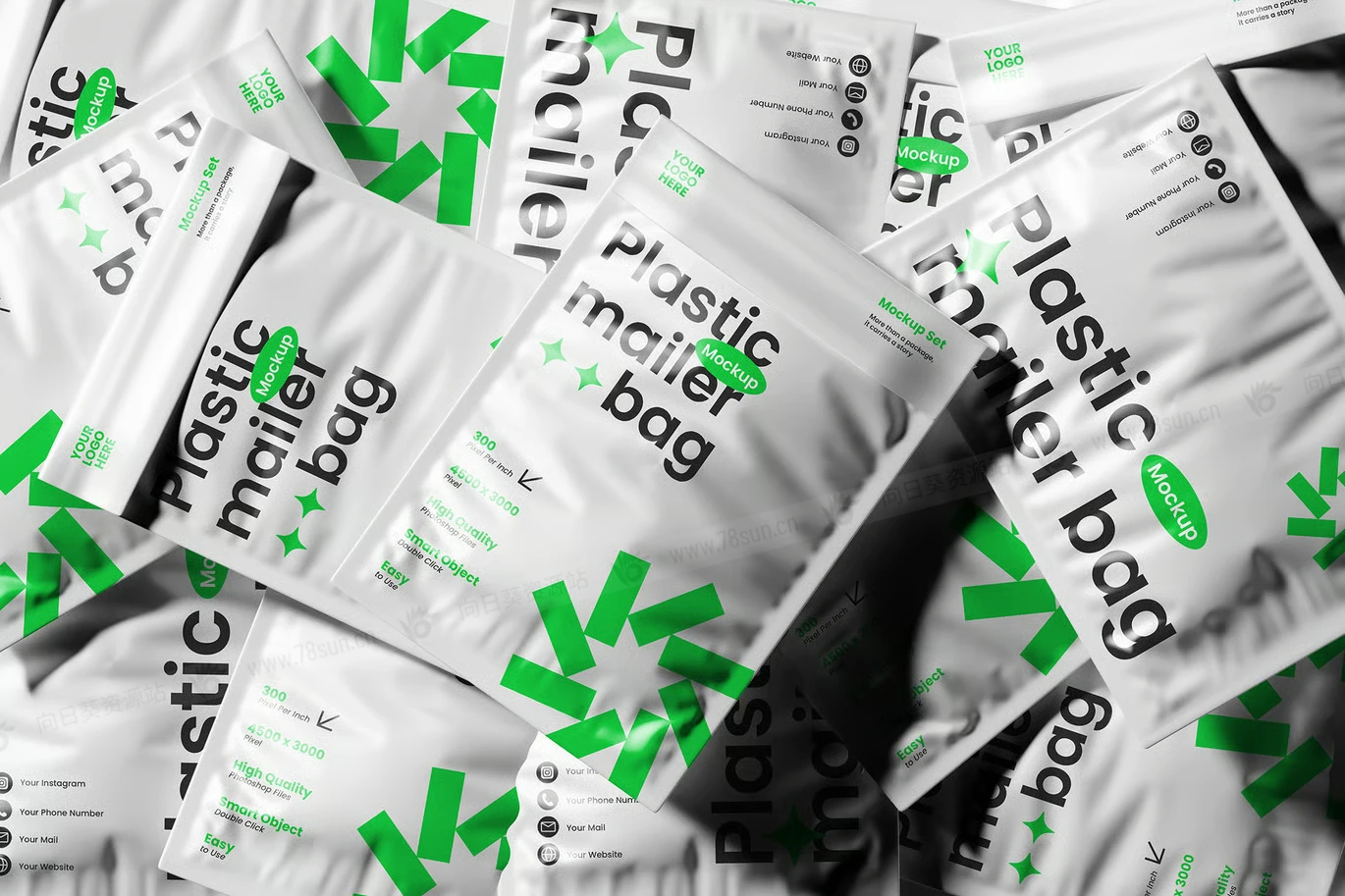 快递邮件包装塑料袋品牌VI效果图展示智能贴图psd设计样机。它使用智能对象,所以你可以在几秒钟内用自己的设计替换。