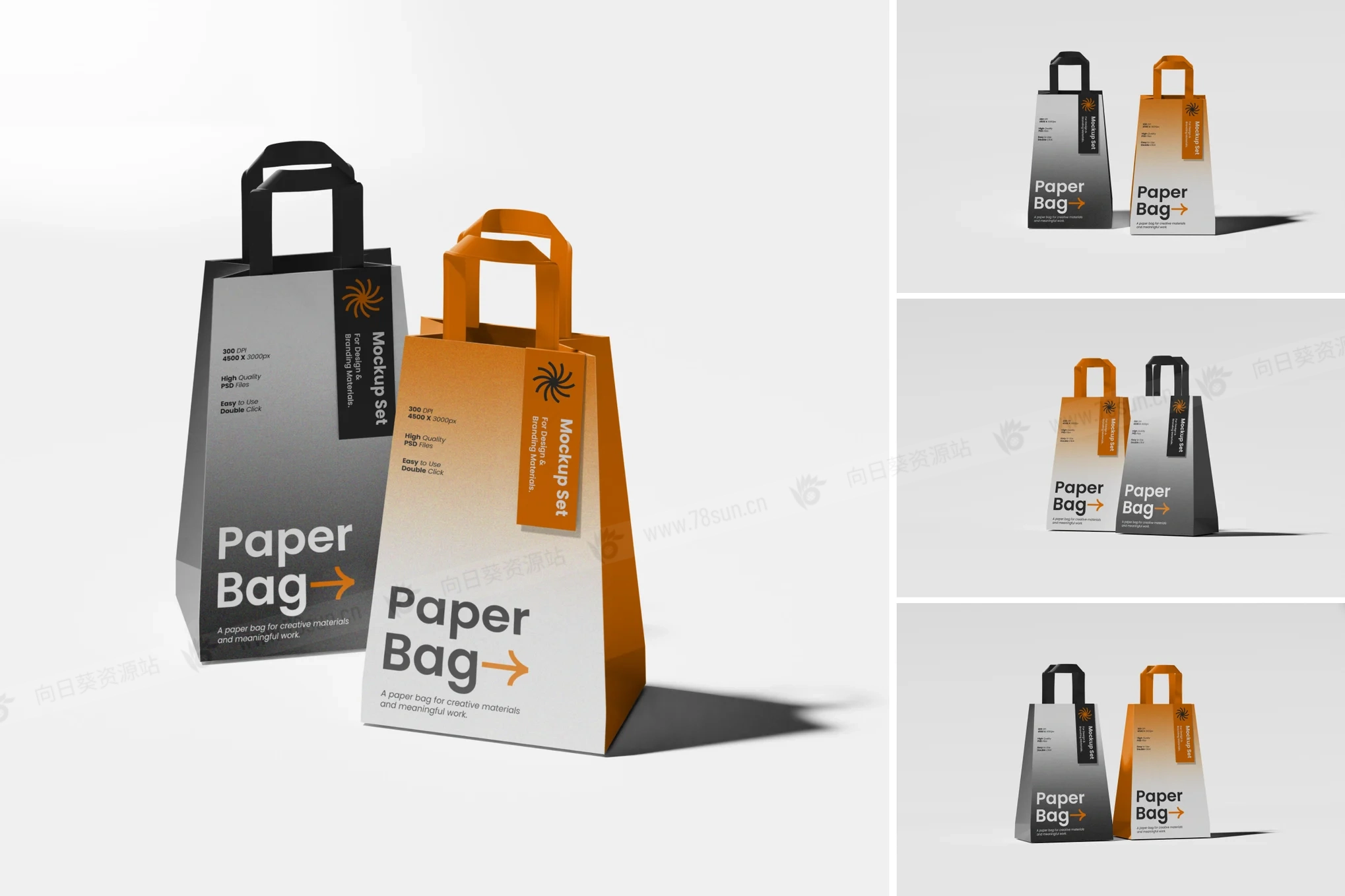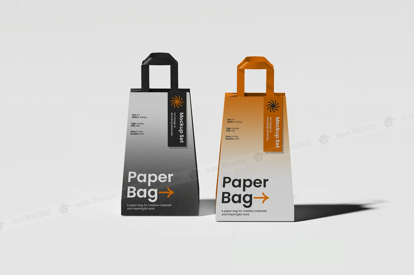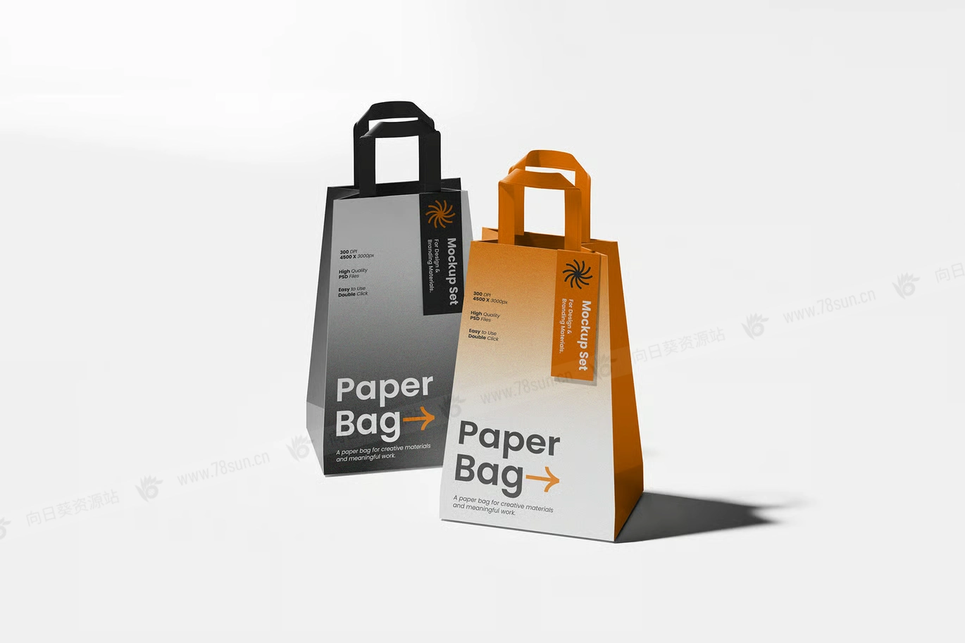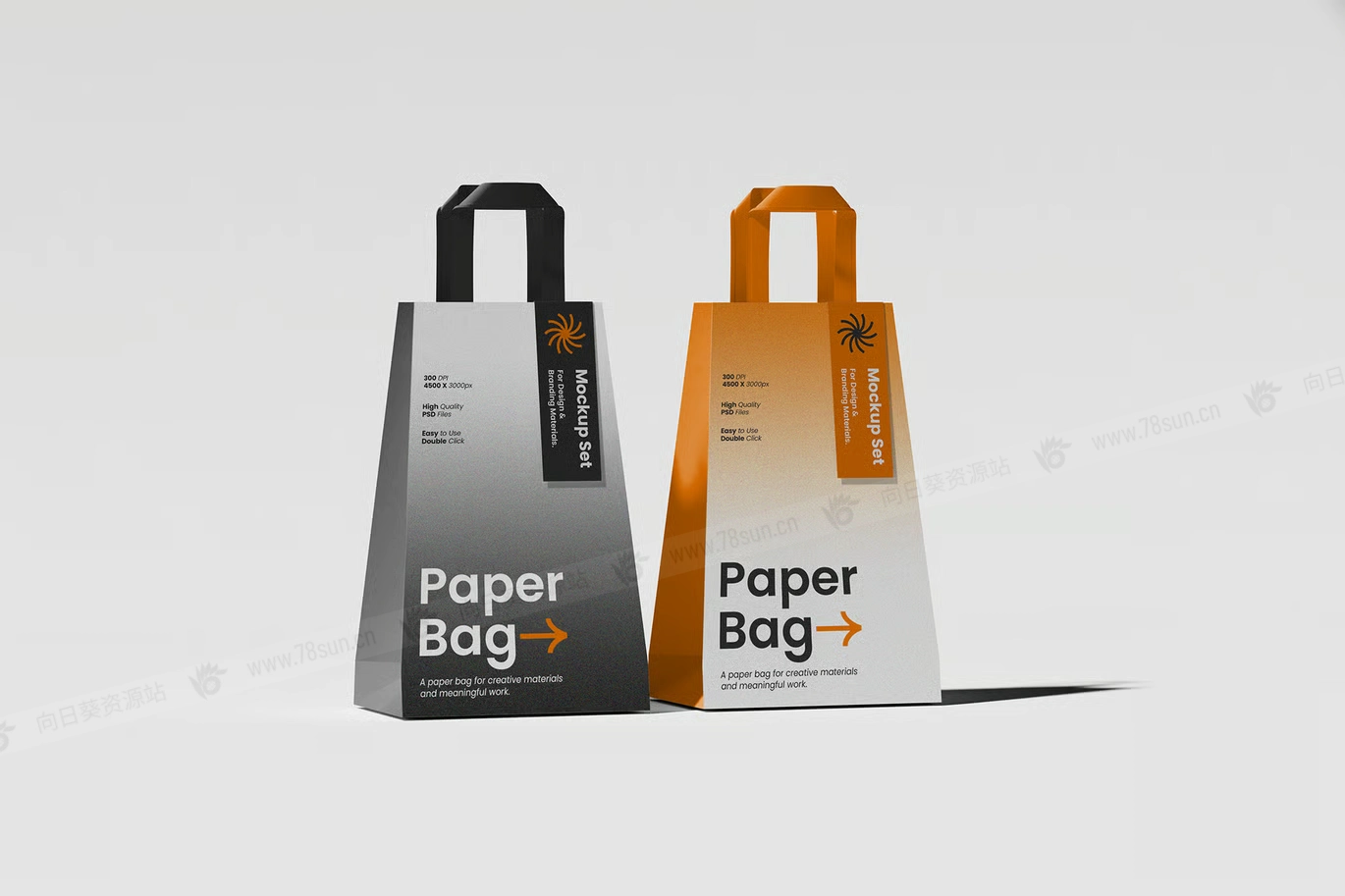 食品纸袋手提袋品牌VI效果图展示智能贴图psd设计样机。它使用智能对象,所以你可以在几秒钟内用自己的设计替换。