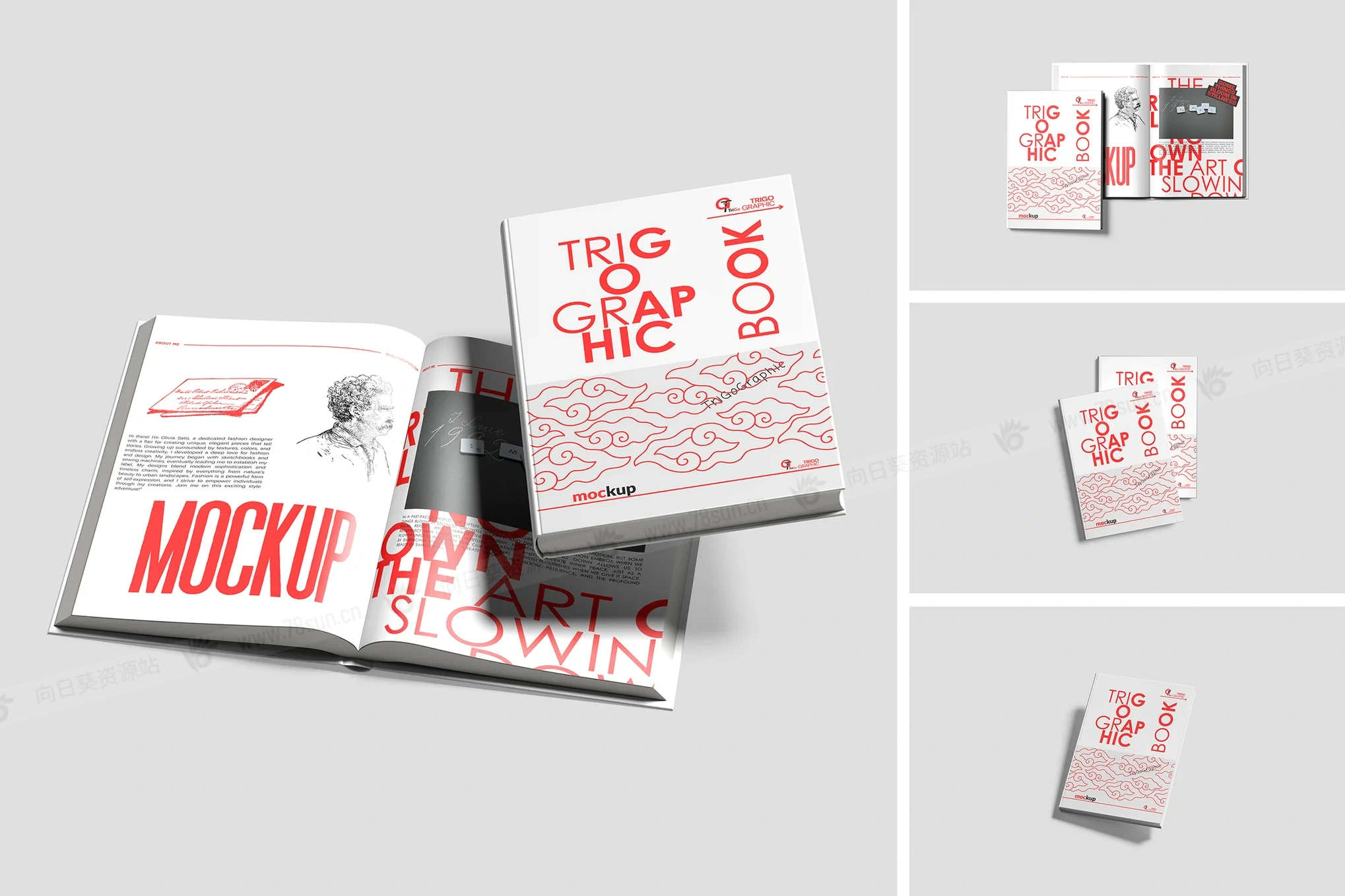 精装书籍封面内页品牌VI效果图展示智能贴图psd设计样机。这个模型包含4个带有分层良好的PSD文件,并且还采用了智能对象功能,这意味着你可以在几秒钟内轻松快速地用自己的设计替换当前设计。