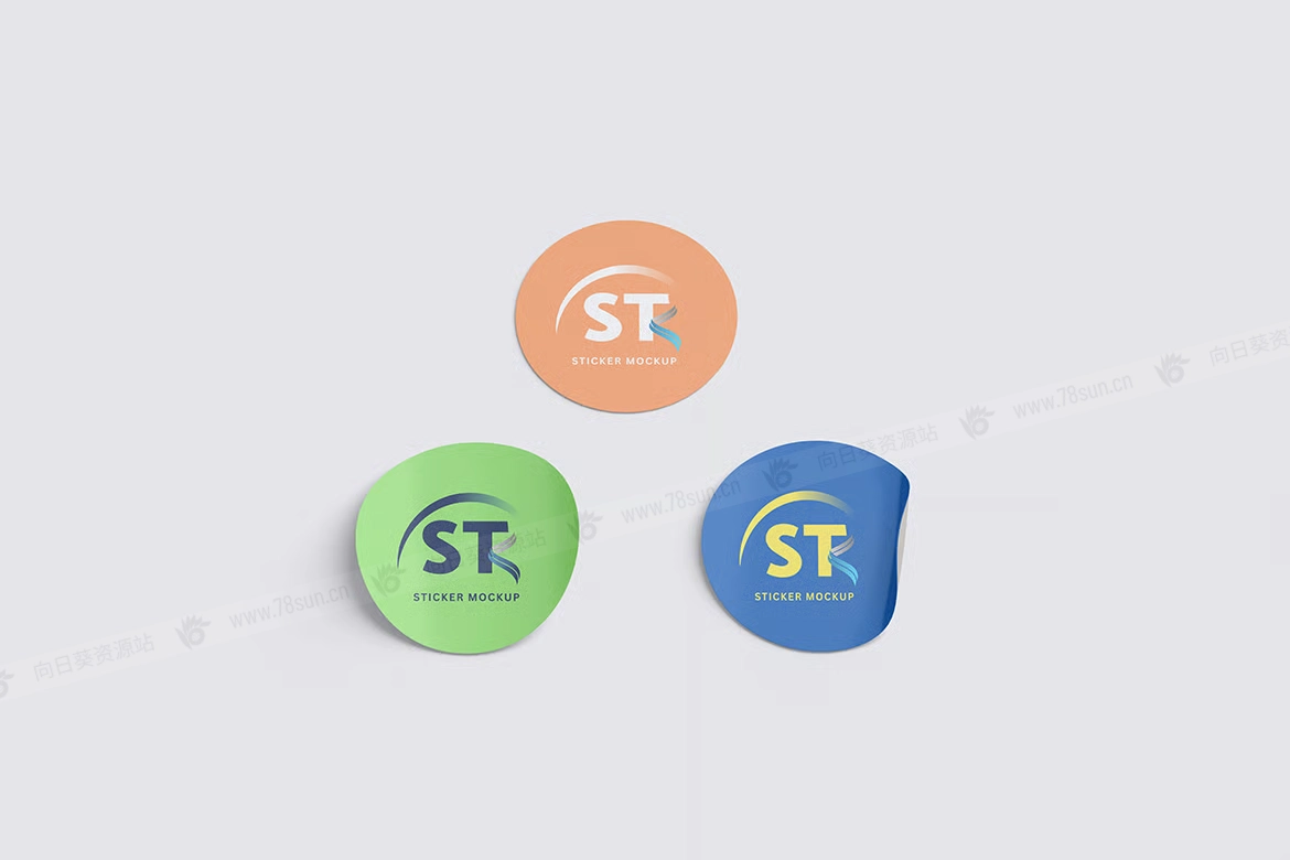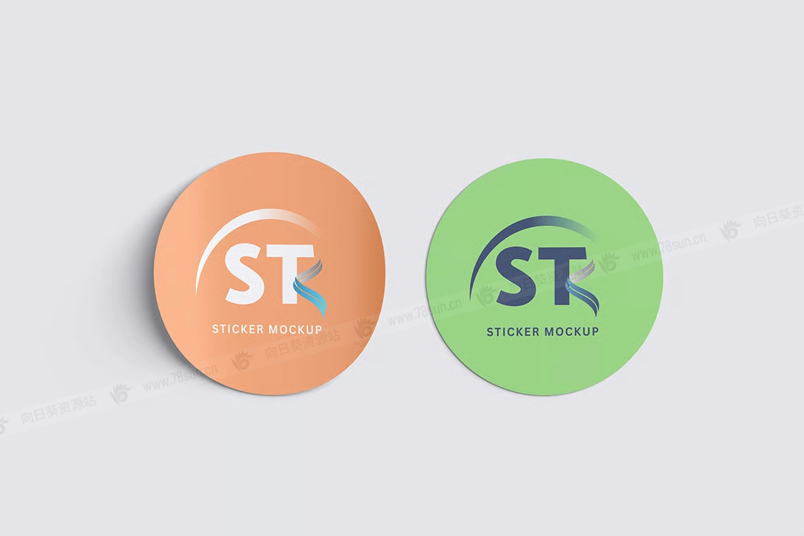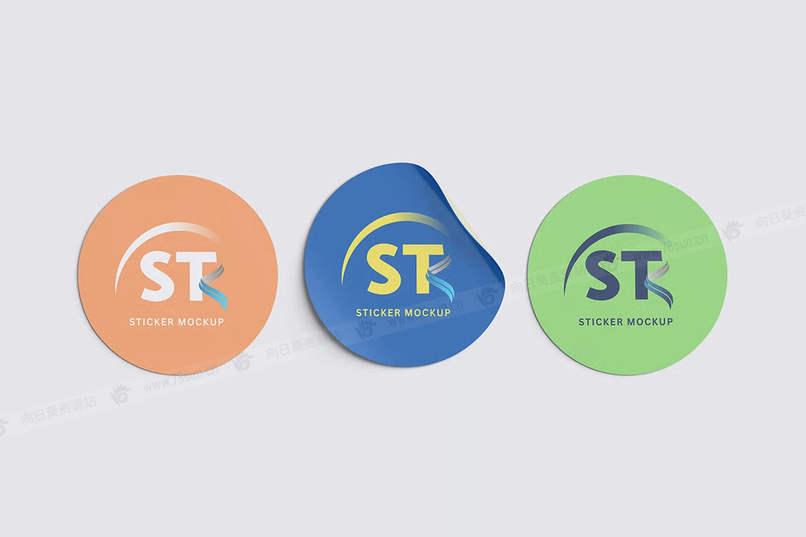圆形剥皮贴纸品牌VI效果图展示智能贴图psd设计样机,这个模型包含4个物品,带有分层良好的PSD文件,并且还采用了智能对象功能,这意味着你可以在几秒钟内轻松快速地用自己的设计替换当前设计。