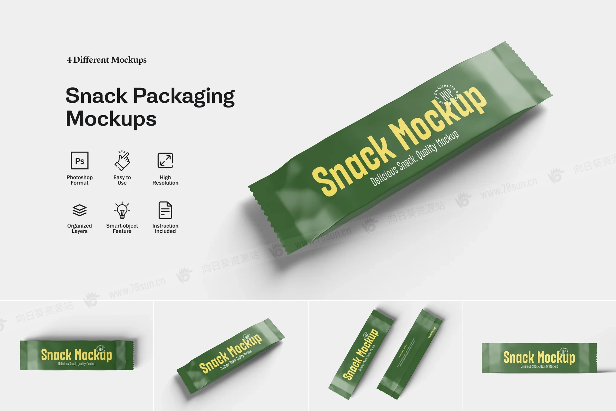 食品零食饼干包装塑料小袋品牌VI效果图展示智能贴图psd设计样机。该合集包含4款不同的Photoshop模型,允许你从多个角度展示设计,采用逼真的光影和平滑的阴影效果。每个文件都包含有组织的图层和智能对象功能,使自定义变得快速且轻松。