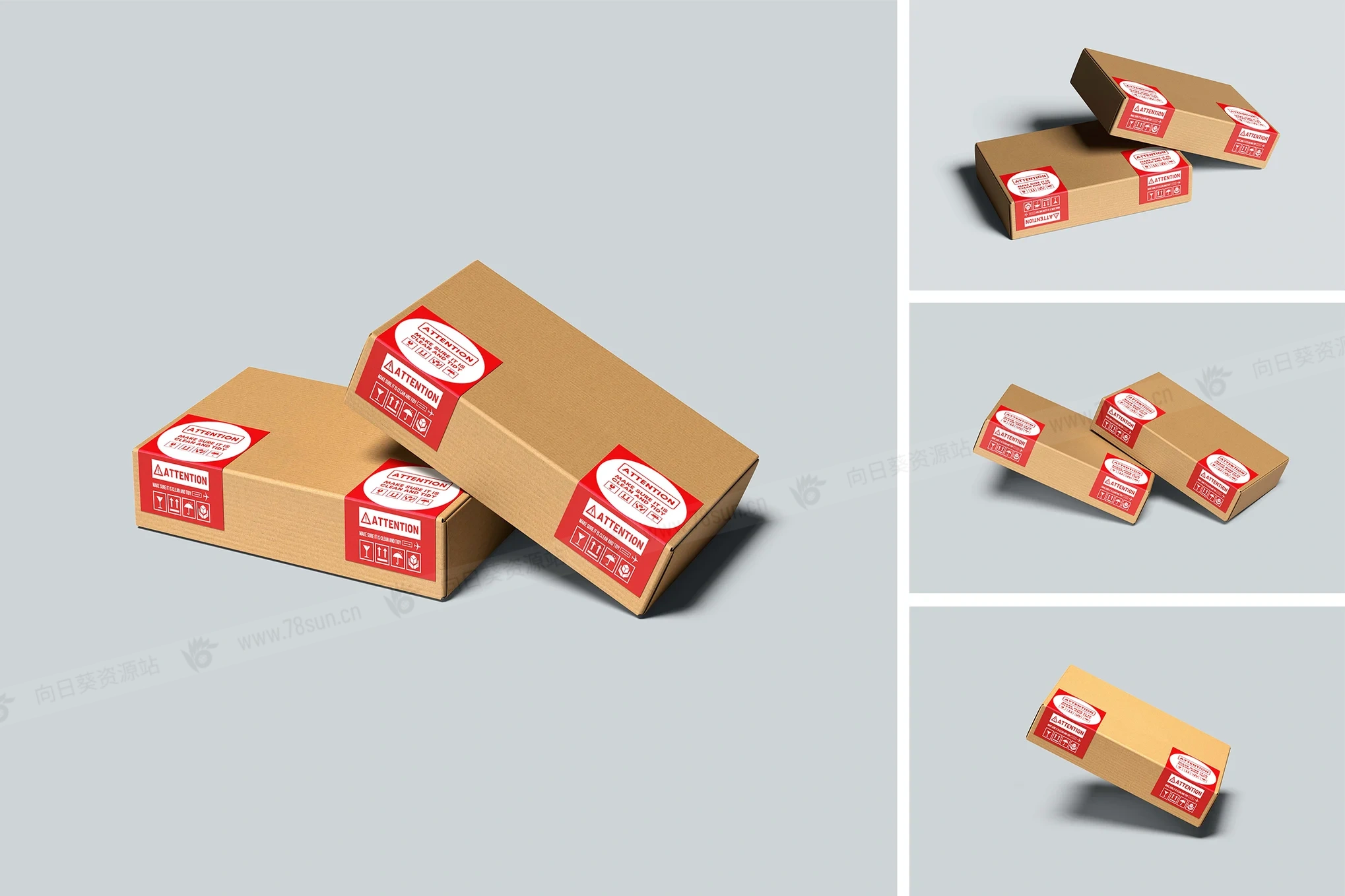 带纸盒方形剥皮贴纸品牌VI效果图展示智能贴图psd设计样机。这个模型包含4个带有分层良好的PSD文件,并且还采用了智能对象功能,这意味着你可以在几秒钟内轻松快速地用自己的设计替换当前设计。