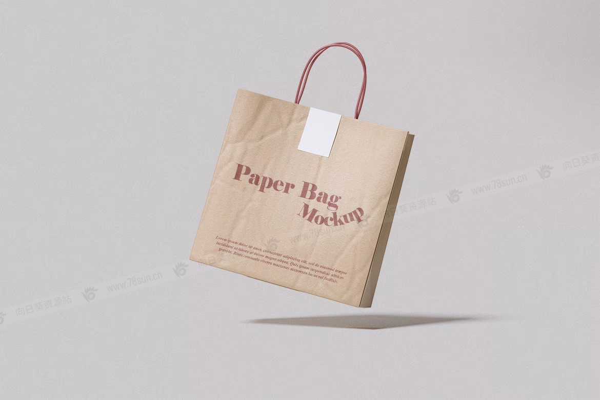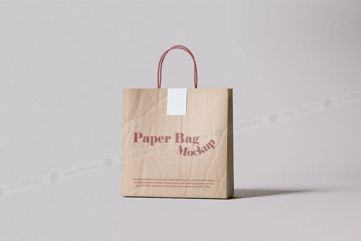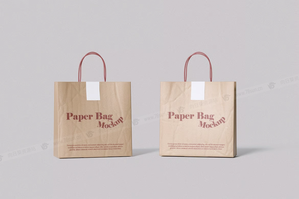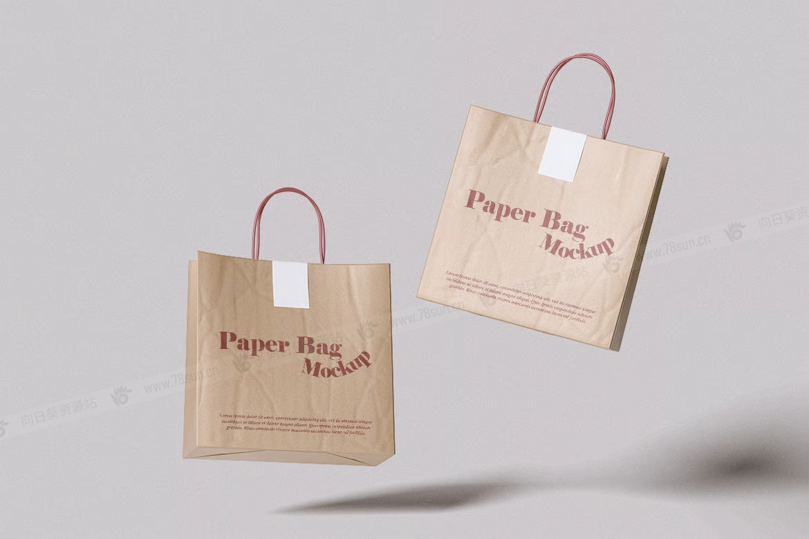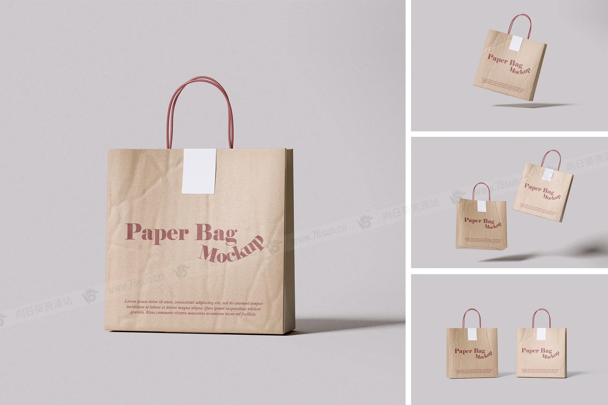 纸质手提袋购物袋品牌VI效果图展示智能贴图psd设计样机。这个模型包含4个带有分层良好的PSD文件,并且还采用了智能对象功能,这意味着你可以在几秒钟内轻松快速地用自己的设计替换当前设计。