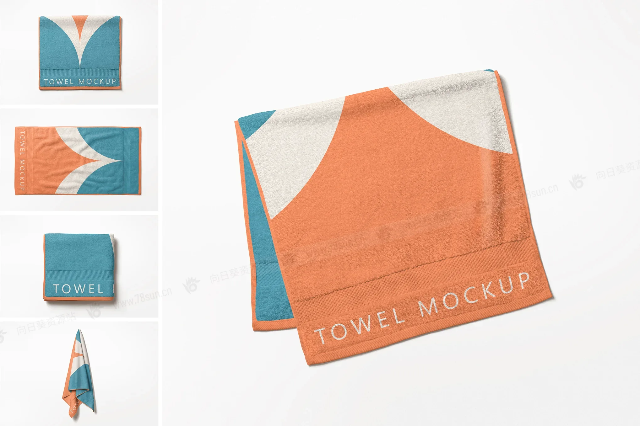 毛巾品牌VI效果图展示智能贴图psd设计样机。这款毛巾模型包含柔软面料质感、逼真的褶皱和简单的自定义选项。