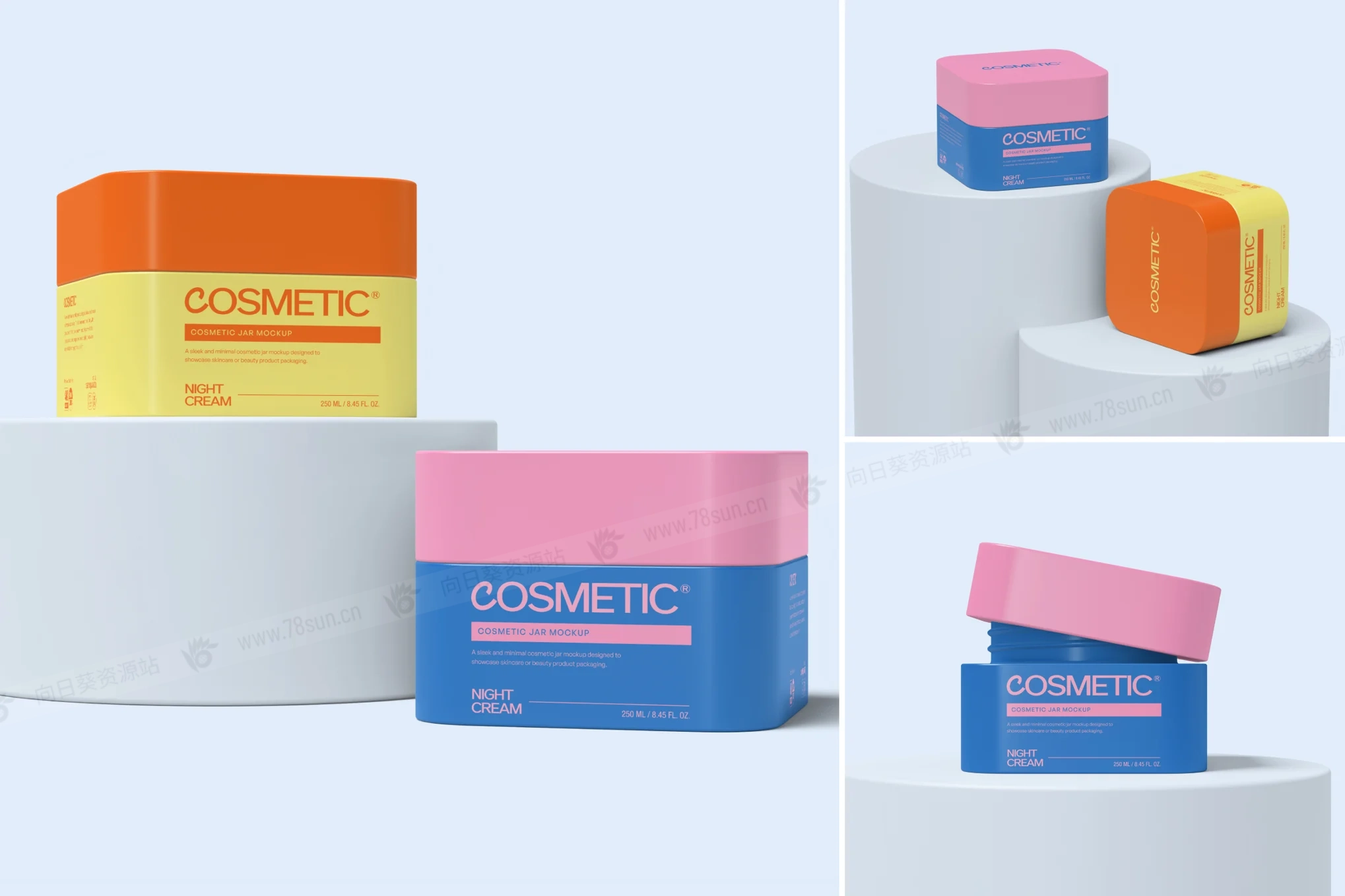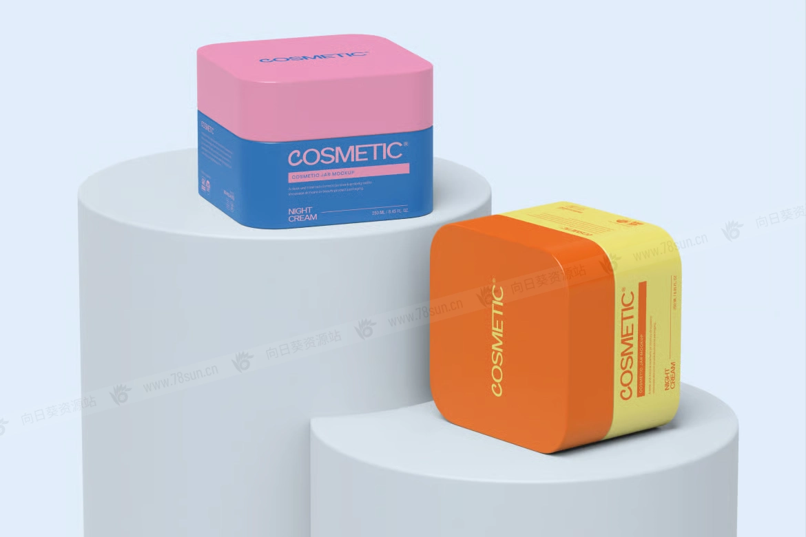 化妆品面霜保湿霜罐塑料罐品牌VI效果图展示智能贴图psd设计样机,智能设备让定制变得轻松。只需几秒钟即可更换设计,调整颜色,精细细节,同时保持自然阴影和高光。