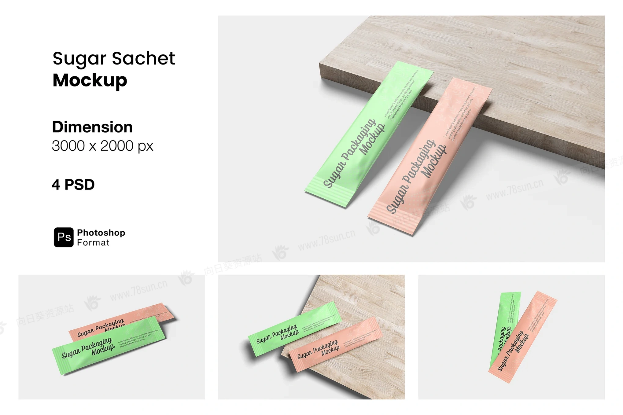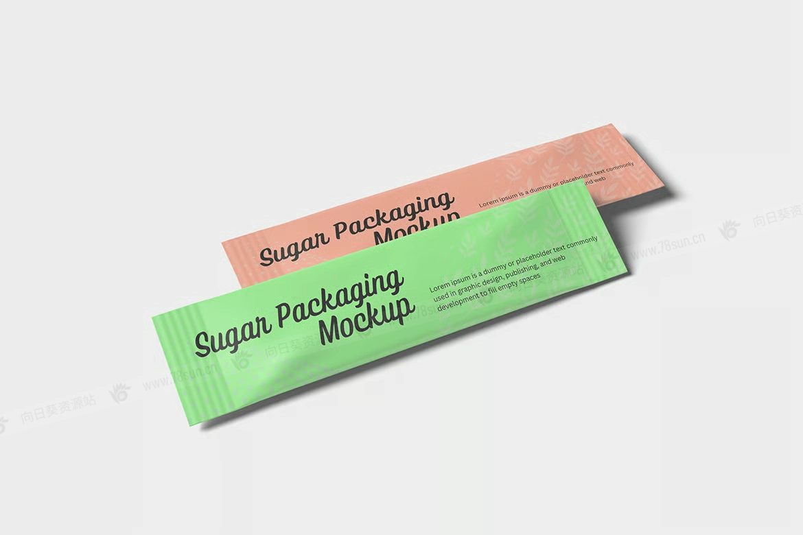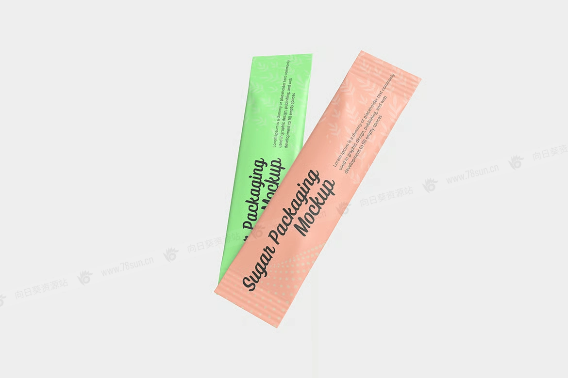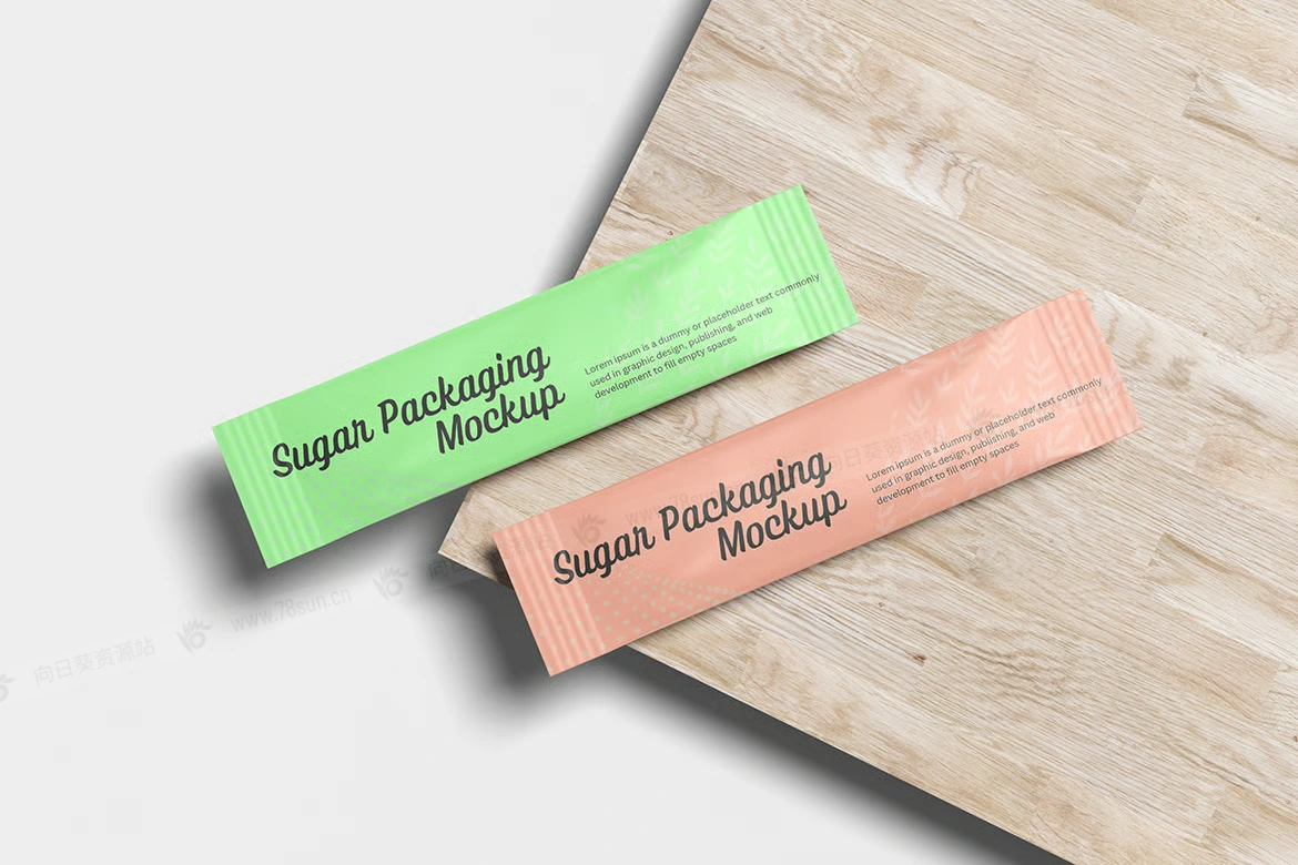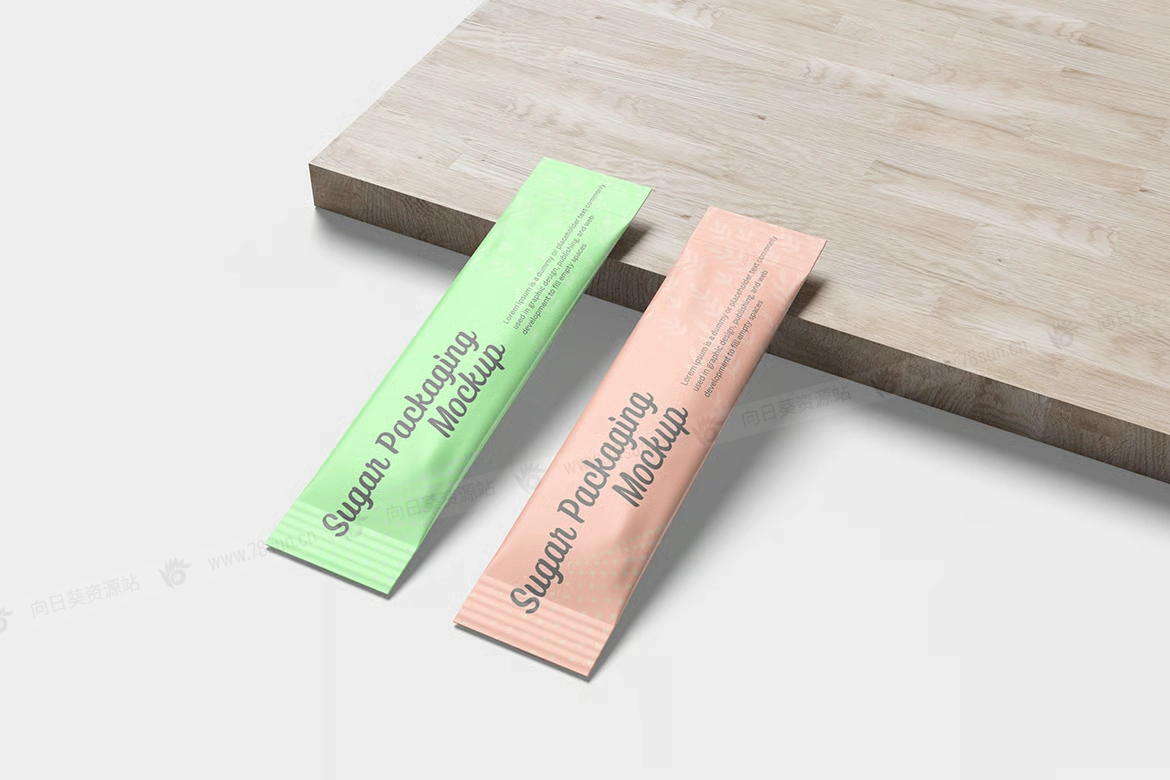 粉末食品包装小袋糖袋品牌VI效果图展示智能贴图psd设计样机,提供PSD Photoshop格式,并配备智能对象功能,帮助你在几秒钟内用自己的设计替换当前设计。