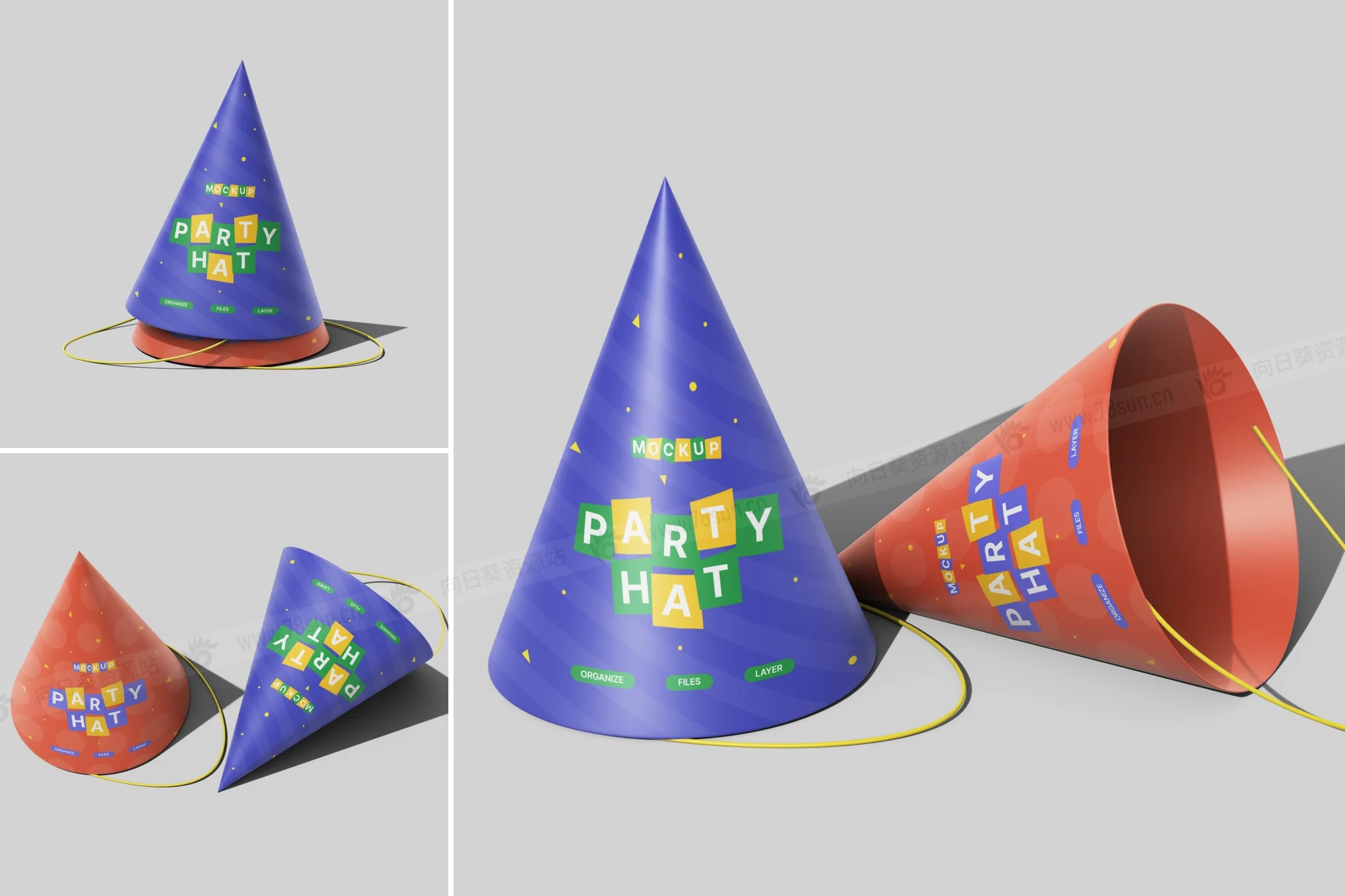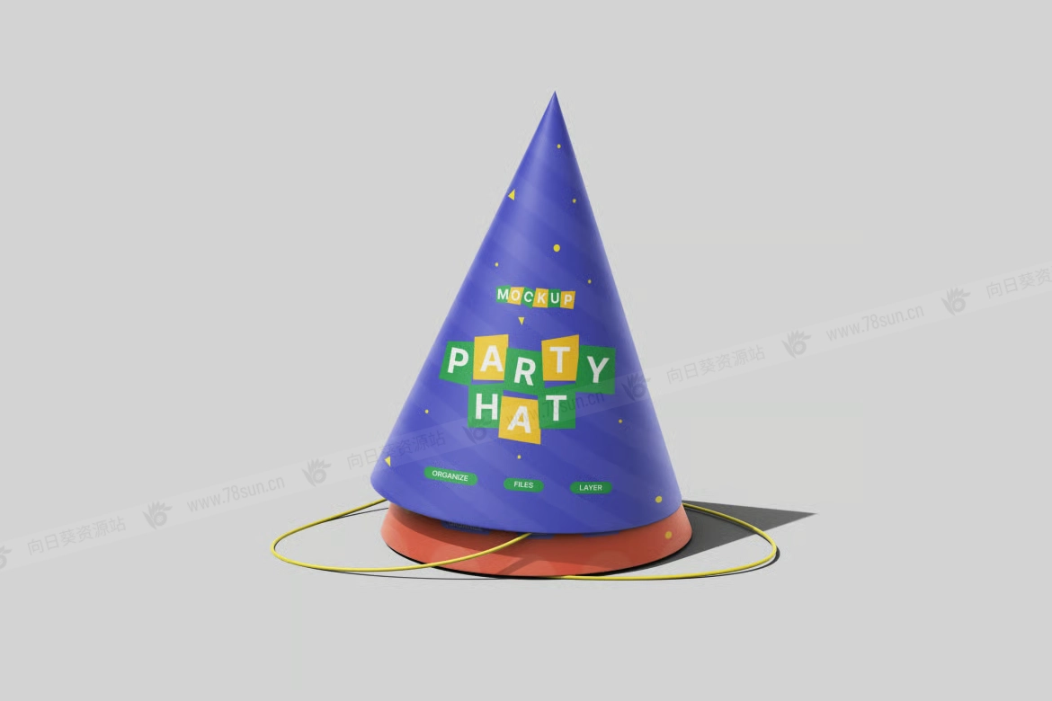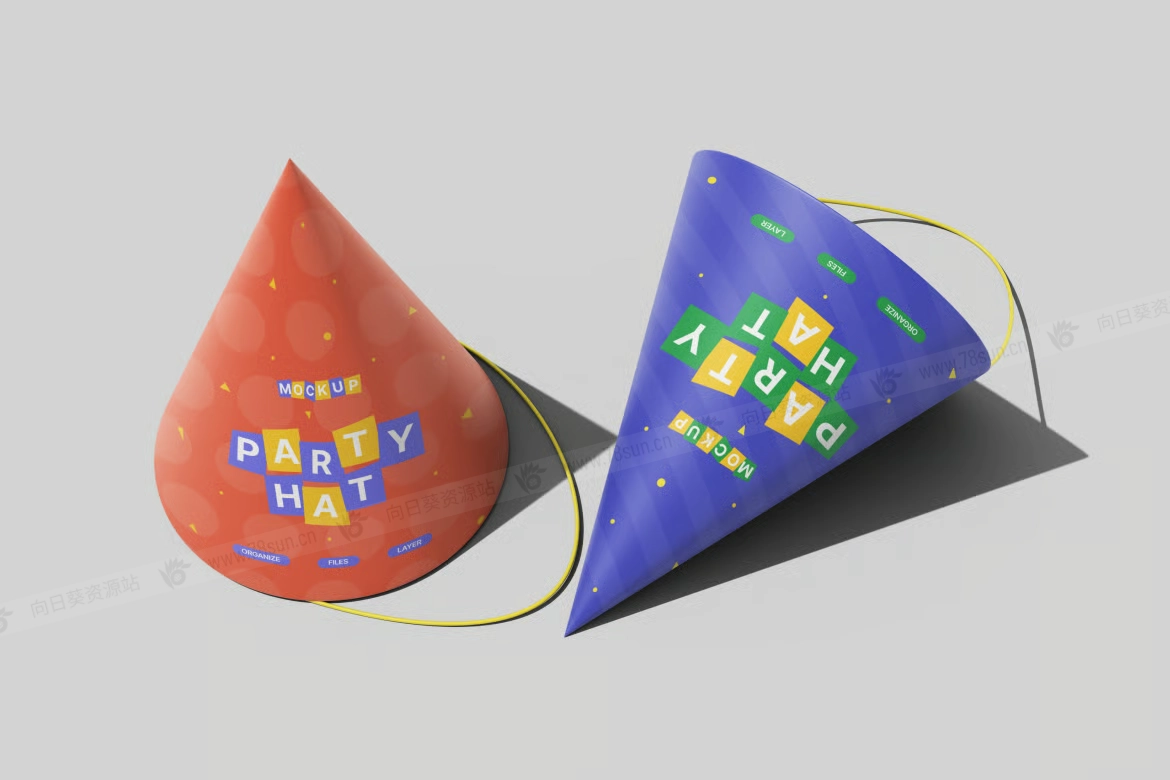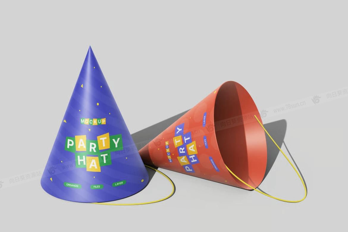 生日派对帽子品牌VI效果图展示智能贴图psd设计样机,设计风格活泼活泼,非常适合生日、儿童活动和节日派对。逼真的锥形、明亮的灯光和细致的阴影营造出真实的视觉效果,完美突显你的艺术作品。凭借易于编辑的智能对象图层和有序的布局,定制设计既快速又轻松。