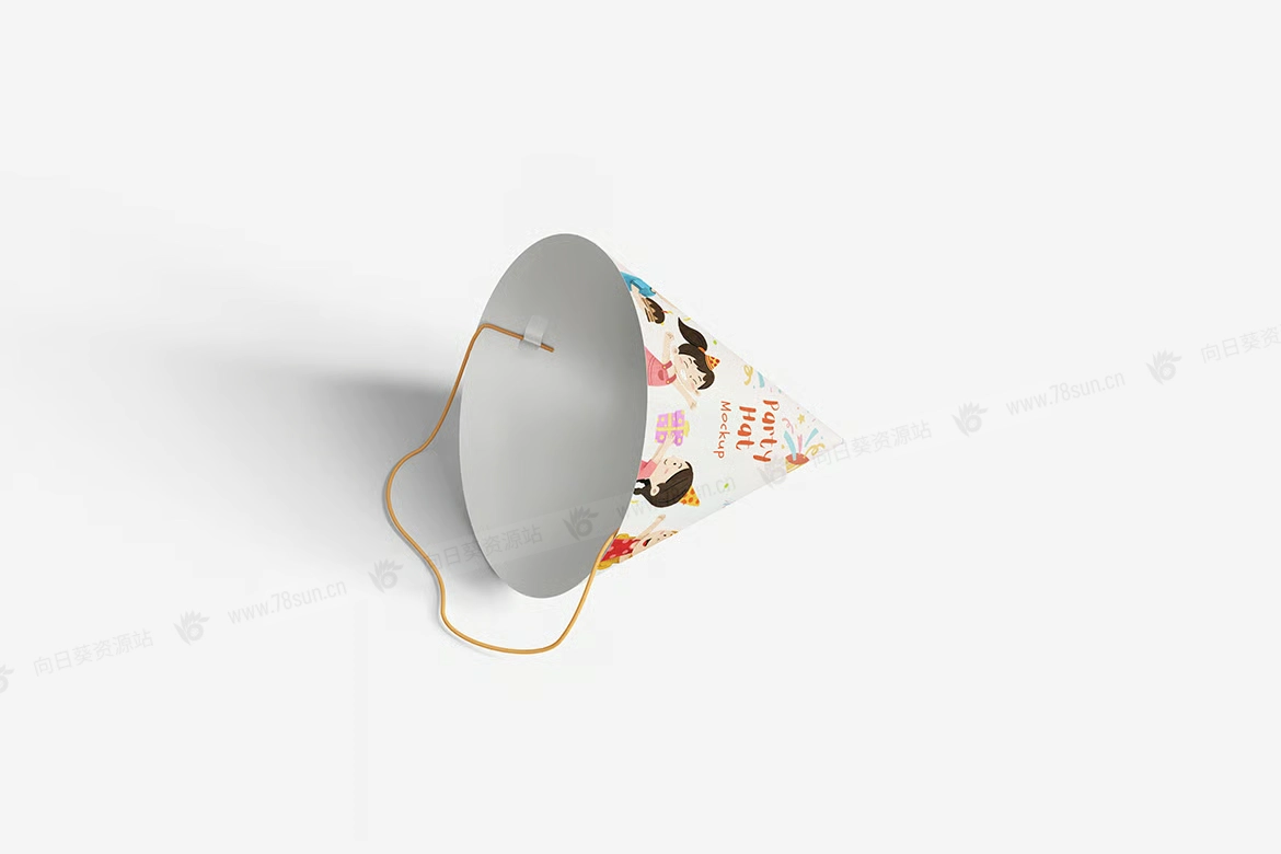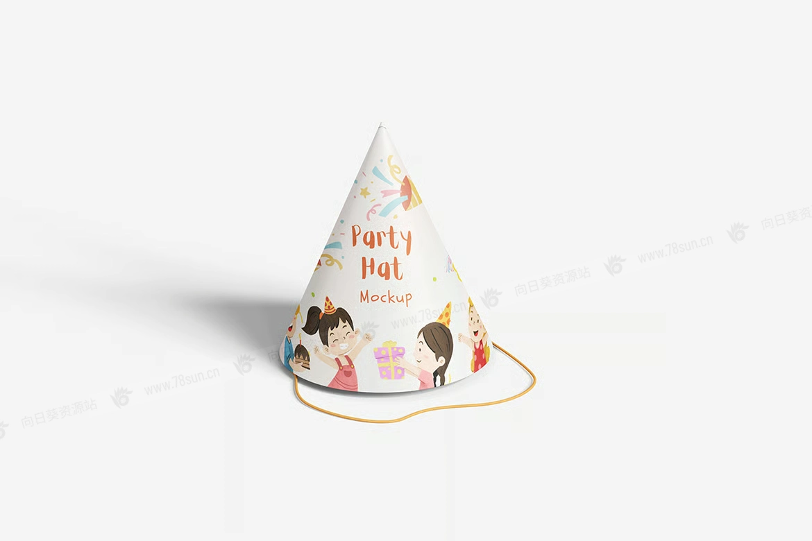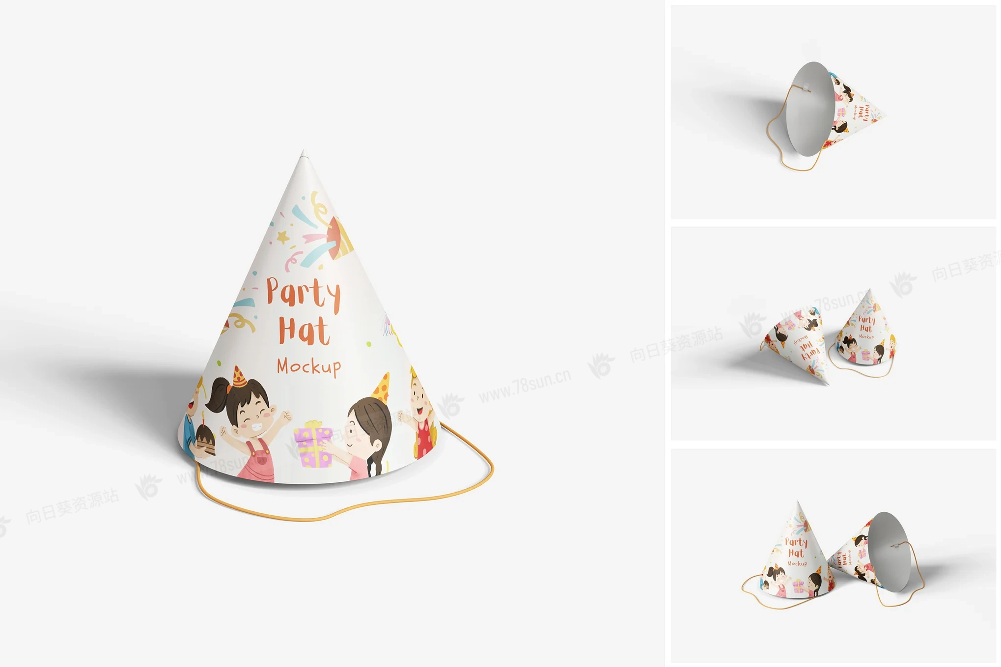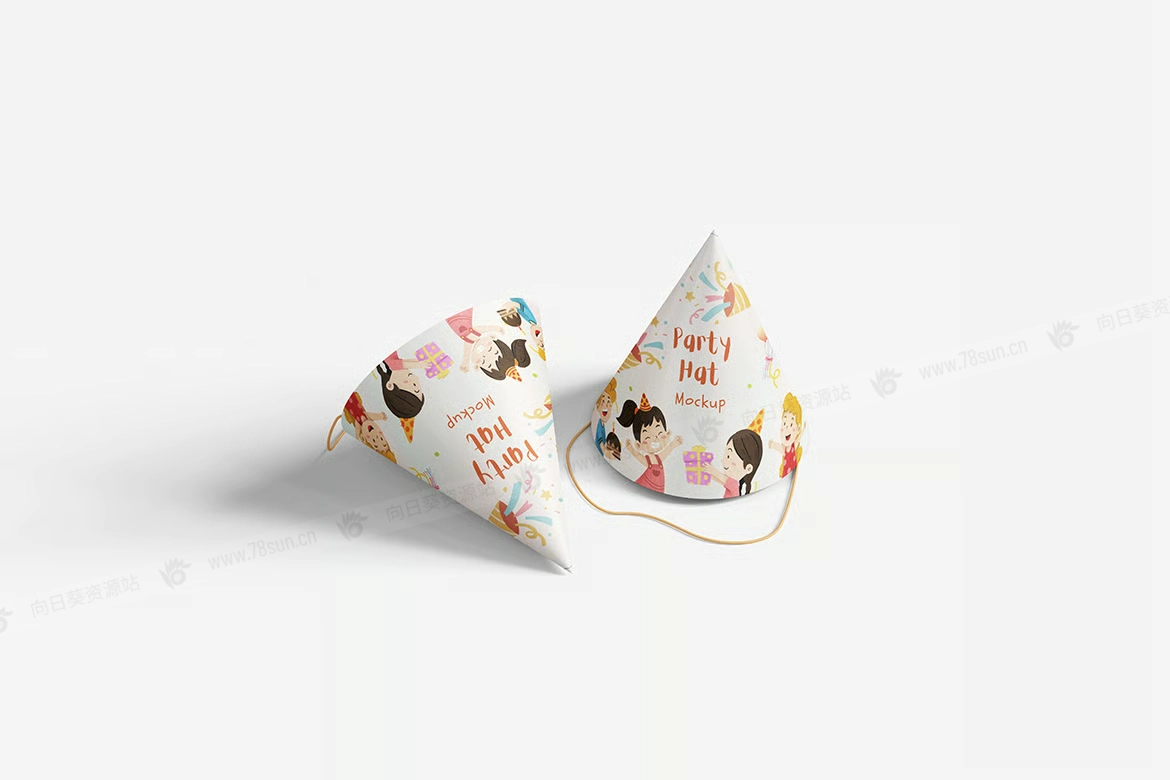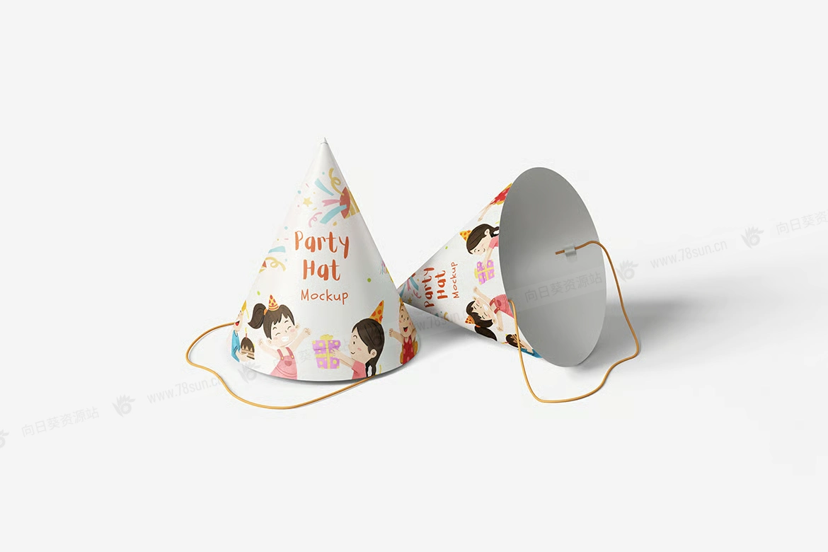生日派对帽子品牌VI效果图展示智能贴图psd设计样机。用智能对象轻松替换你的设计,双击智能图层,复制粘贴你的艺术作品,保存完毕!