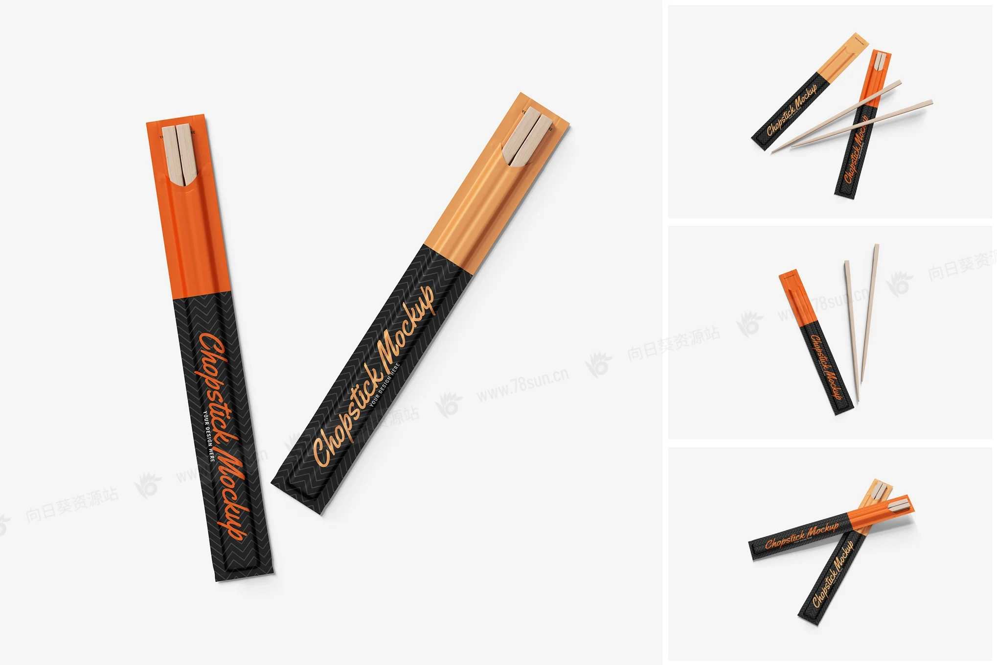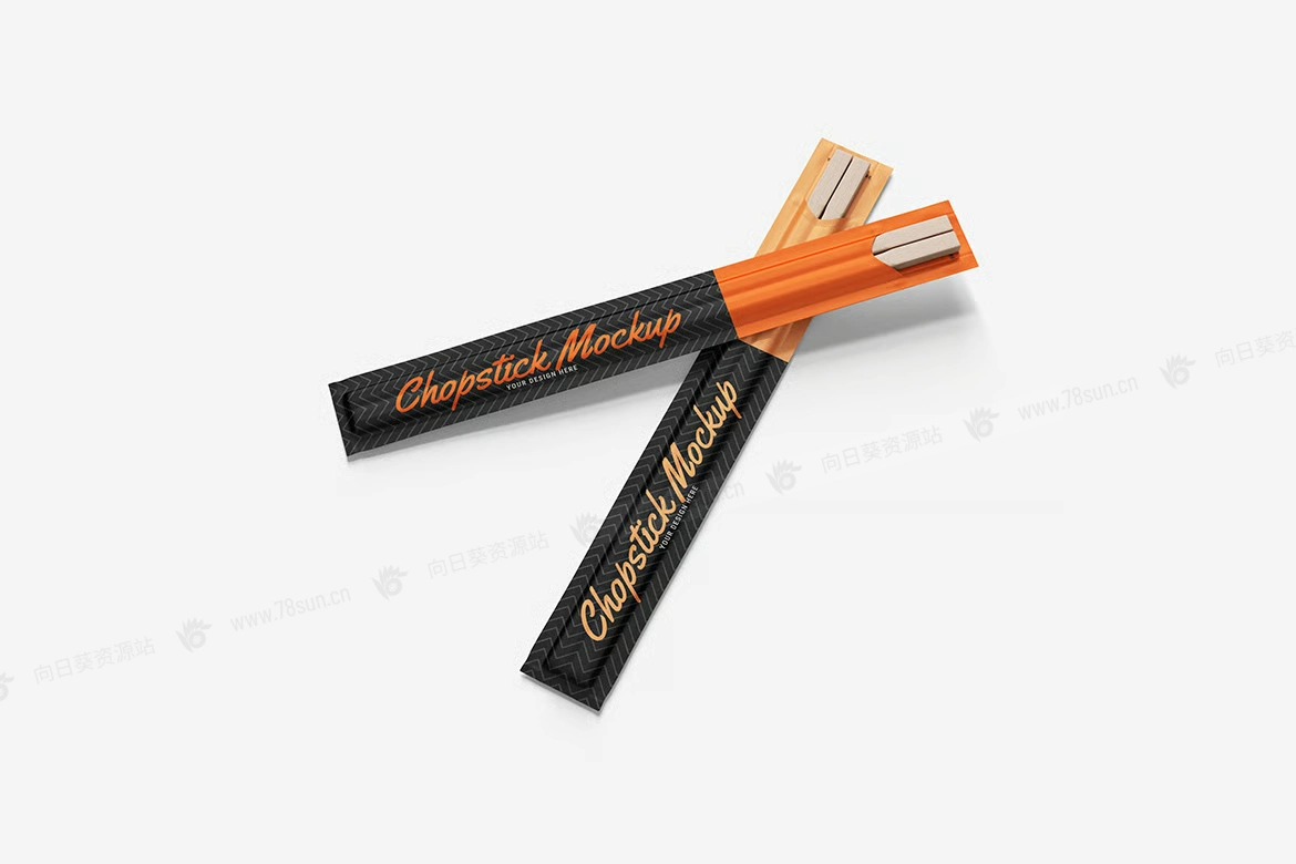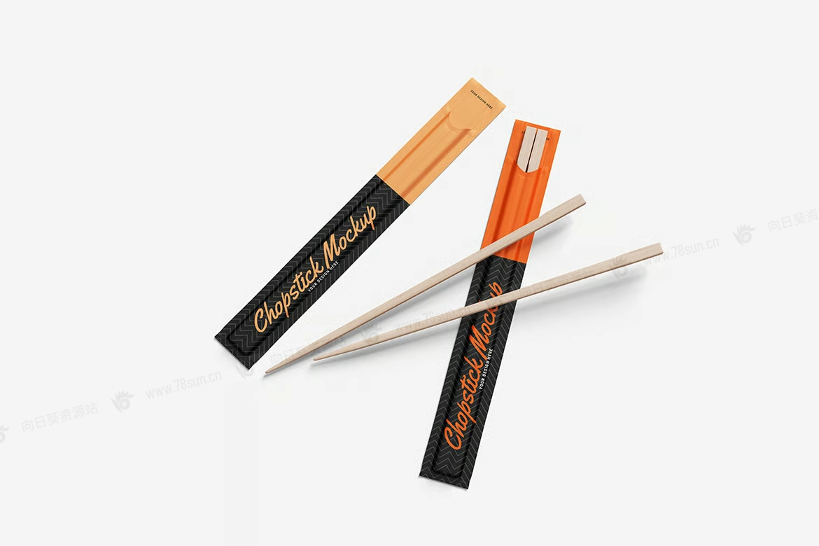筷子包装纸袋品牌VI效果图展示智能贴图psd设计样机。用智能对象轻松替换你的设计,双击智能图层,复制粘贴你的艺术作品,保存完毕!