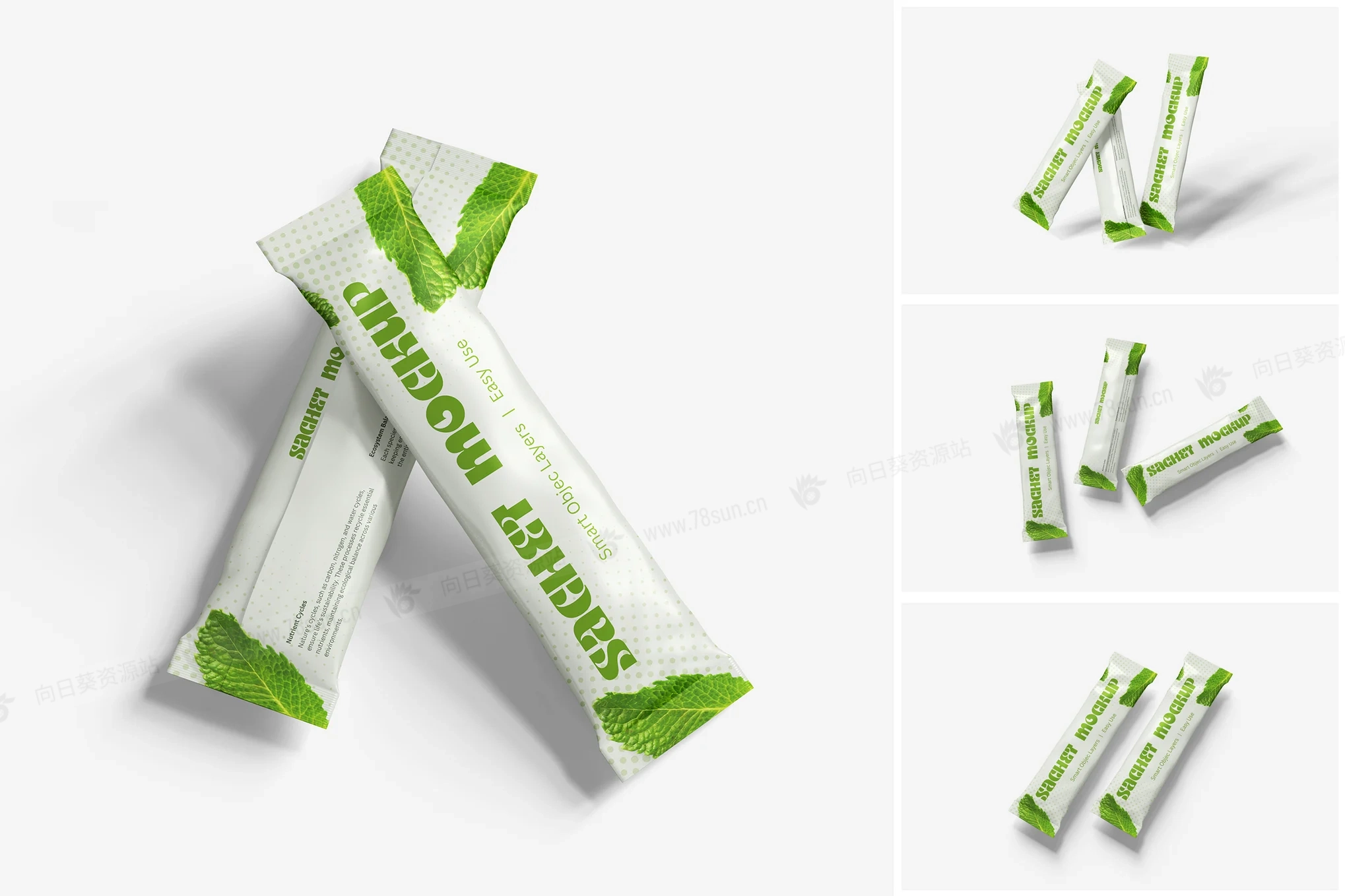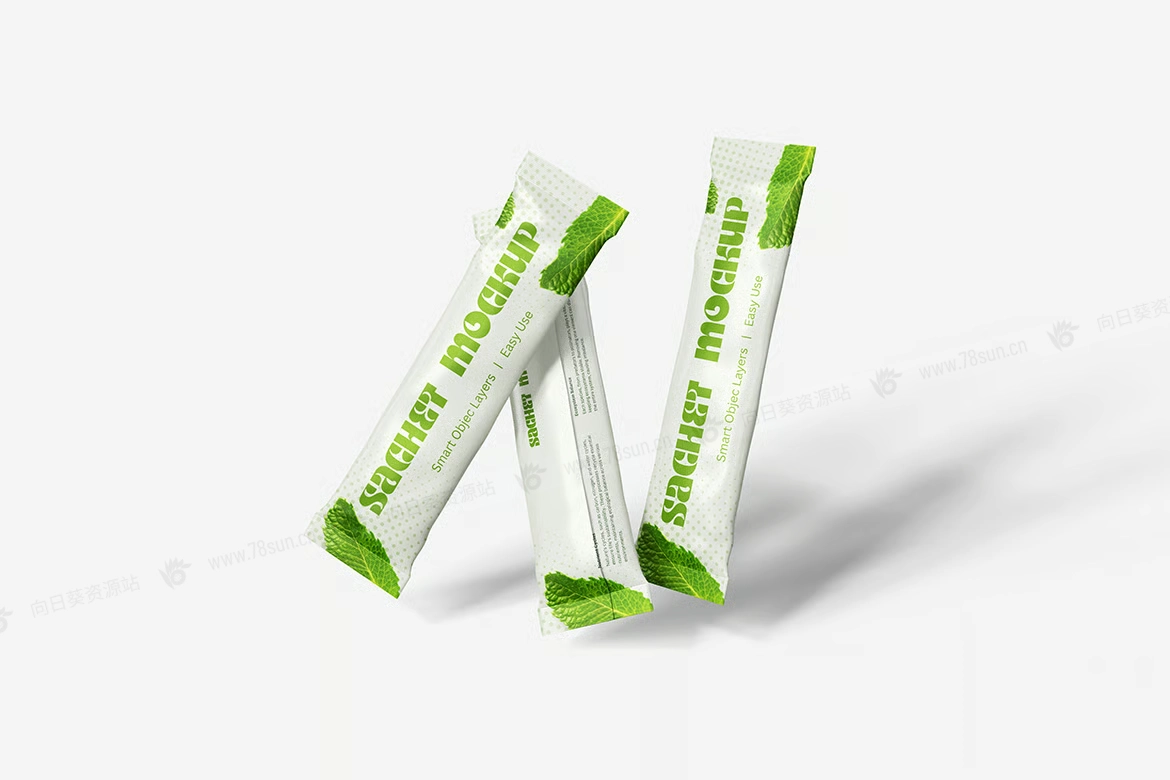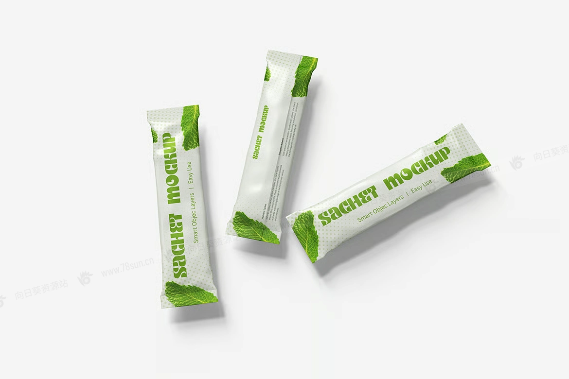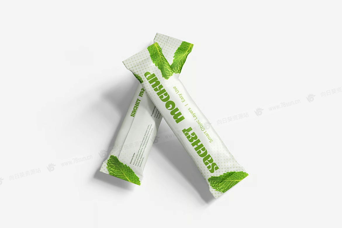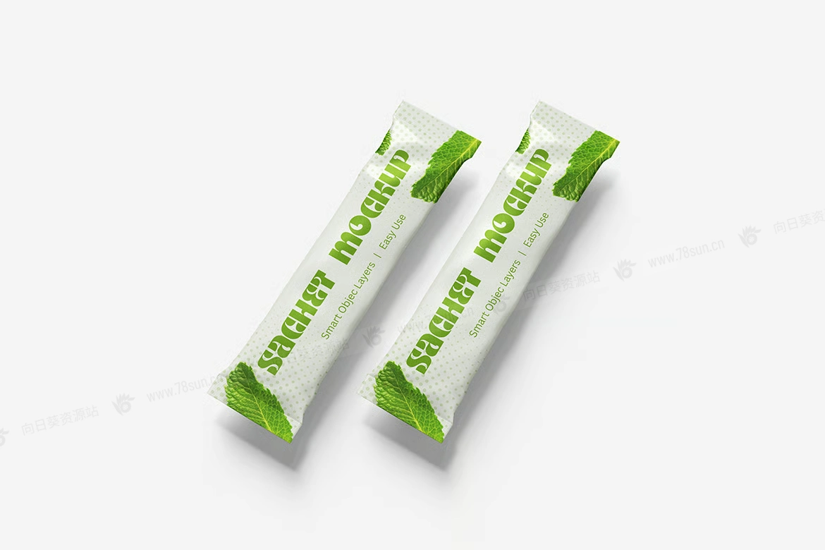 粉末食品饼干包装小袋品牌VI效果图展示智能贴图psd设计样机。用智能对象轻松替换你的设计,双击智能图层,复制粘贴你的艺术作品,保存完毕!