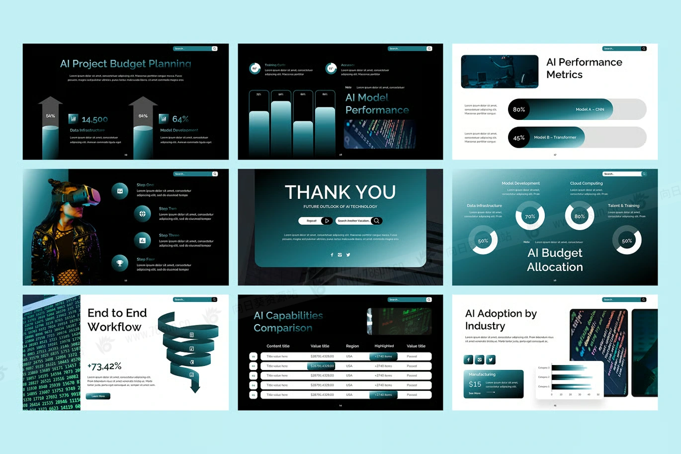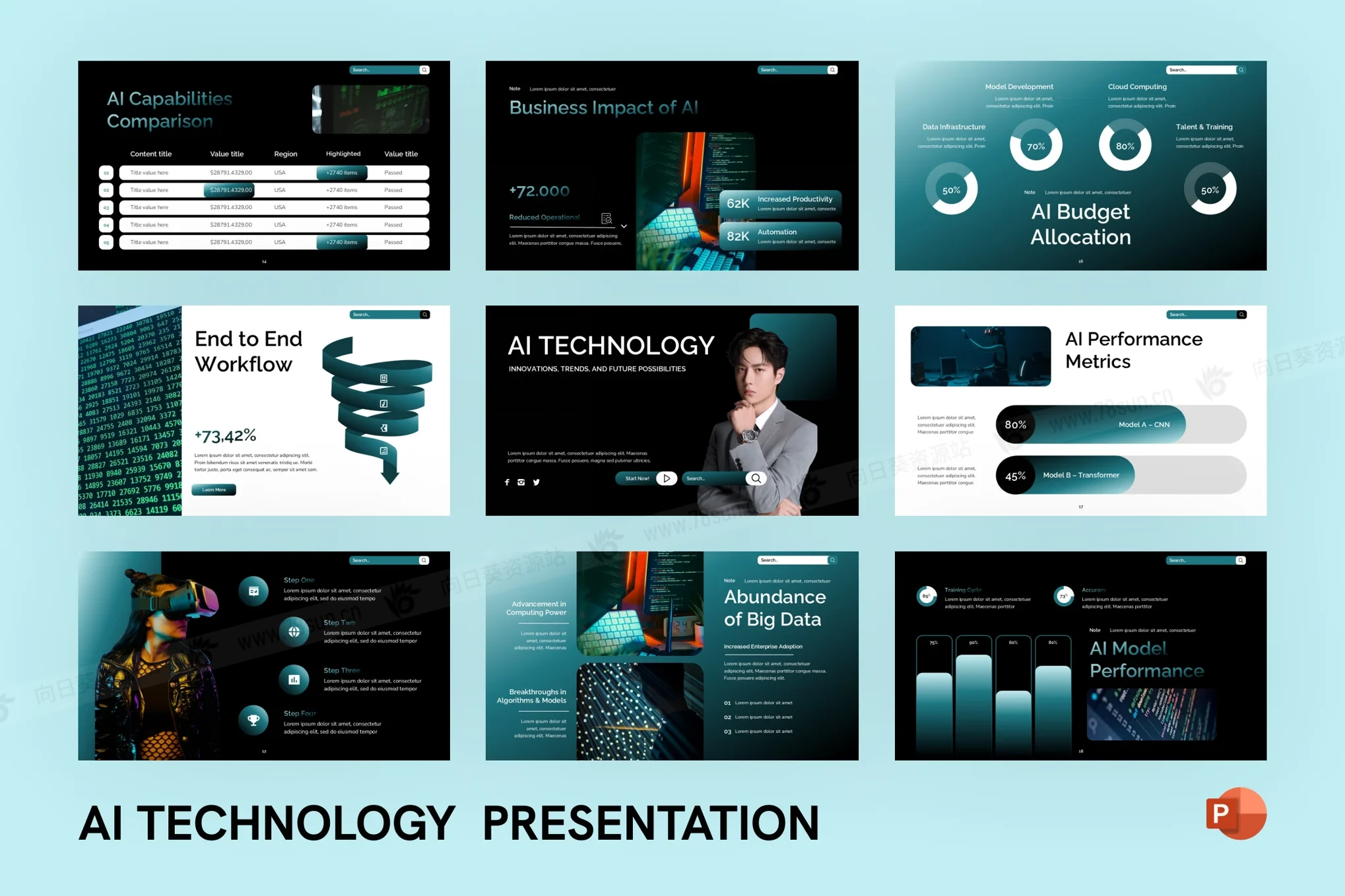 高科技数据信息图表统计人工智能演示PowerPoint幻灯片模板,清晰且权威地展示智能系统、数据驱动创新和面向未来的解决方案。简洁的排版、科技灵感的图形、图表和数据可视化,每张幻灯片都支持神经网络、模型工作流程、决策流程、关键绩效指标(KPI)和实时分析的展示。