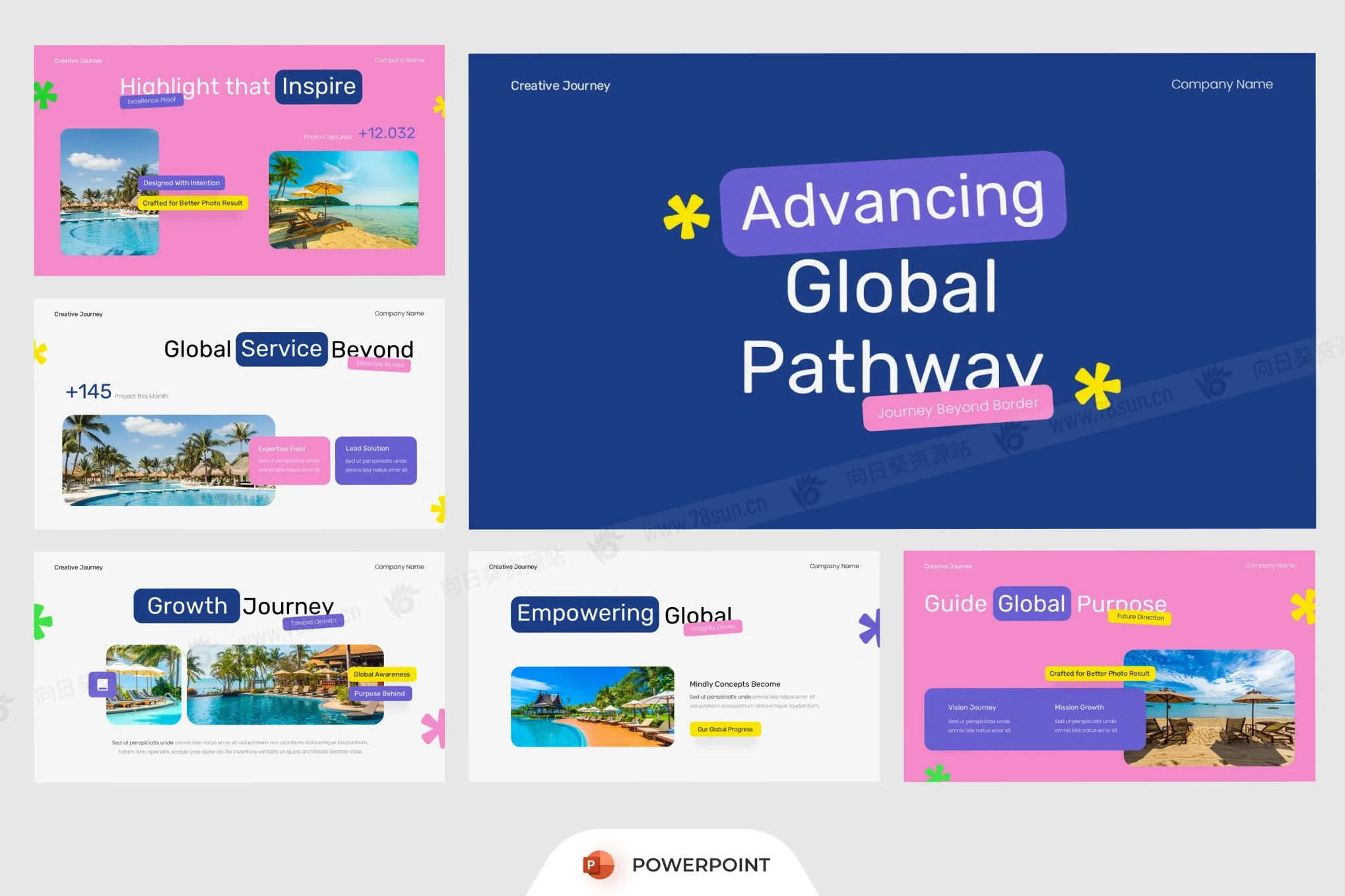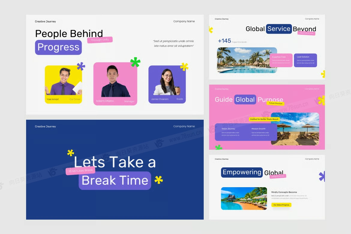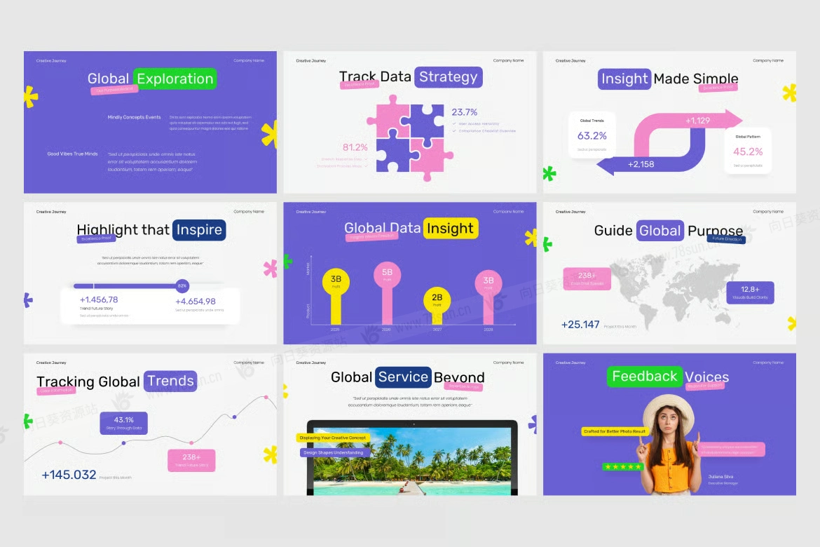 旅游旅行社摄影作品集演示PowerPoint幻灯片模板。该模板采用大胆色彩、俏皮的排版和照片占位符,非常适合展示公司进展、数据洞察、全球拓展和团队参与度。非常适合旅游、创意产业、全球企业和数字营销活动。