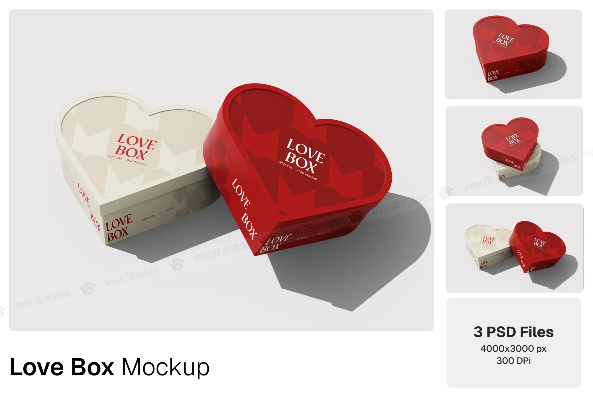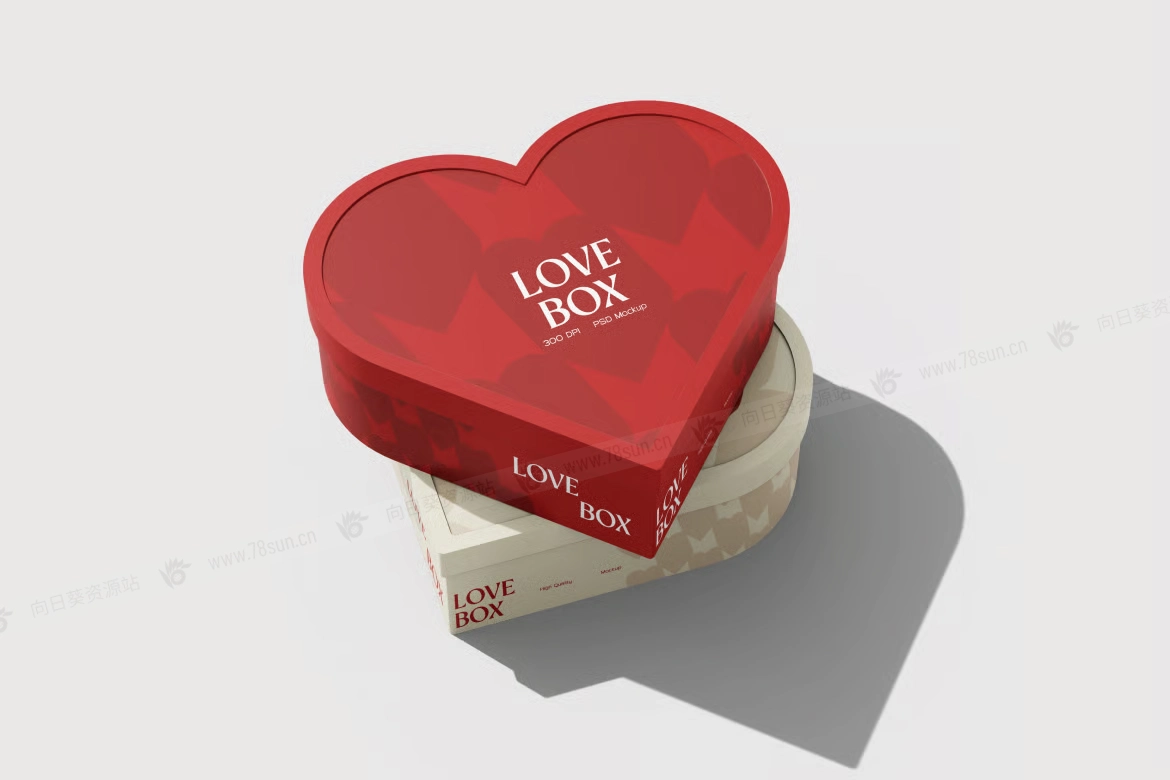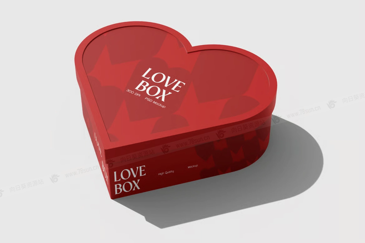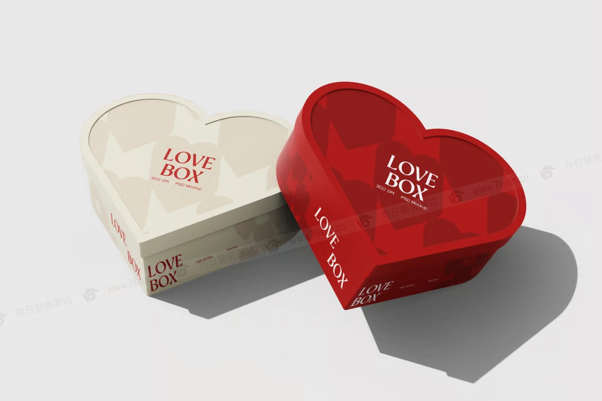 情人节爱心礼品盒品牌VI效果图展示智能贴图psd设计样机。盒子采用一个平滑弯曲的心形轮廓,配有贴合的盖子,并以多个角度展示,以突出深度、边缘和逼真的阴影。该模型以高分辨率PSD文件形式提供,配有智能对象图层,便于轻松定制艺术作品、颜色和品牌,
