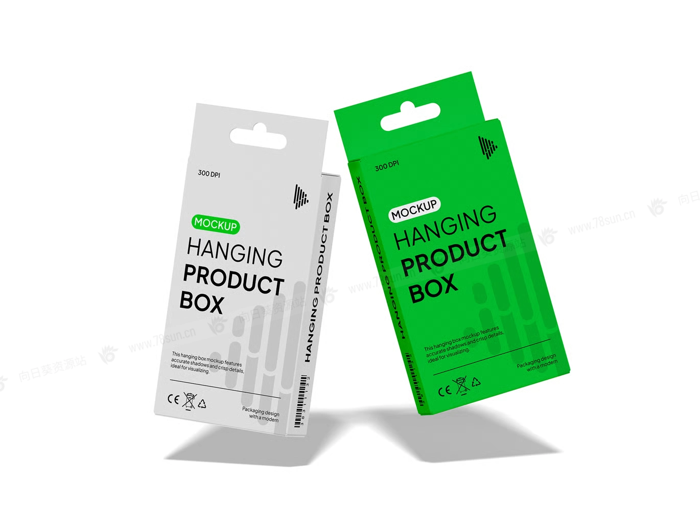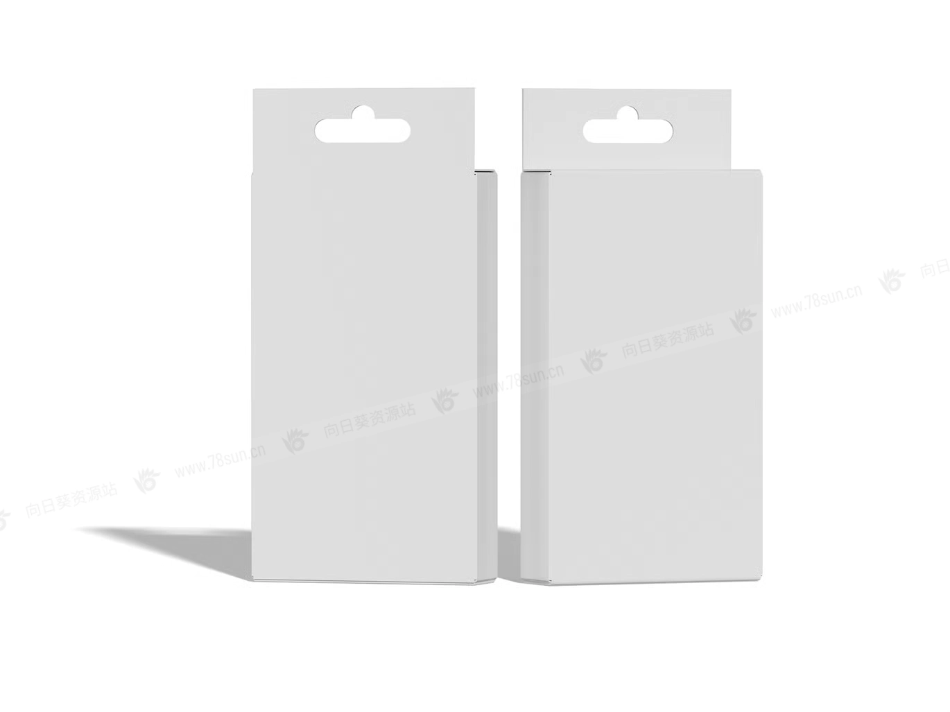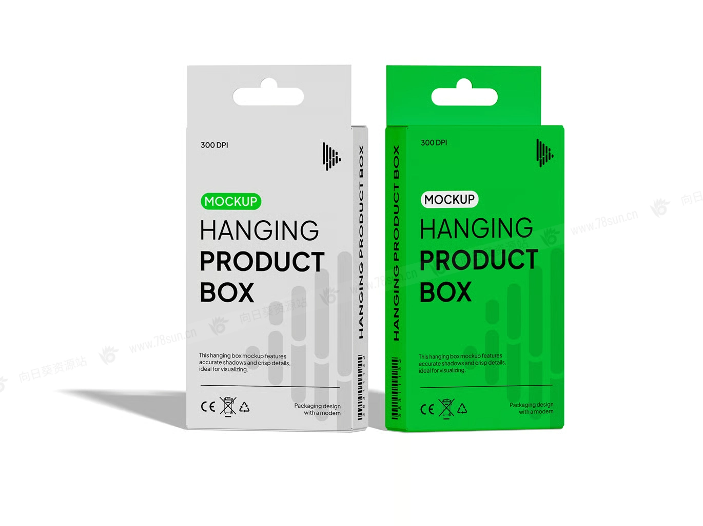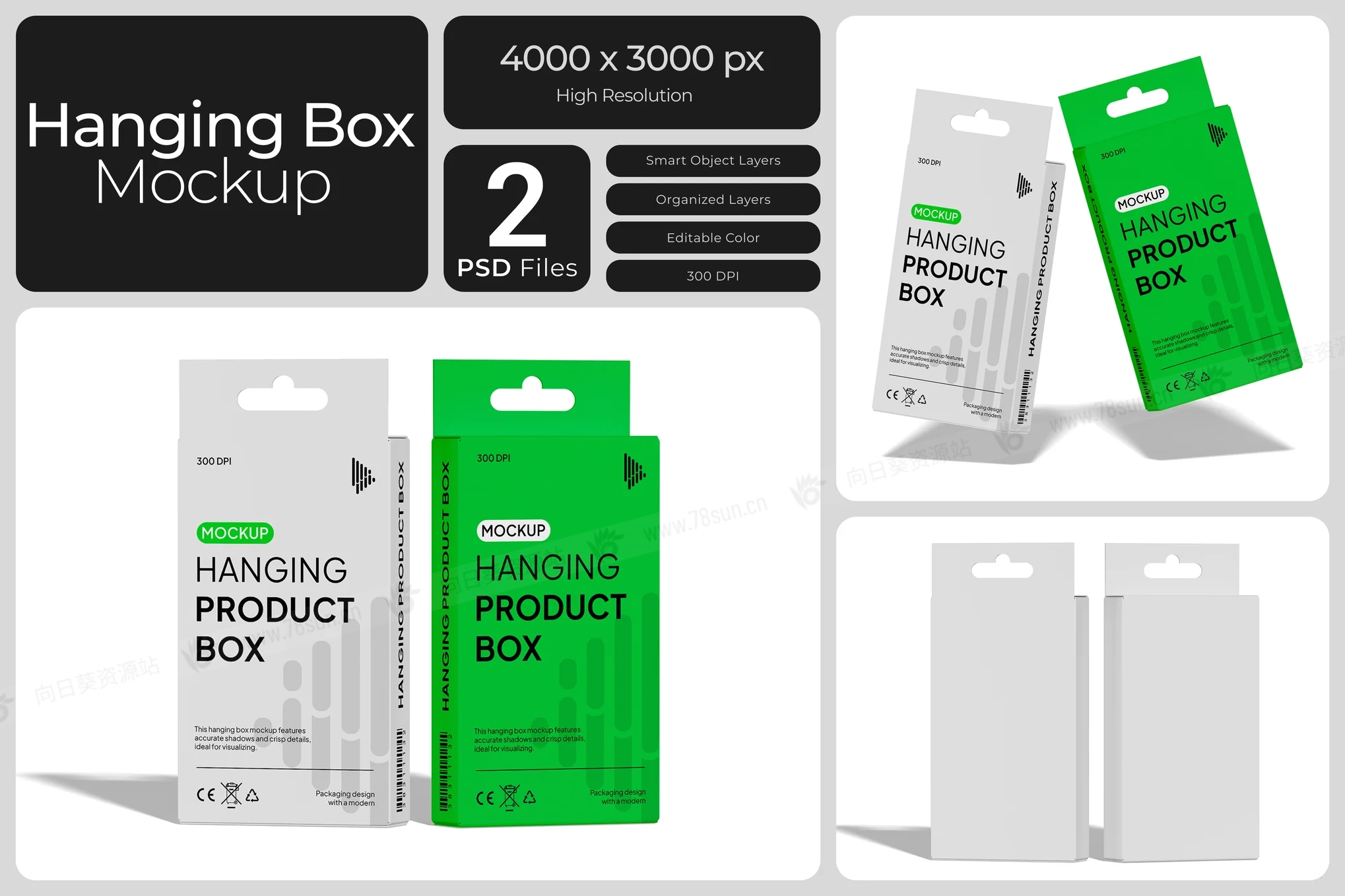吊箱带挂钩悬挂纸盒品牌VI效果图展示智能贴图psd设计样机,采用正面悬挂纸盒,配有可编辑的挂钩和模具切割选项。轻松添加你的艺术作品,并调整背景或包装颜色以符合你的主题。