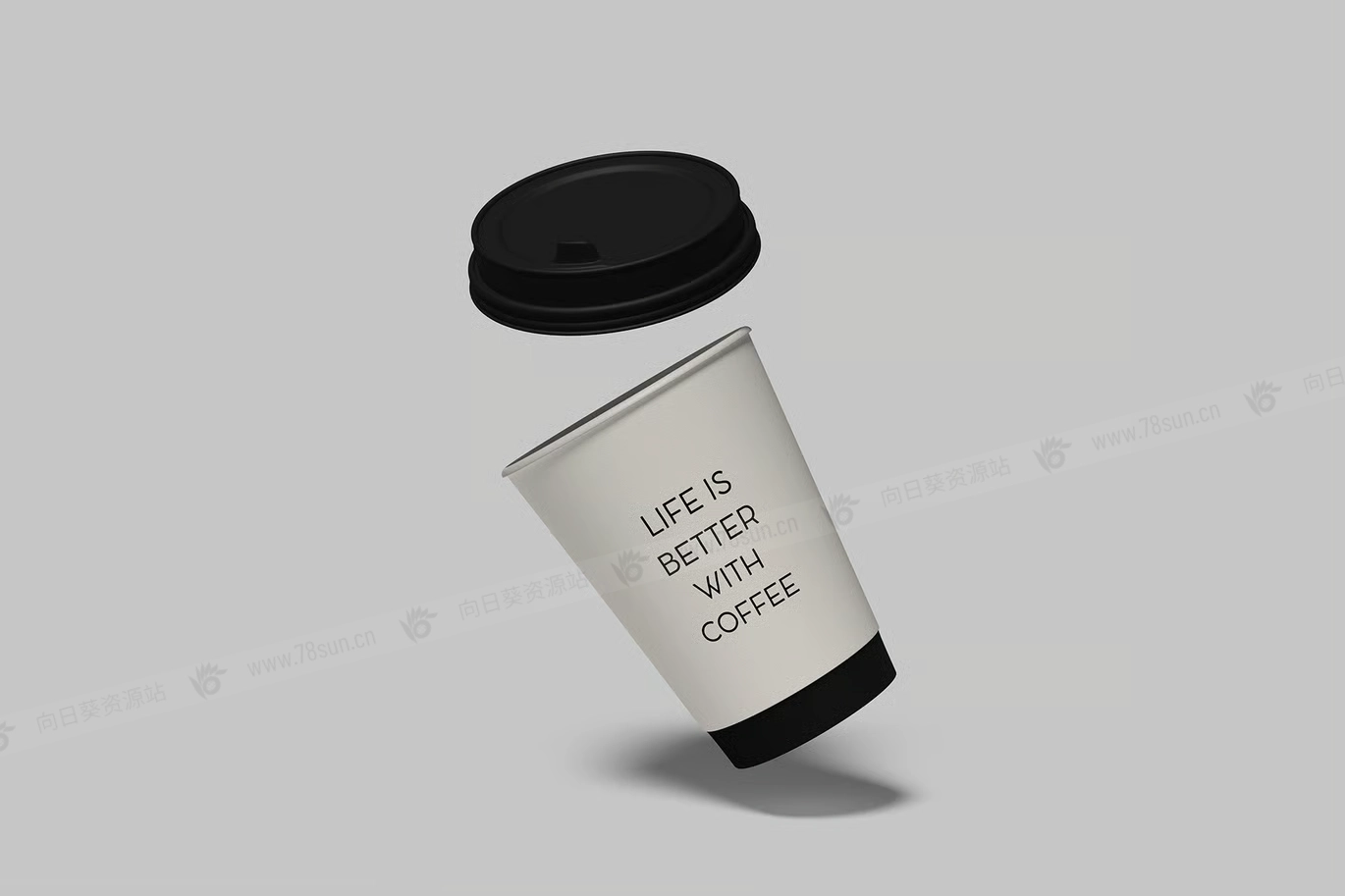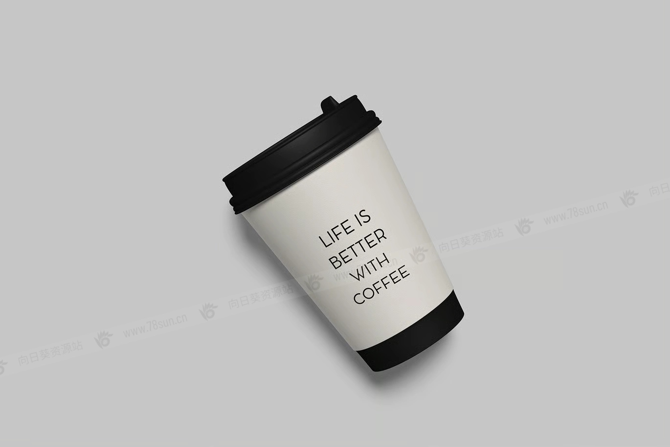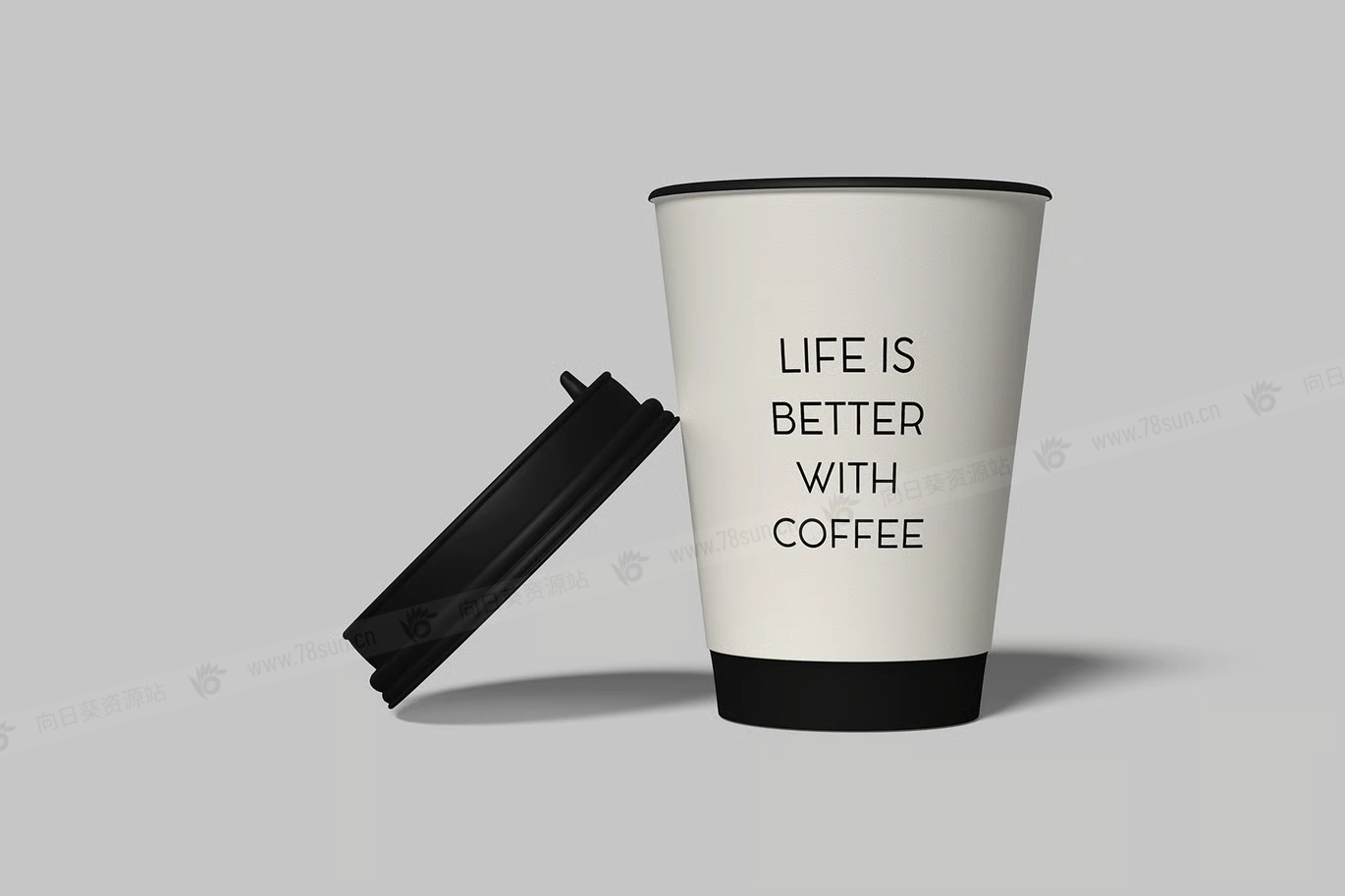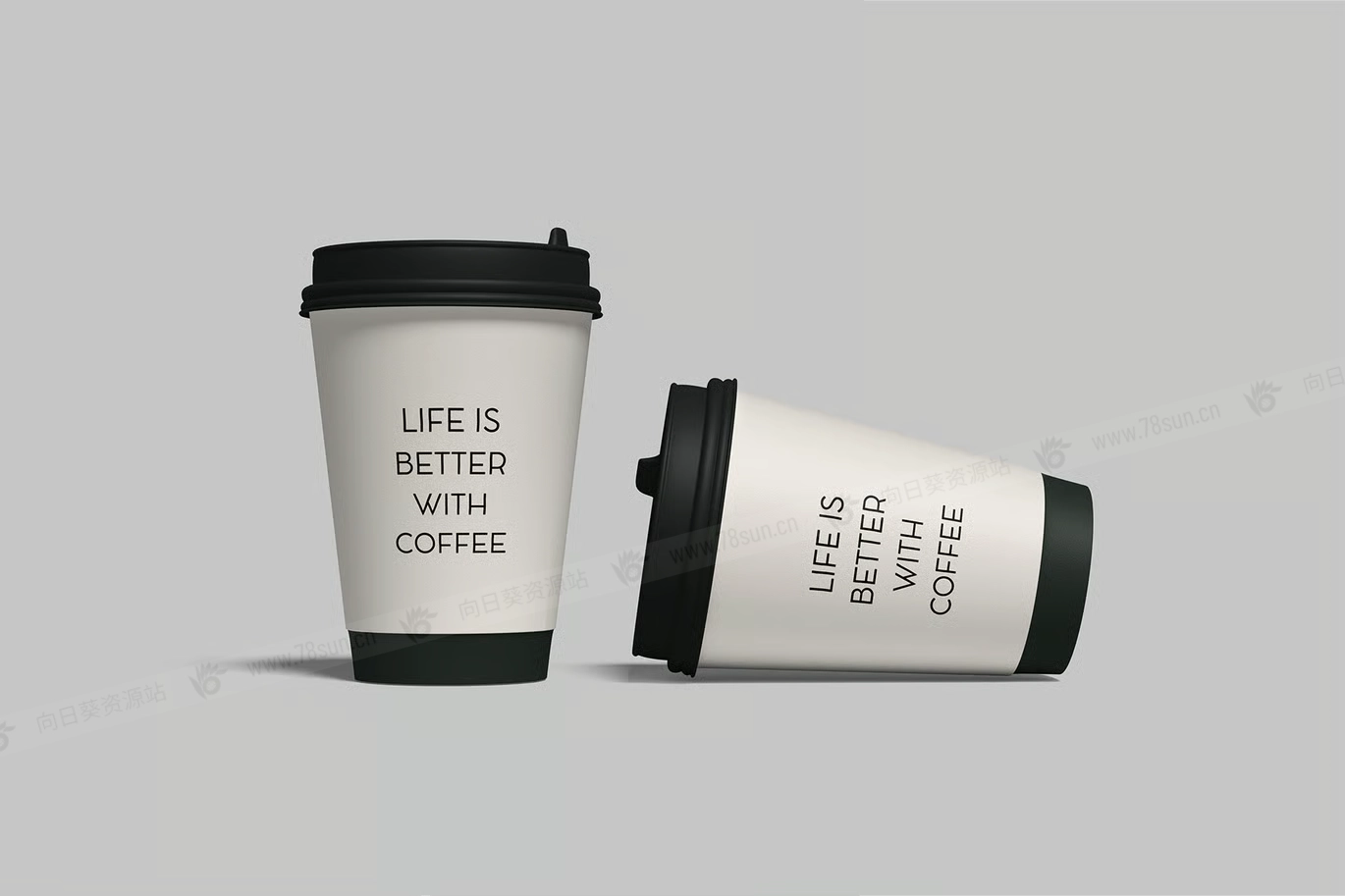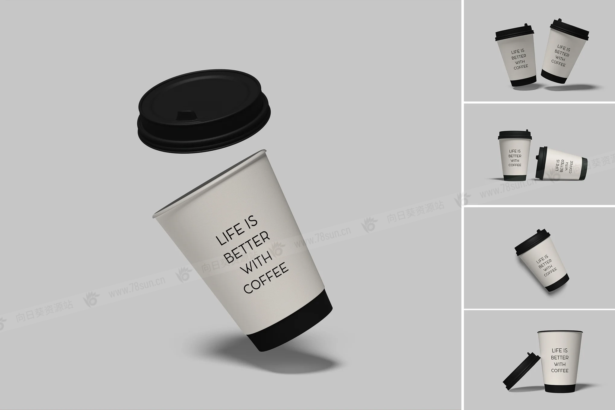 咖啡杯纸杯品牌VI效果图展示智能贴图psd设计样机,这个模型包含5个带有分层良好的PSD文件,并且还采用了智能对象功能,这意味着你可以在几秒钟内轻松快速地用自己的设计替换当前设计。