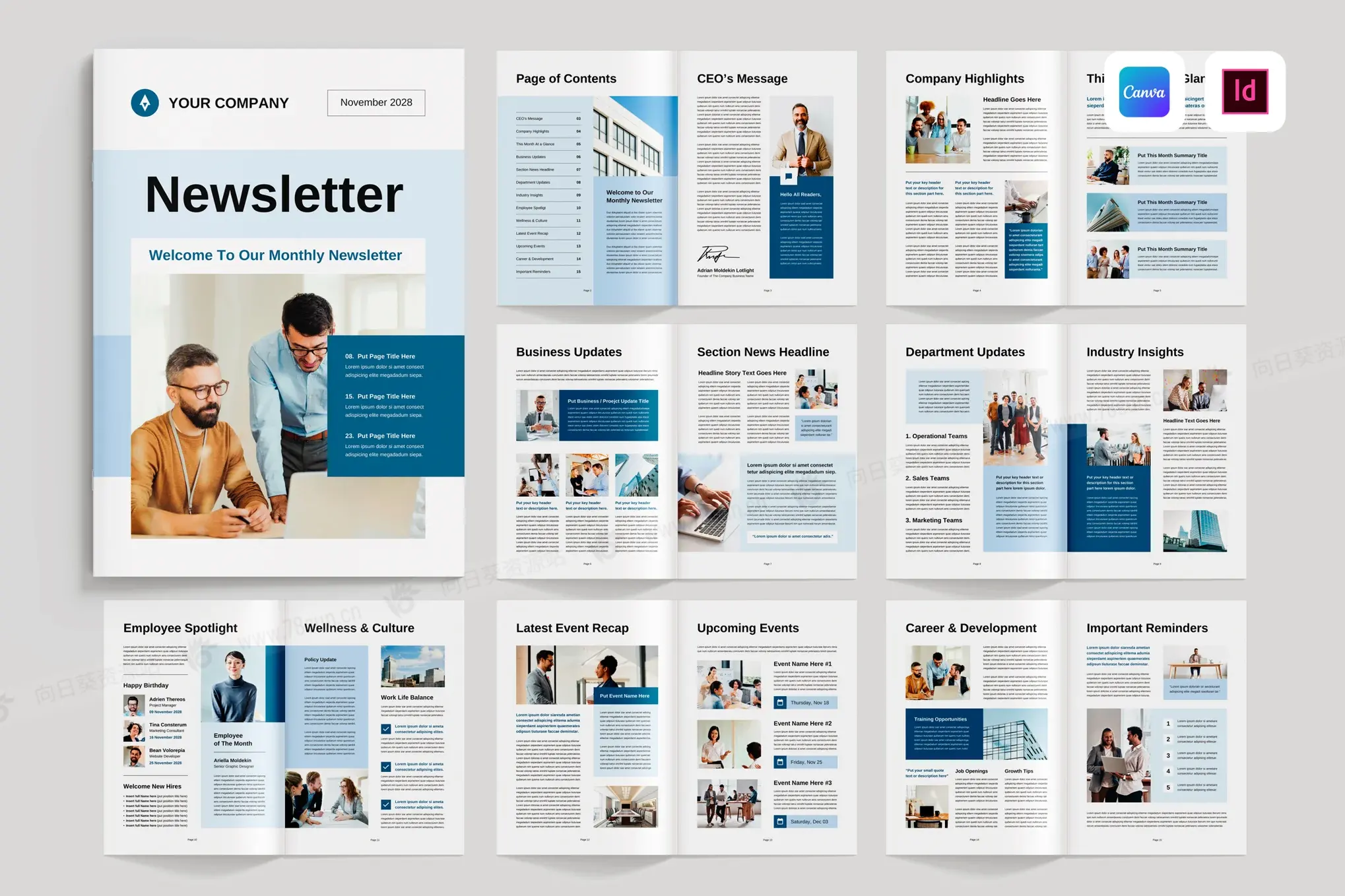 • 本文档仅可在Canva和Adobe InDesign中编辑。它在Pages、Google Docs、Adobe Photoshop或其他程序中无法使用。请在编辑此项前确保您使用了合适的软件。