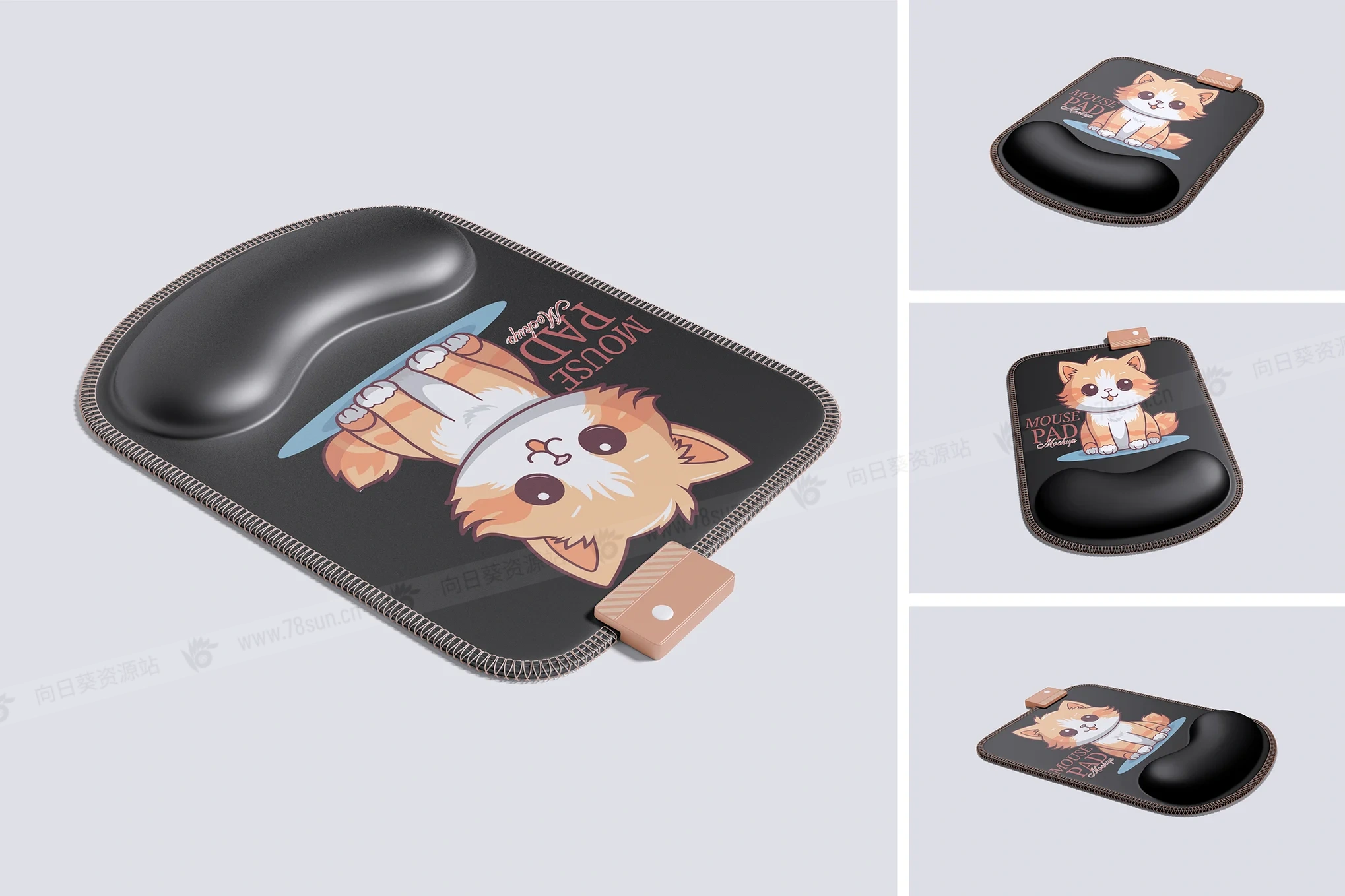 鼠标垫品牌VI效果图展示智能贴图psd设计样机,这个模型包含4个物品,带有分层良好的PSD文件,并且还采用了智能对象功能,这意味着你可以在几秒钟内轻松快速地用自己的设计替换当前设计。